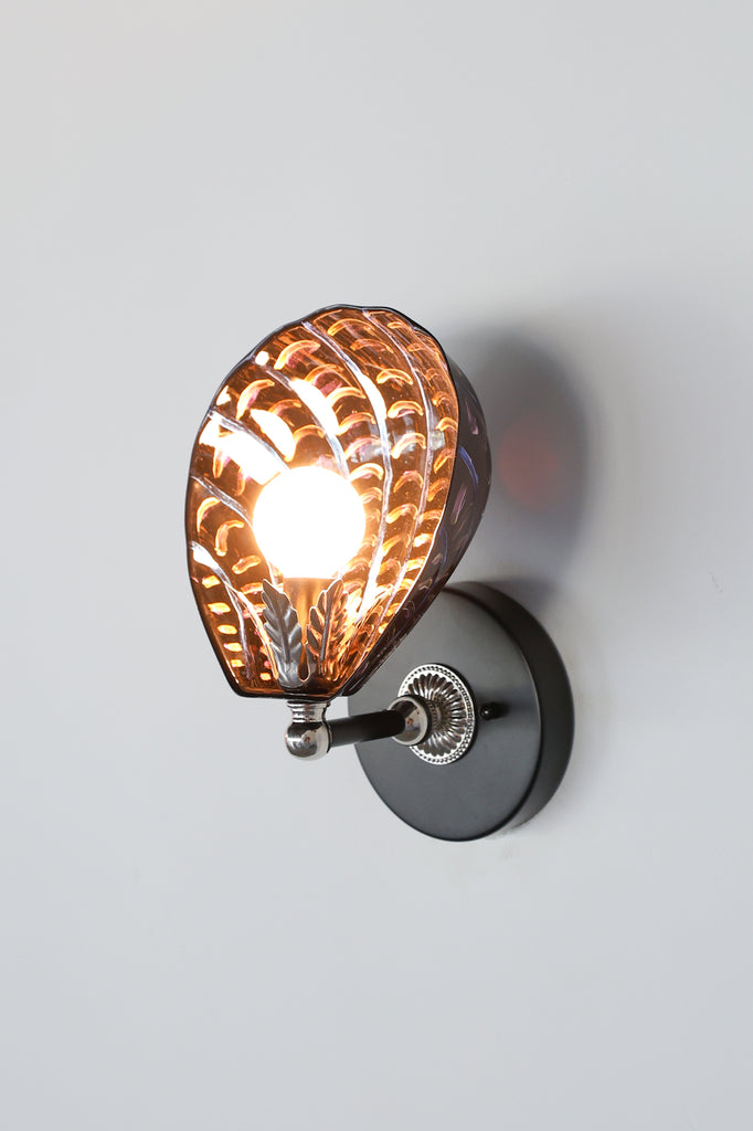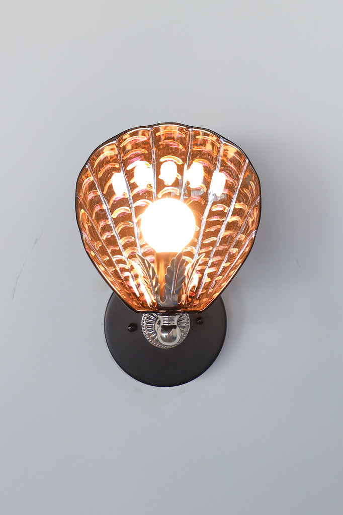 A one-of-a-kind twist on our bestselling Coquille Sconce, this sculptural shell-shaped wall light features hand-painted details that shimmer and shift in the light—deep inky black layered with iridescent tones of violet, copper, and electric blue. Instead of our usual brass accents, this version uses silver-toned hardware and a vintage-inspired cast silver leaf holder, making it feel even more like a one-off art piece than a production fixture.