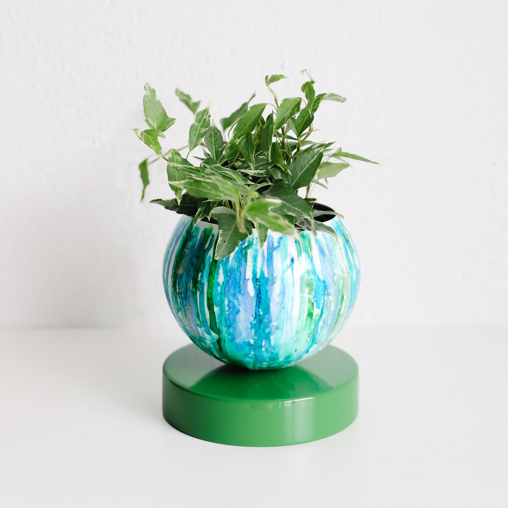 A modern, minimal planter with a hand-painted watercolor pattern in shades of blue, green, & teal on a spring green base. The hand painted finish has been sealed with clear powdercoating. Due to the unique nature of painting, no two planters are alike.