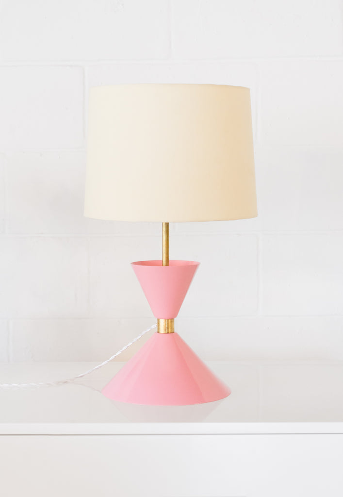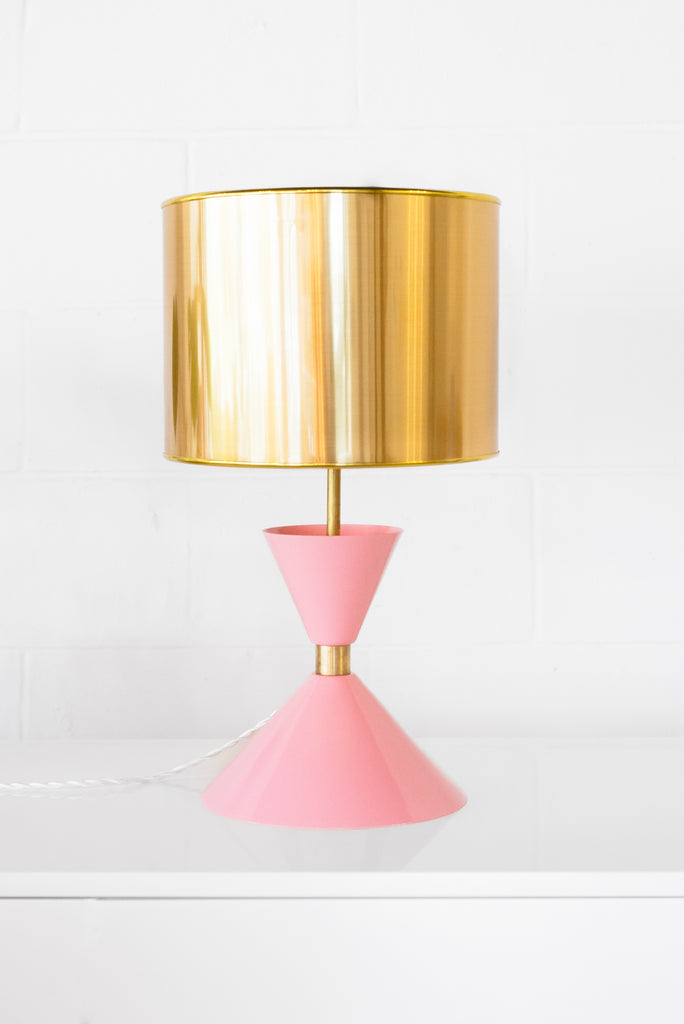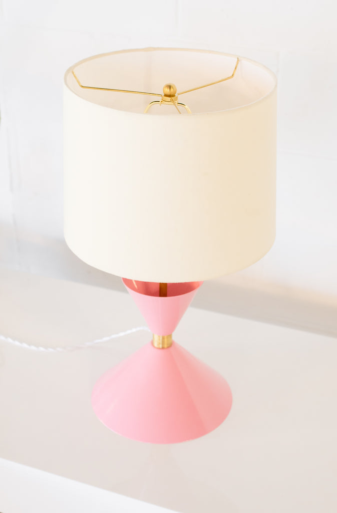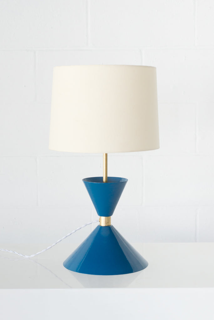 Drawing inspiration from masculine mad-men style from mid century design, w added a table lamp to our Clancy collection. The table lamp can be customized in any of our powdercoating colors, whether you'd like it all one color or colorblocked. Any raw brass on the fixture will develop a patina over time or can be polished occasionally to retain it's beautiful brassy sheen. The cord has an in-line toggle switch, not a dimmer. We styled this lamp with shades measuring approximately 12" diameter and 10" height. If you don't see a color listed in the drop down menu, contact us and we can make it.