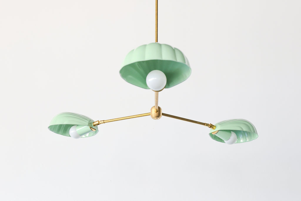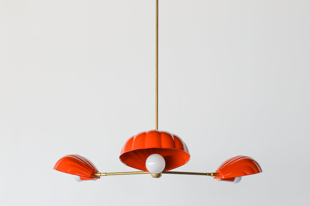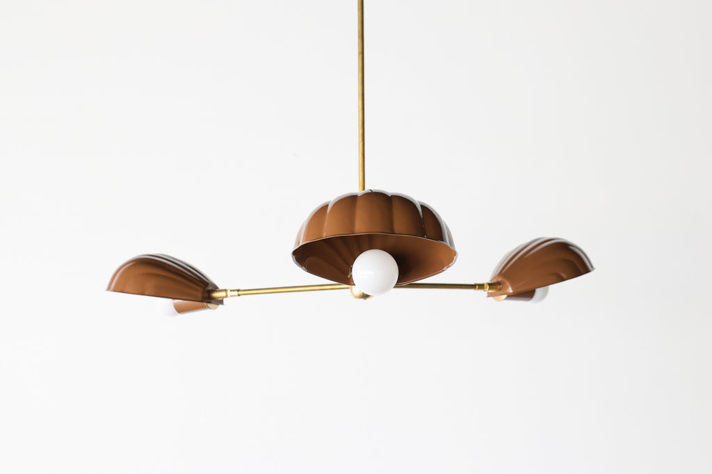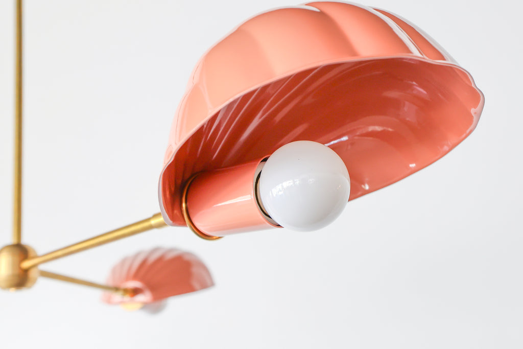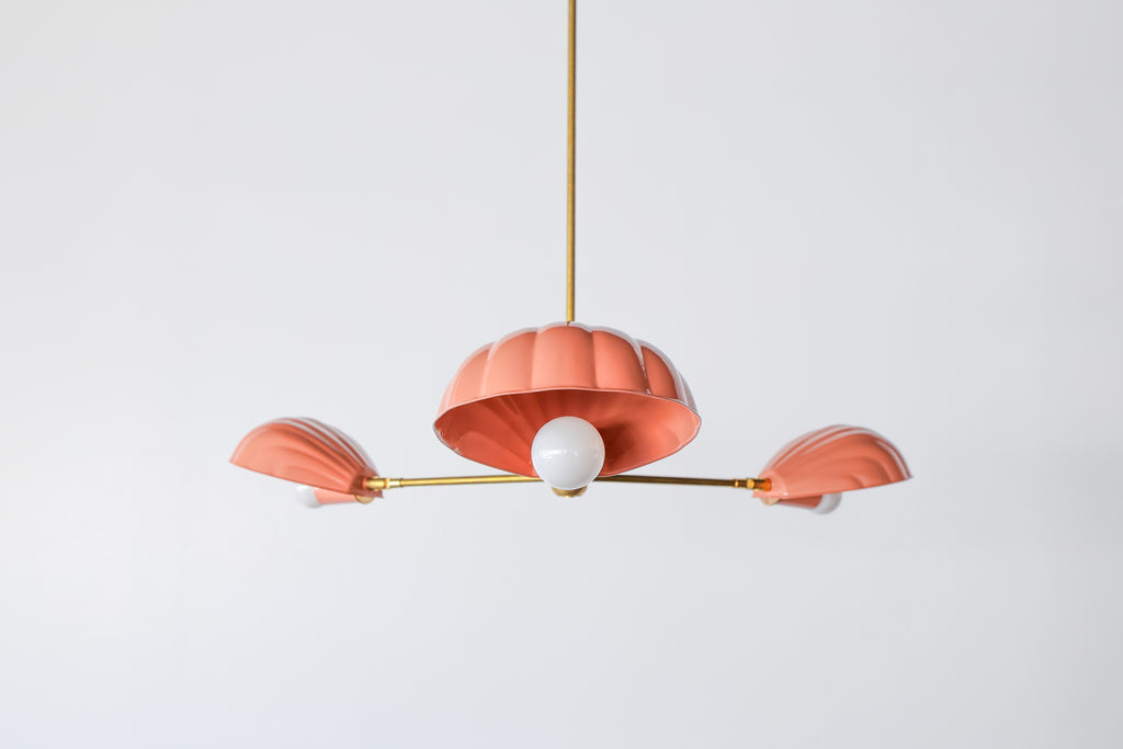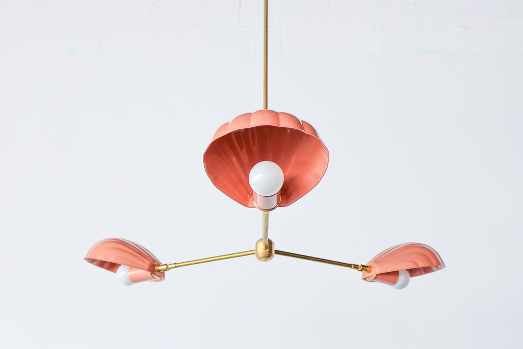 Drawing from the same Art Deco influences as our Coquille Sconce, this midcentury modern chandelier merges elegance with a coastal vibe. Each of the three “shells” is meticulously crafted from steel and powder-coated in one of our 30 curated colors or finished in brass or chrome for a sleek, modern touch. With a nod to the iconic Nancy Meyers aesthetic, this statement chandelier adds a cozy, upscale feel to any room.