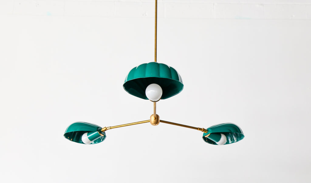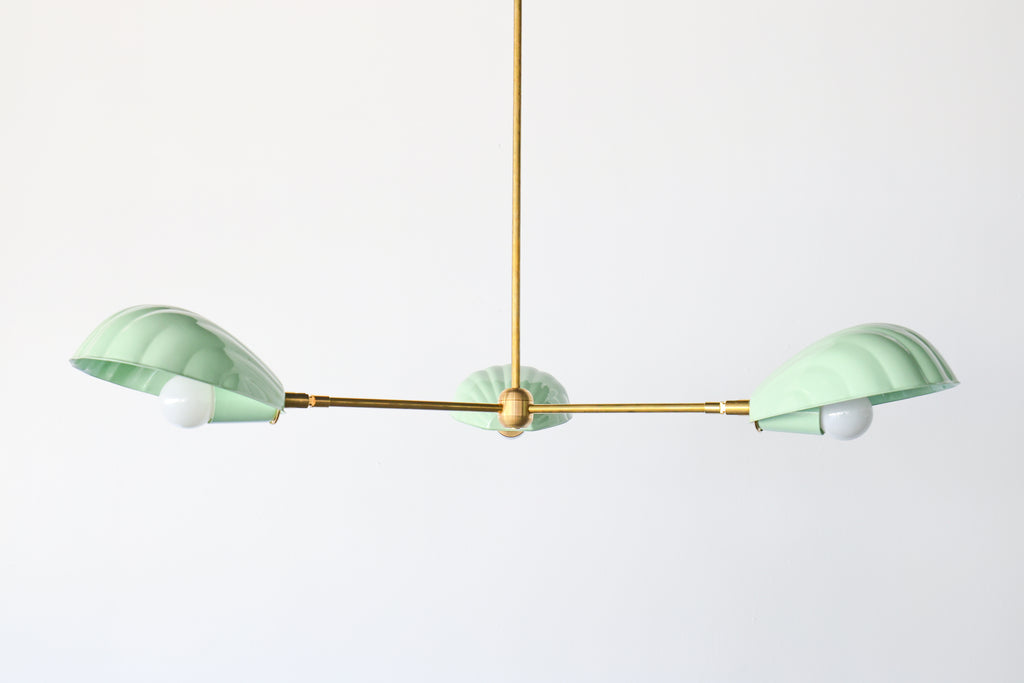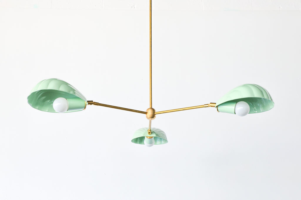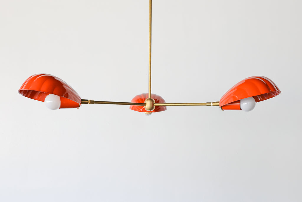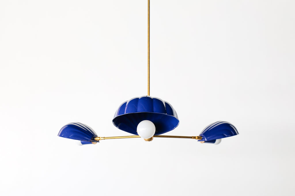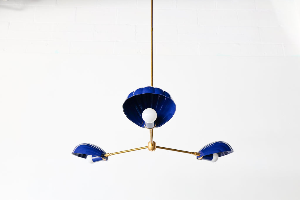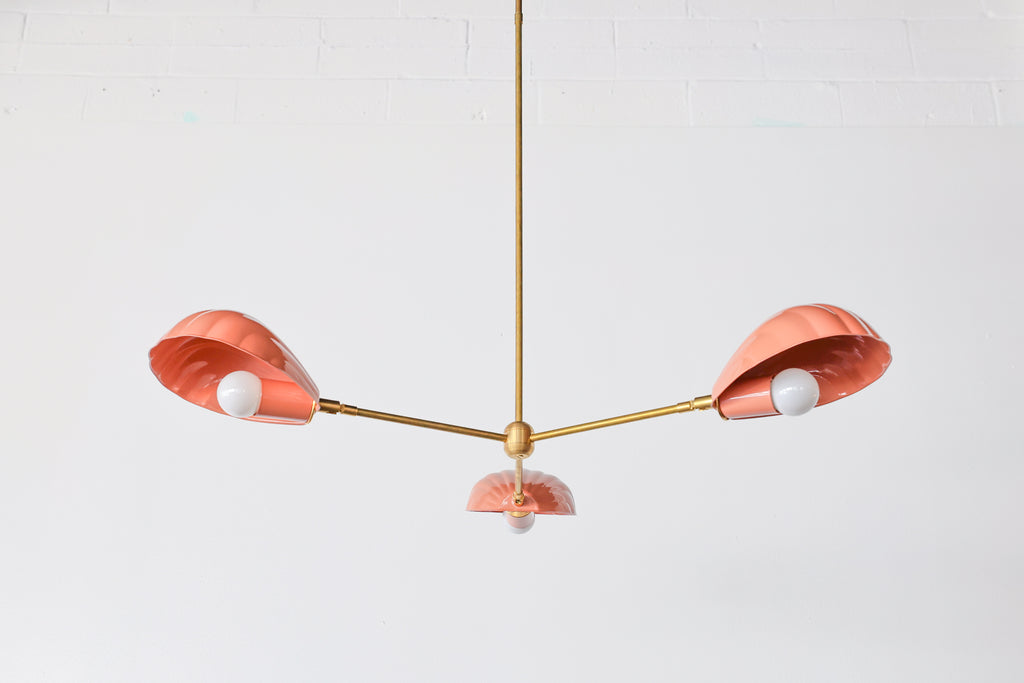 Drawing from the same Art Deco influences as our Coquille Sconce, this midcentury modern chandelier merges elegance with a coastal vibe. Each of the three “shells” is meticulously crafted from steel and powder-coated in one of our 30 curated colors or finished in brass or chrome for a sleek, modern touch. With a nod to the iconic Nancy Meyers aesthetic, this statement chandelier adds a cozy, upscale feel to any room.