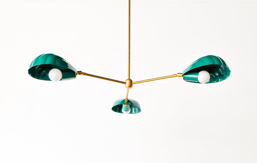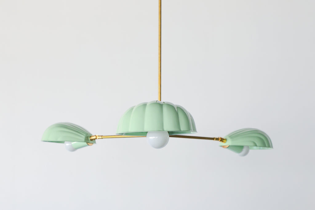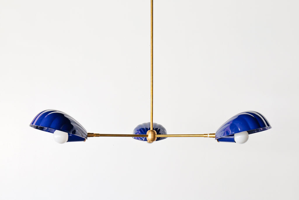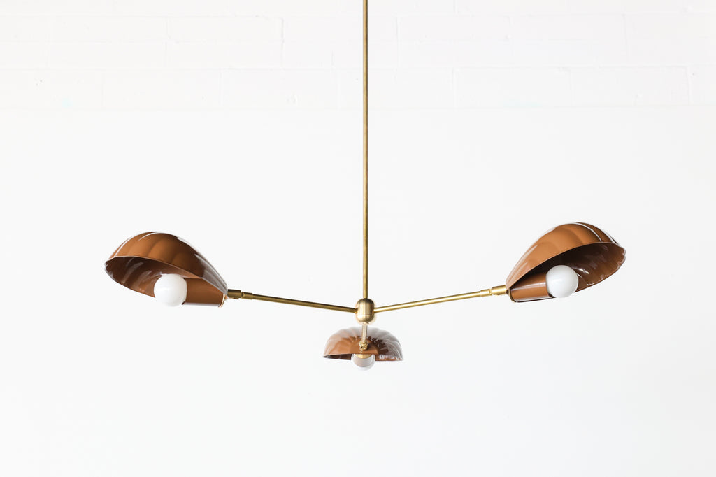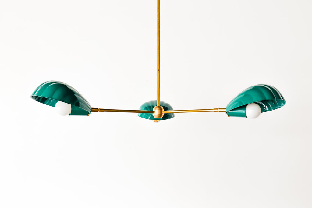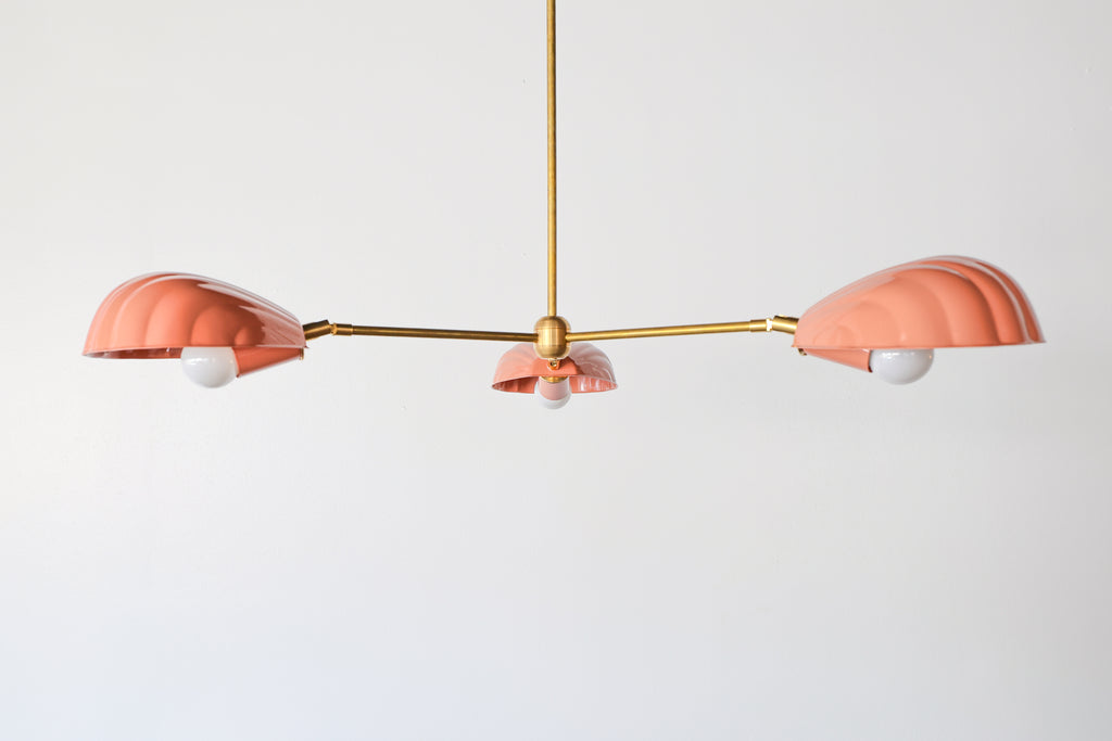 Drawing from the same Art Deco influences as our Coquille Sconce, this midcentury modern chandelier merges elegance with a coastal vibe. Each of the three “shells” is meticulously crafted from steel and powder-coated in one of our 30 curated colors or finished in brass or chrome for a sleek, modern touch. With a nod to the iconic Nancy Meyers aesthetic, this statement chandelier adds a cozy, upscale feel to any room.
