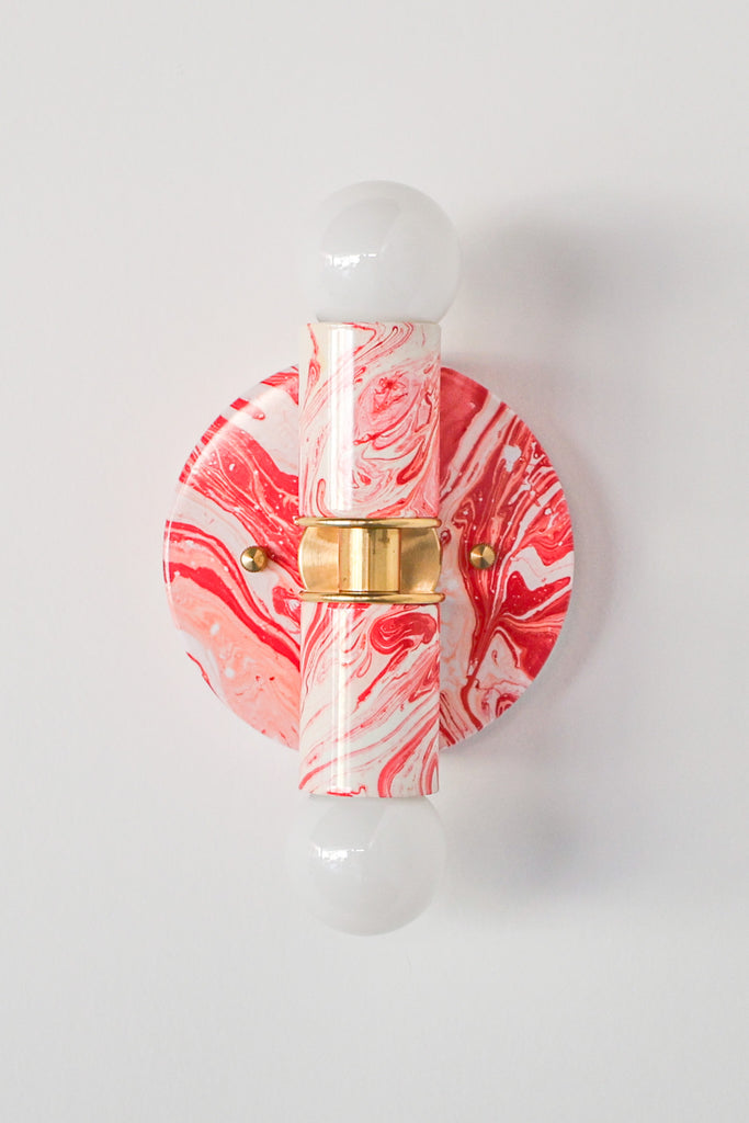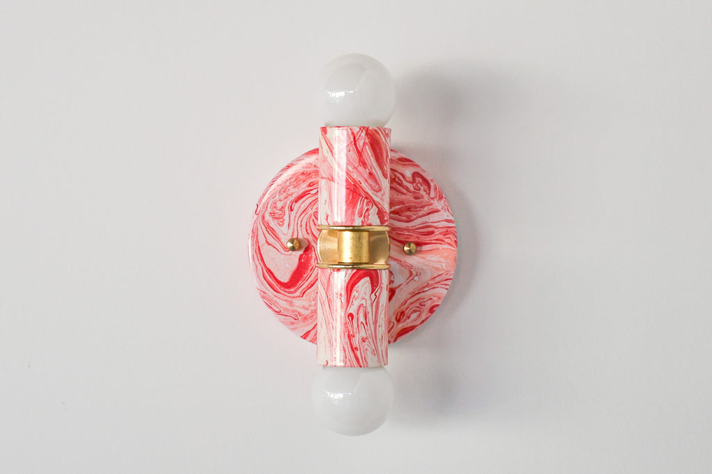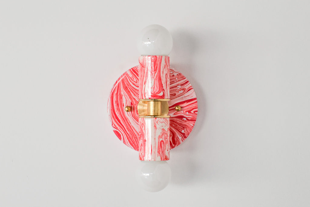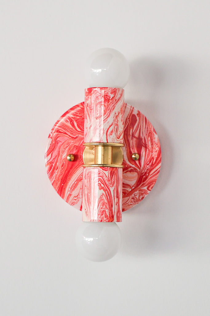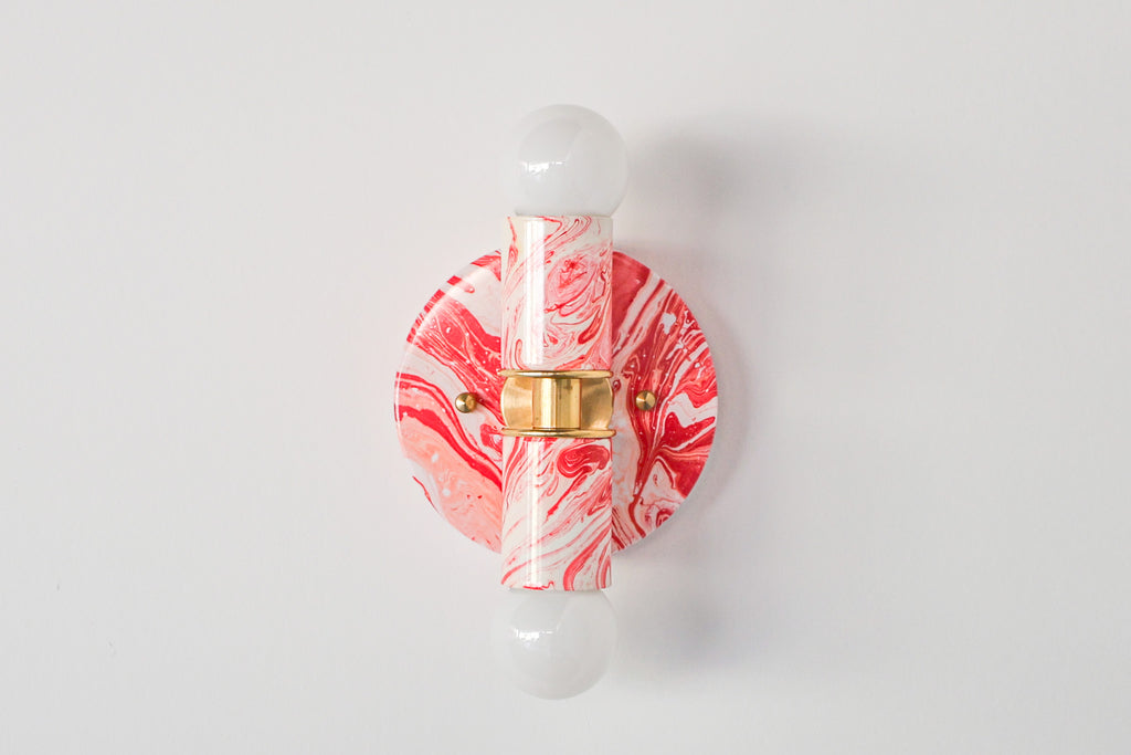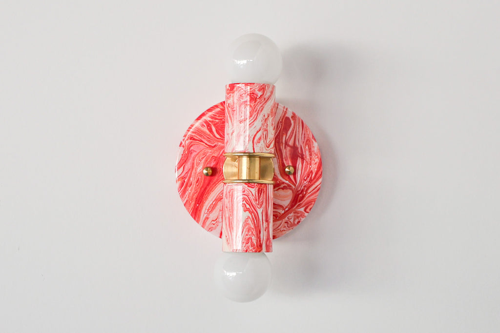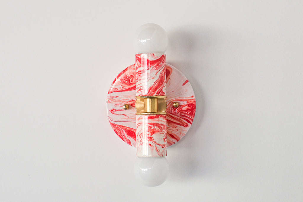Color is the star of the show in the Thalia Sconce. Named after a Greek Muse, the Thalia sconce is saturated in color with metal accents. The two-light sconce or flush mount ceiling light is compact and can be used in small spaces that need high impact design. The fixture can be installed on a wall or ceiling in both horizontal or vertical position. Hardwire installation; however, a plug in option can be added here.