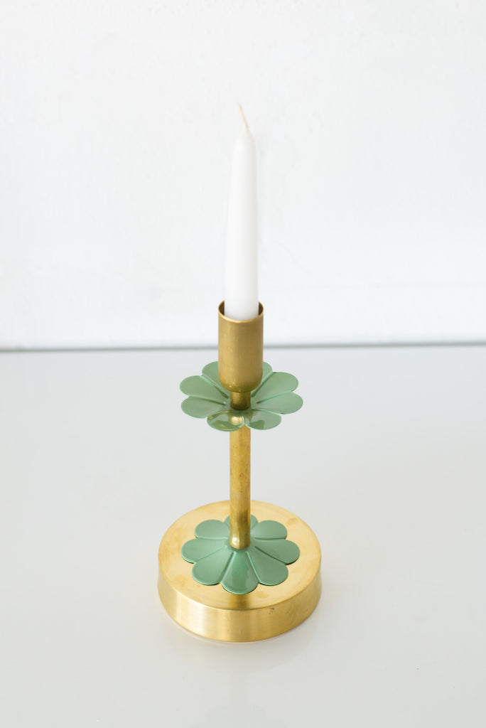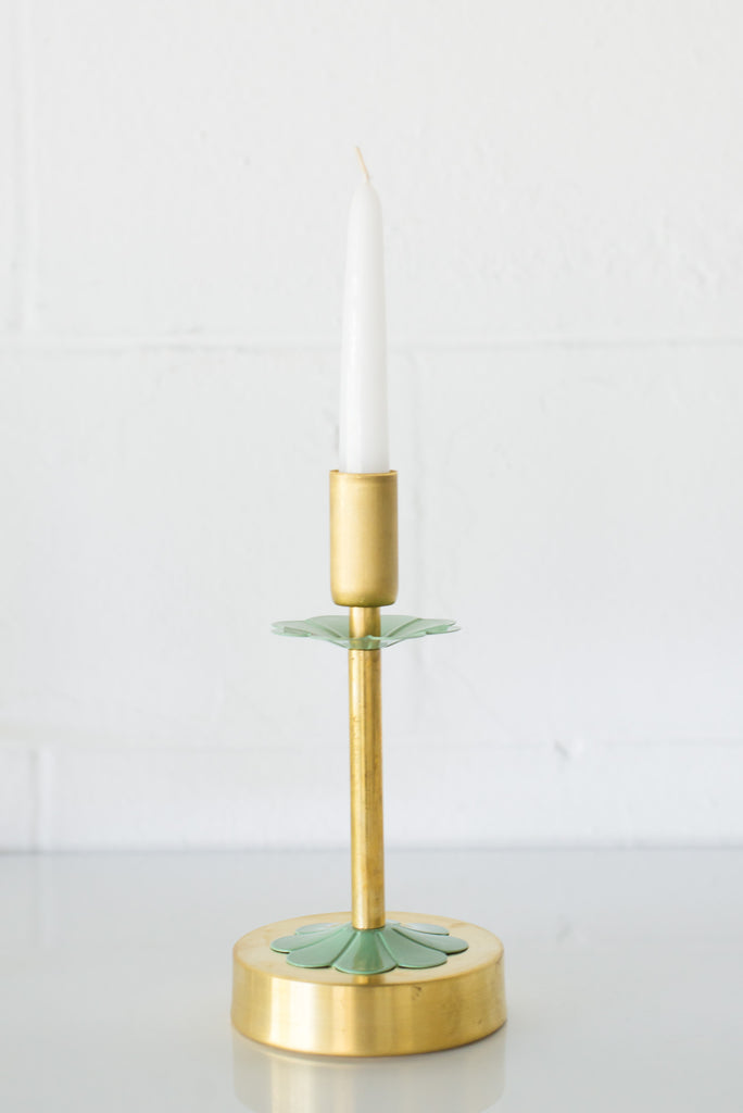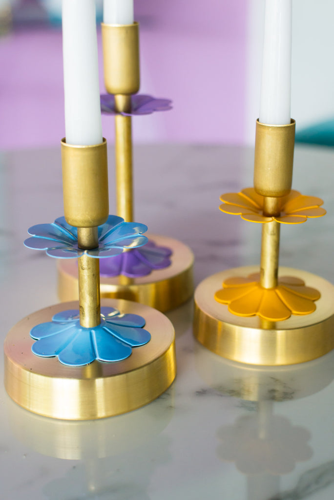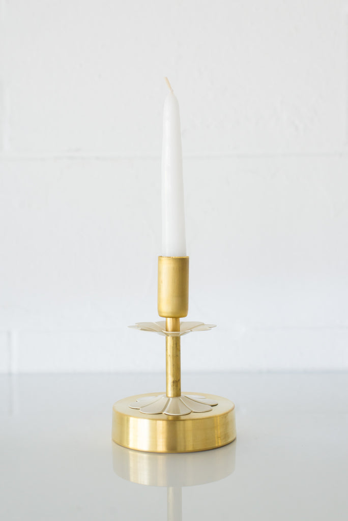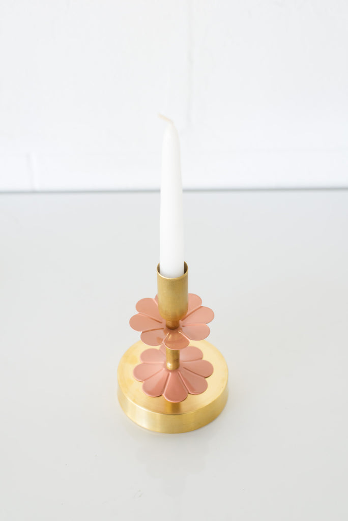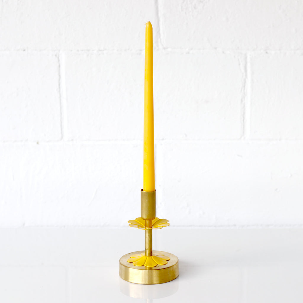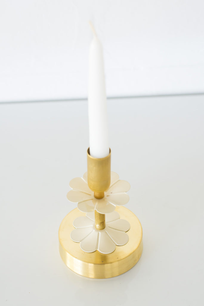 A unique hand-made brass floral taper candle holder. Features a powdercoated daisy detail. Comes in two sizes: short and tall.