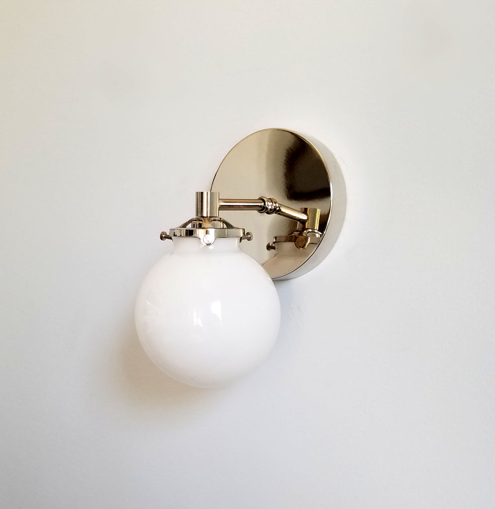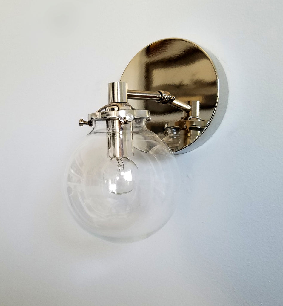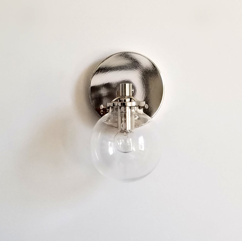 Vintage inspired glass and metal sconce featuring a globe-shaped glass shade and candelabra socket. The Delachaise Sconce has a simple design that works well with most bath and kitchen styles, particularly because it can be installed with the bulb facing up or down. The shade is crafted of glass and tapers at the top and bottom.