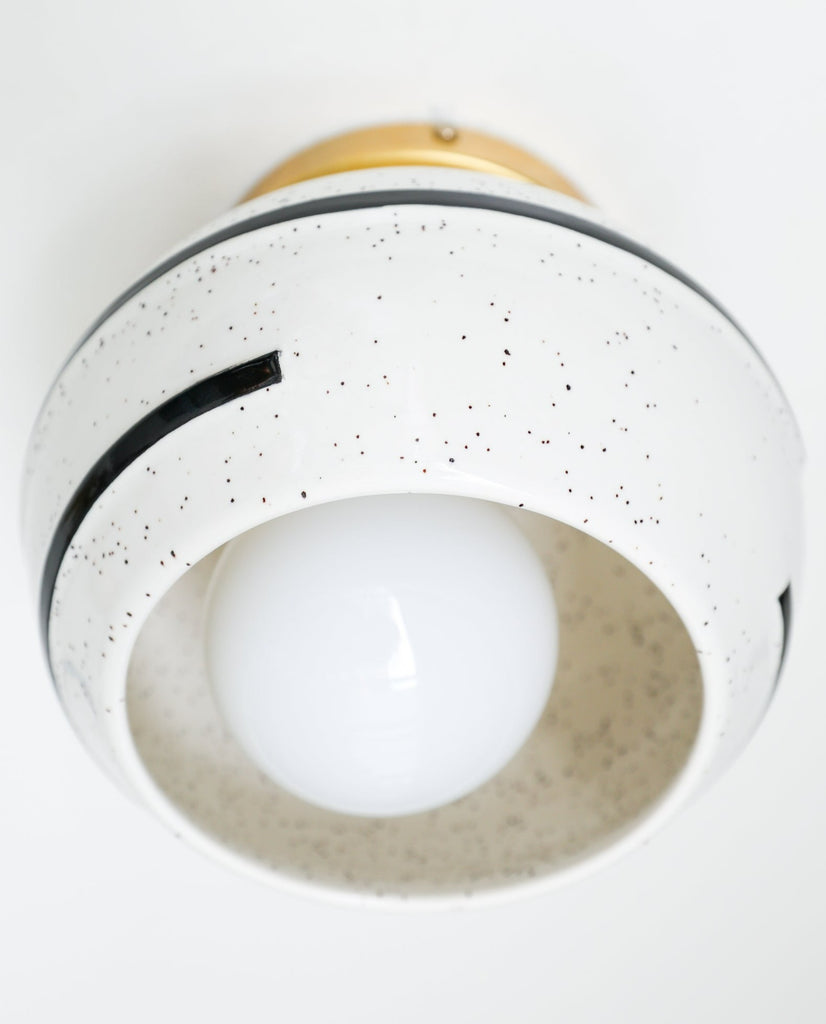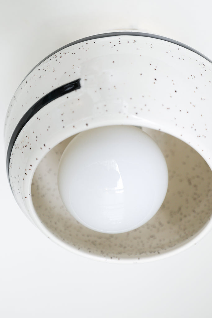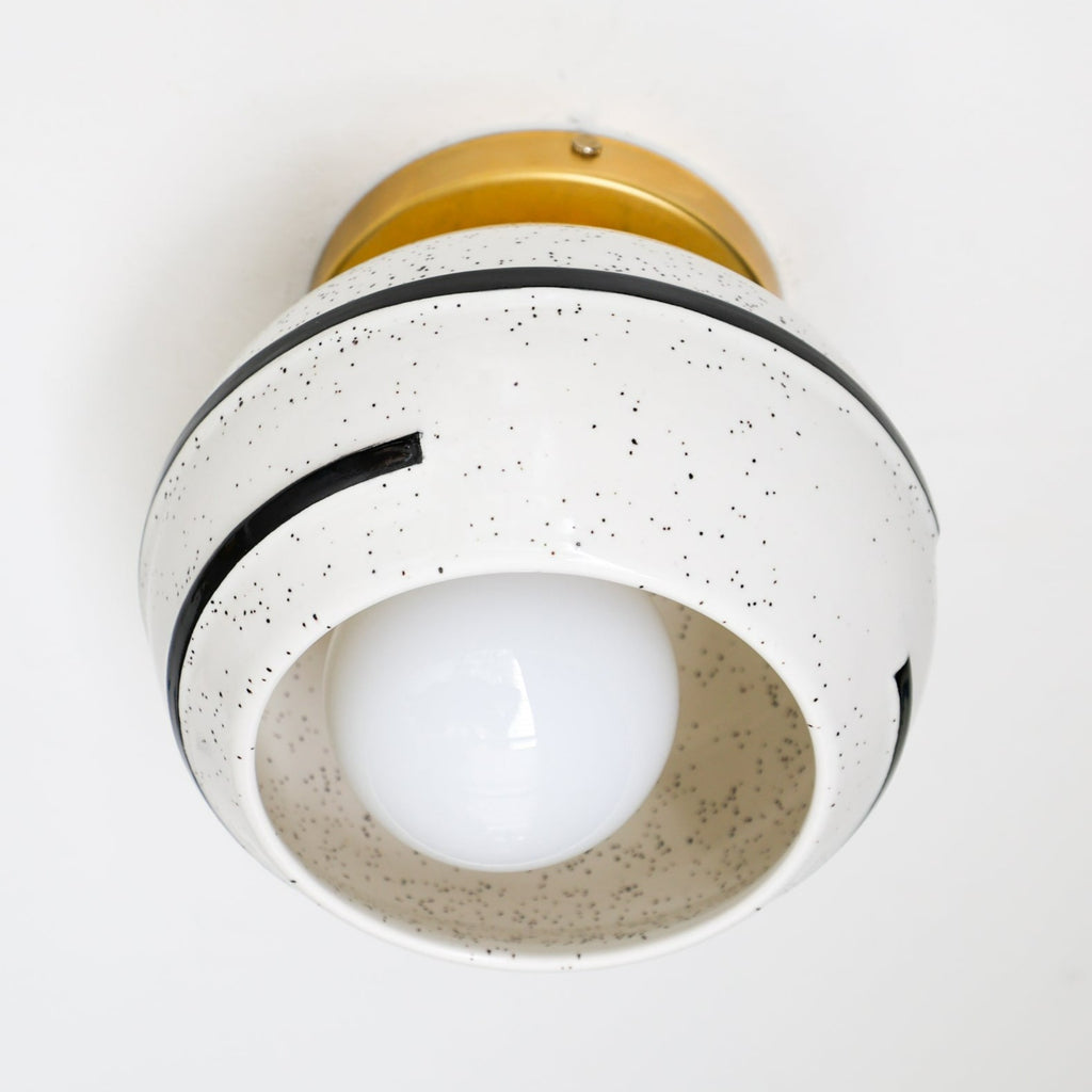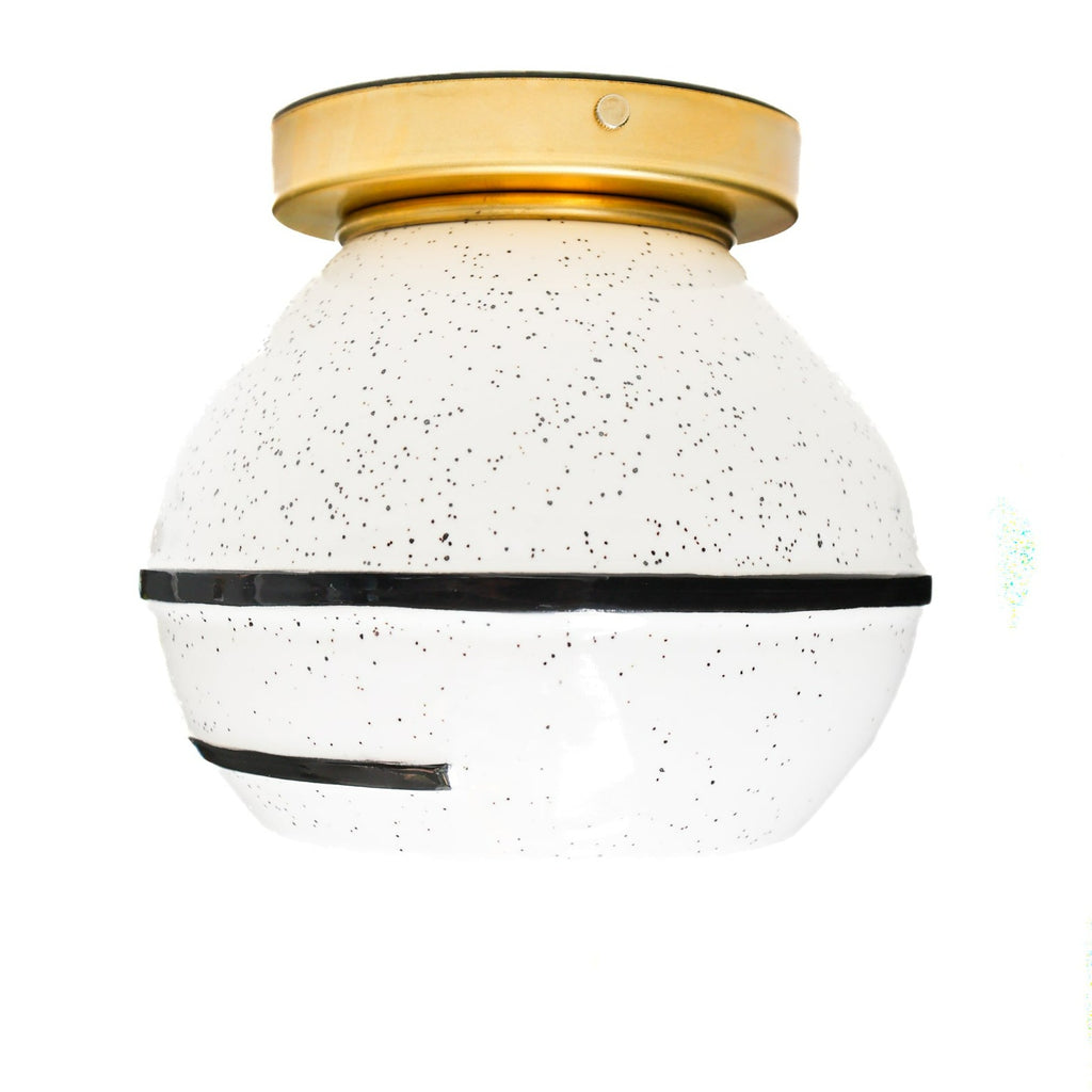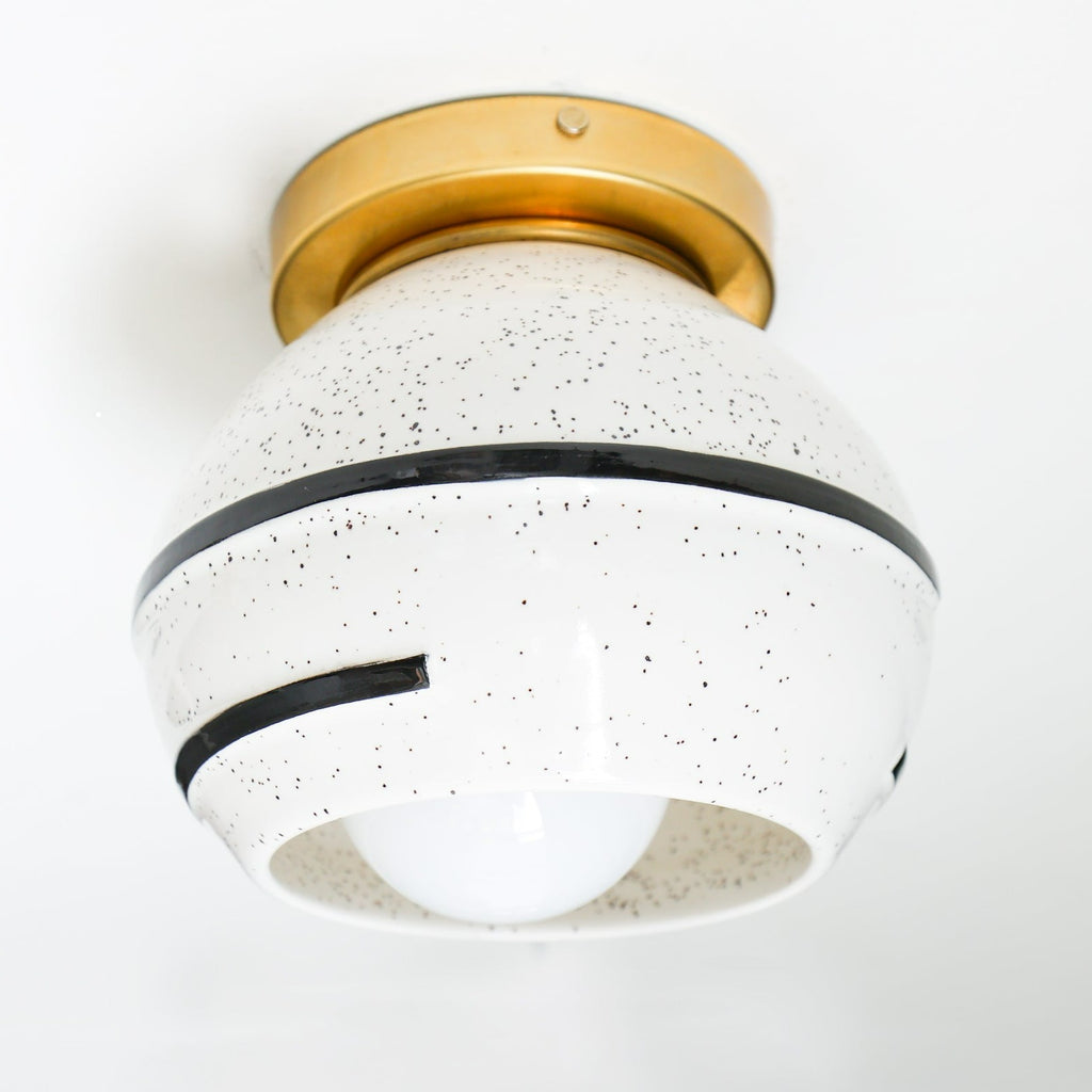 Introducing the Delta Flushmount Ceiling Light, inspired by the silt texture of the Mississippi River in Southern Louisiana. This fixture features an earthy glaze with contrasting geometric black lines that wrap the shade partially, creating a unique and artistic look. The Delta Flushmount complements various design styles, including earthy bohemian, mid-century modern, and California cool aesthetics.