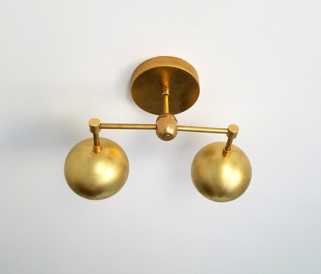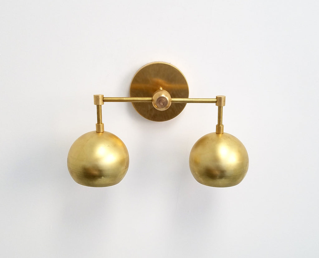 The Double Loa Sconce with raw brass shades has a simple, minimalist design that can be fun or modern. Either way, it is bound to garner loads of compliments. This fixture is a two-light version of our single Loa sconce. The entire fixture is made of unlaquered raw brass that will develop a patina over time. The body of the fixture can be made in four finishes (brass is photographed): brass, chrome, copper, and black.