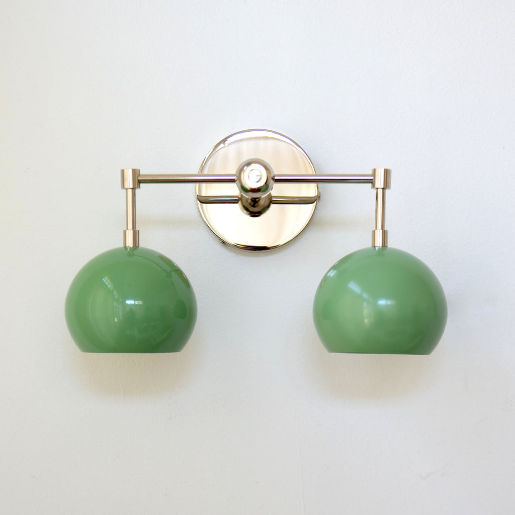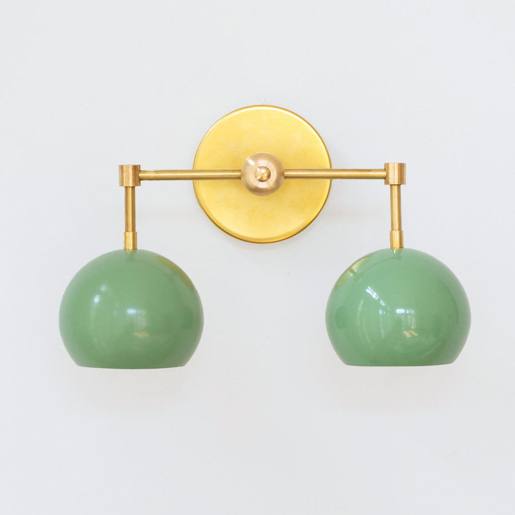 The Double Loa Sconce has a simple, minimalist design that can be fun or modern. Either way, it is bound to garner loads of compliments. This fixture is a two-light version of our single Loa sconce. The shades are globe-shaped and finished in a glossy pastel colored powdercoated finish.