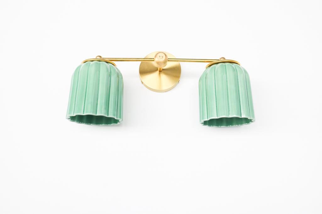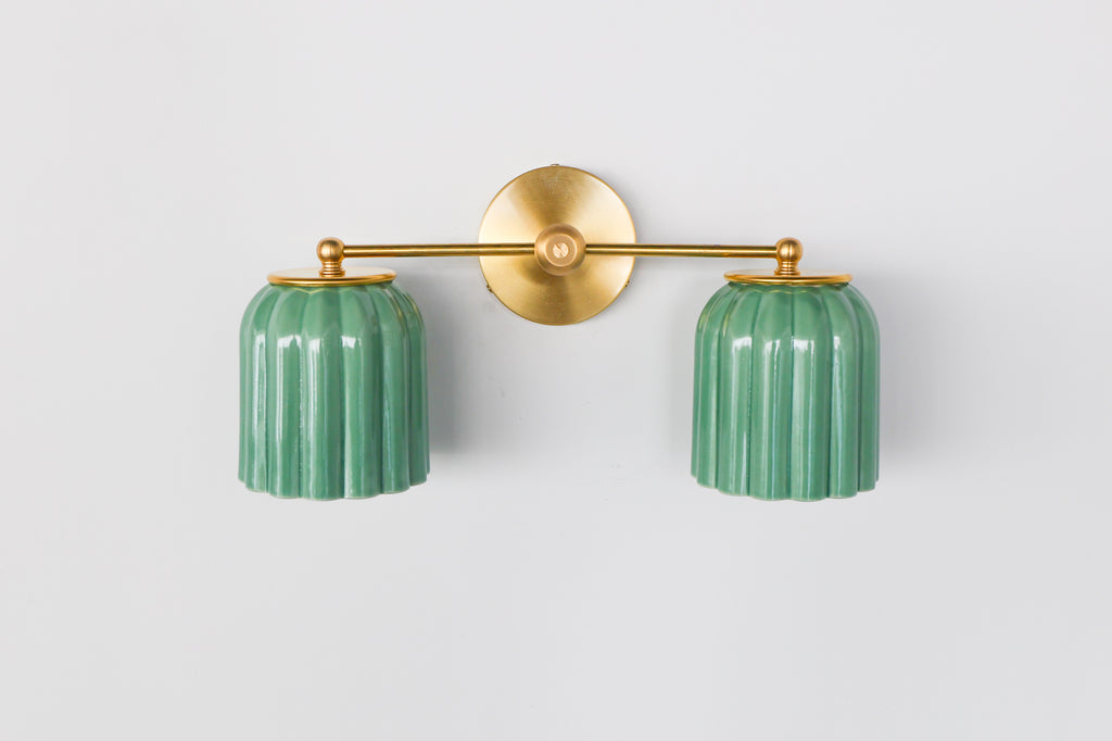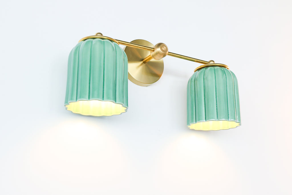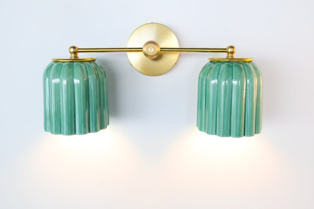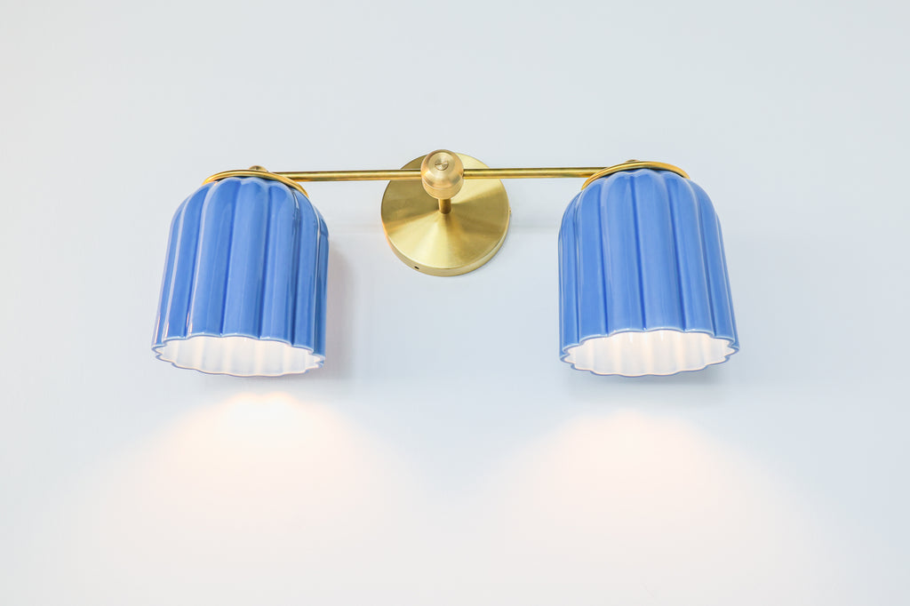 The Marcella Double Sconce is a sculptural ceramic light fixture that blends timeless craftsmanship with modern versatility. Designed by Sazerac Stitches and handmade in Charlotte, NC, each ribbed ceramic shade is produced exclusively for our studio, then hand-assembled with solid brass hardware in our New Orleans workshop.