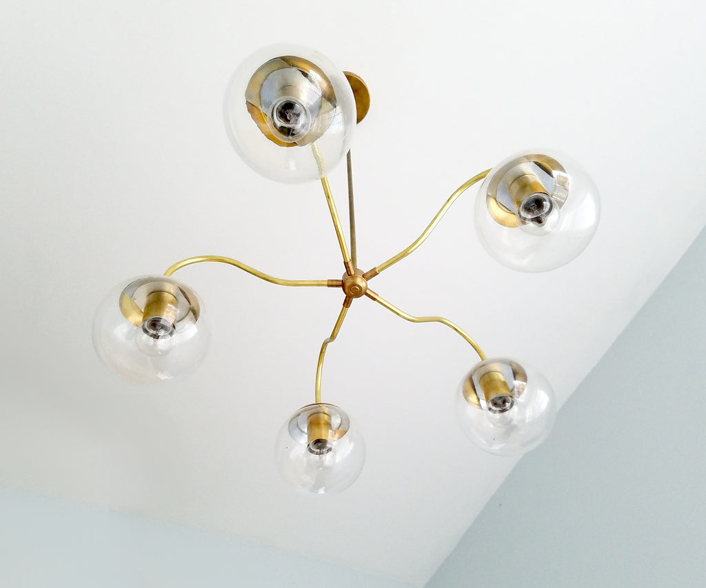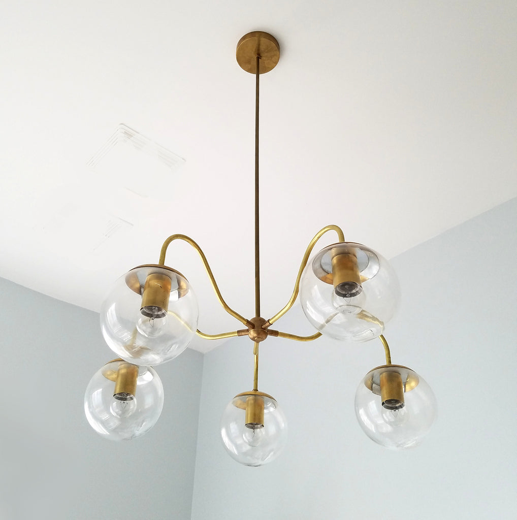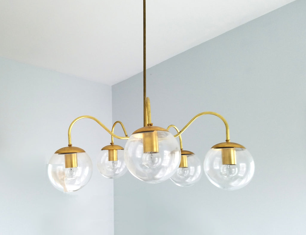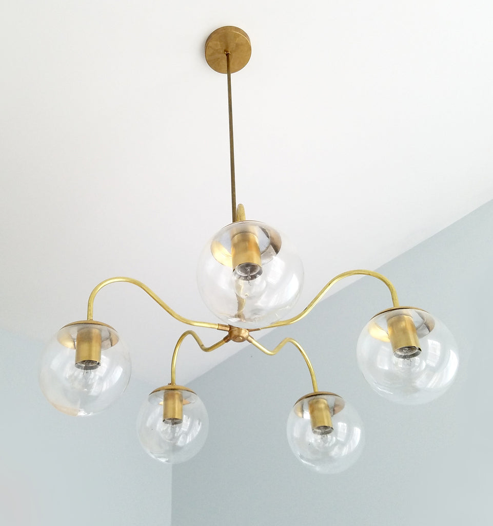 Five curved arms sweep a fresh take on the classic shape of a brass chandelier. With its clean, linear silhouette, the Fontainebleau Chandelier features five clear globes exposing brass socket covers.