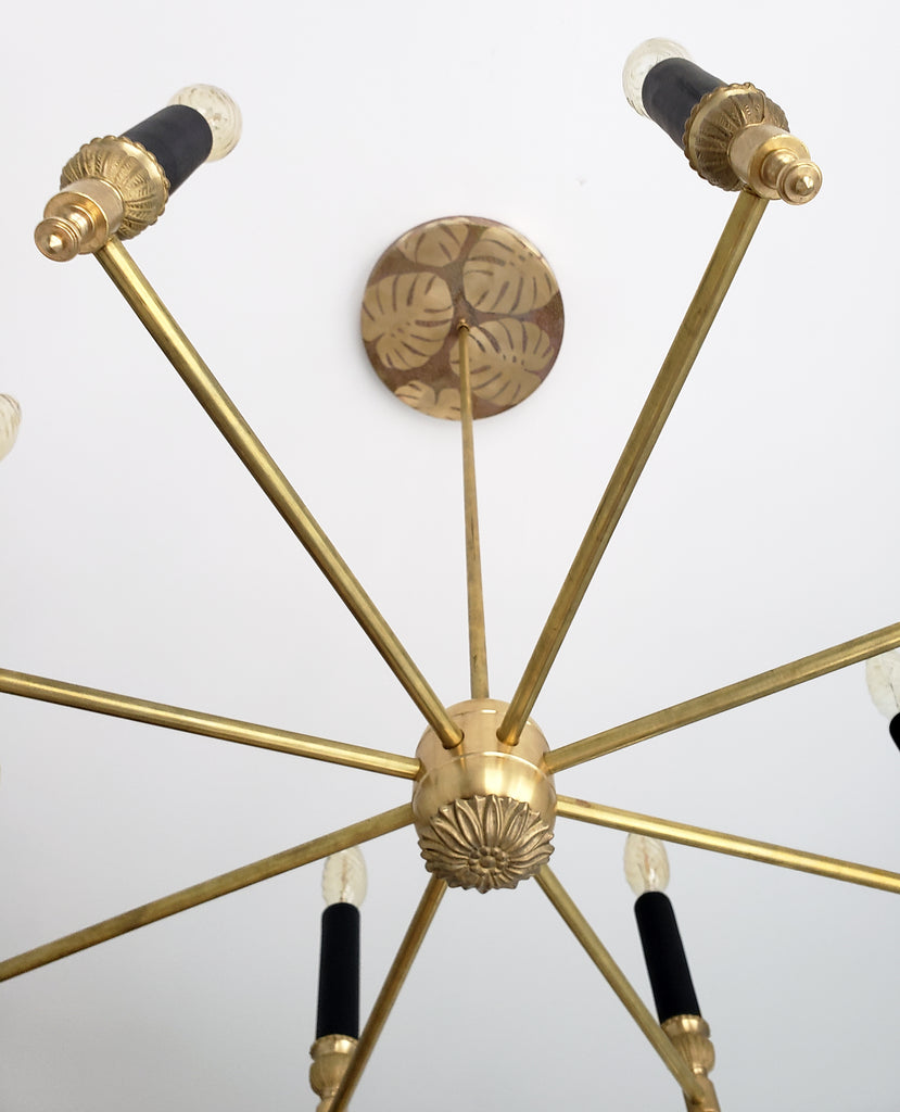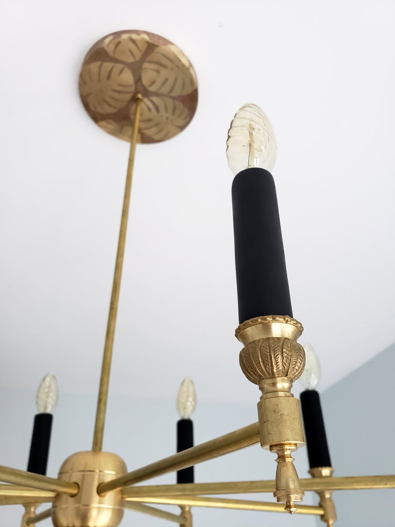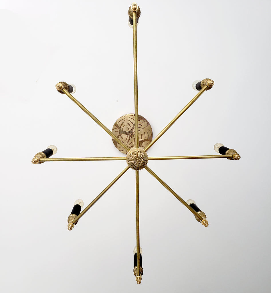 A romantic brass chandelier featuring eight cast brass cups with black faux beeswax candlesticks. Available with an optional etched monstera leaf canopy.