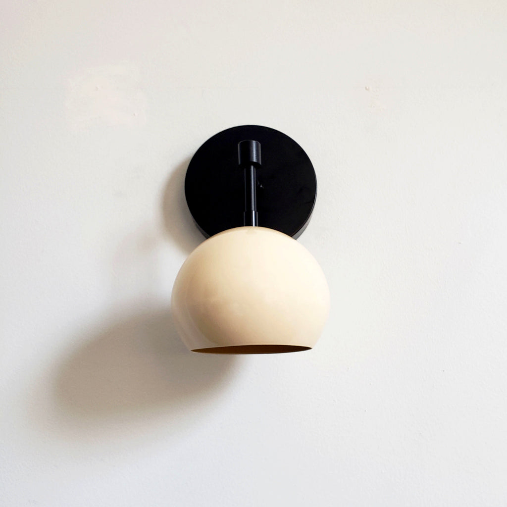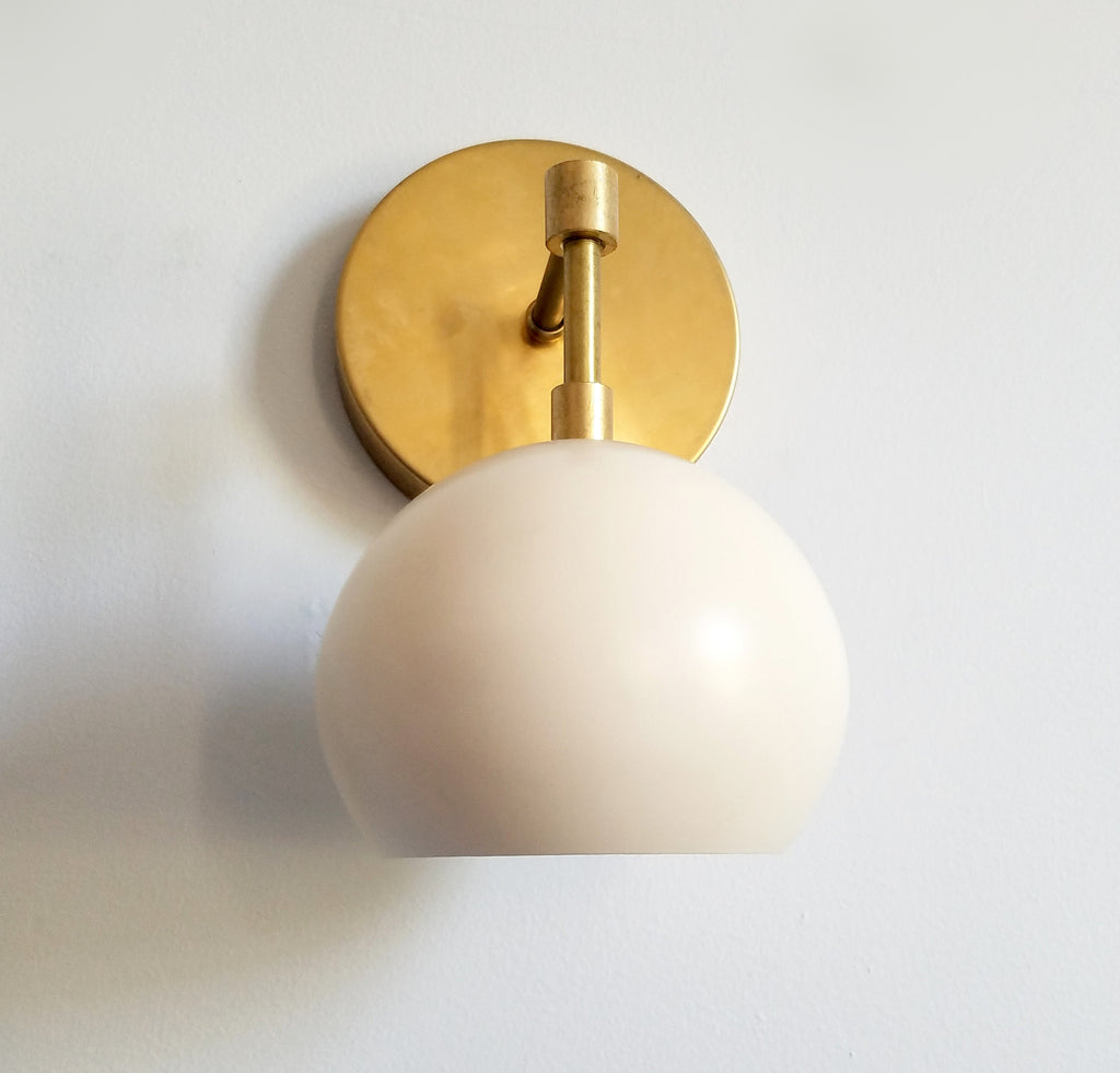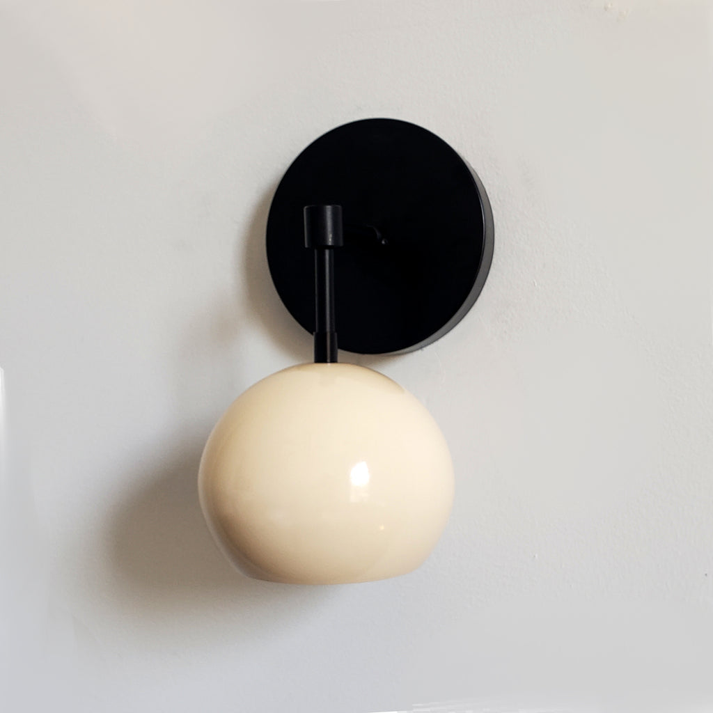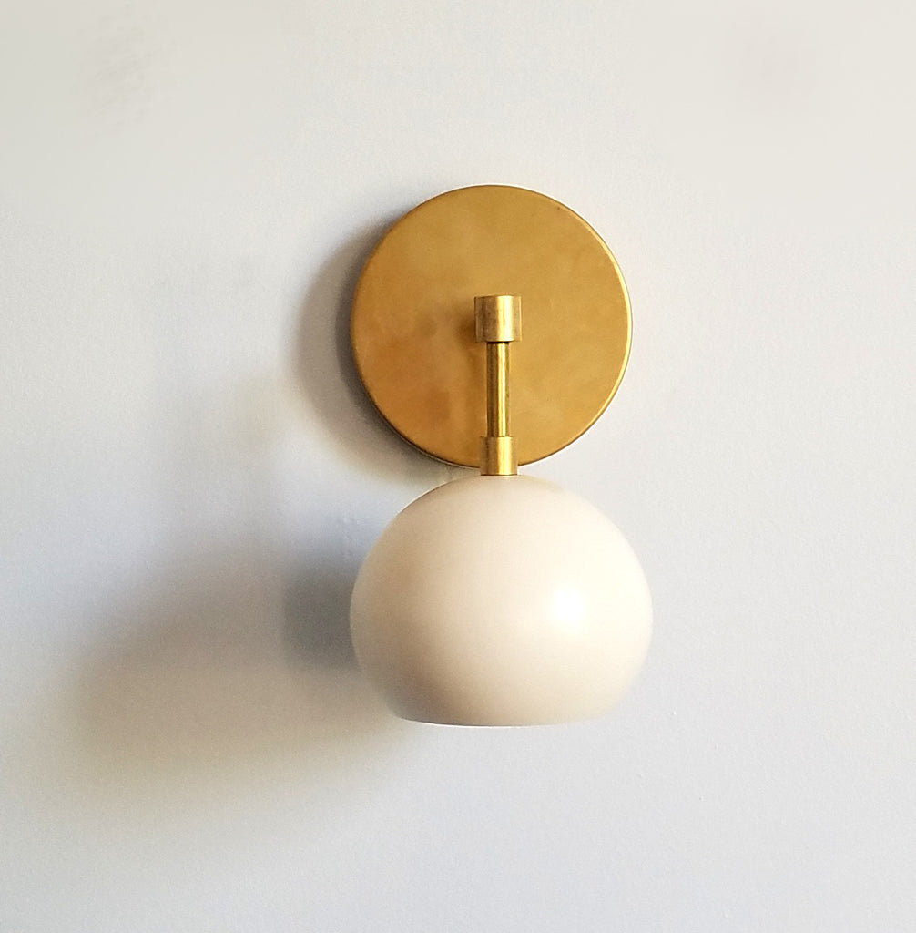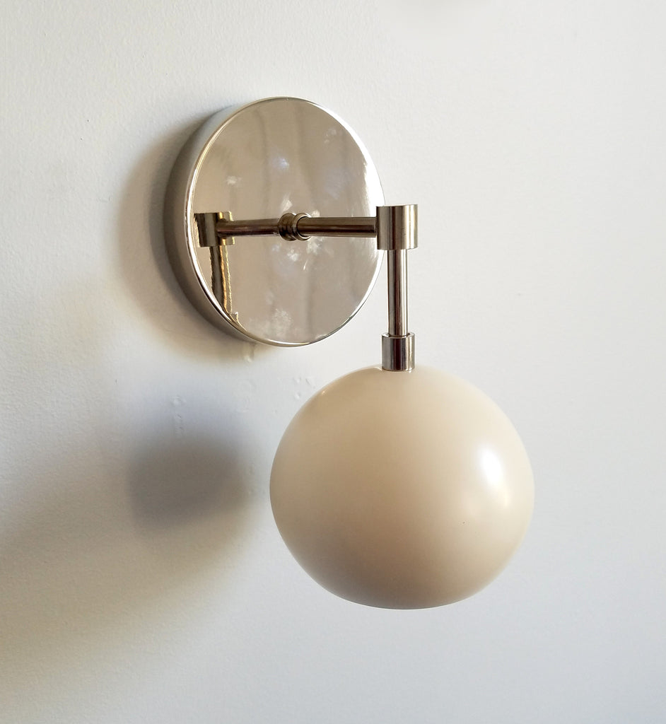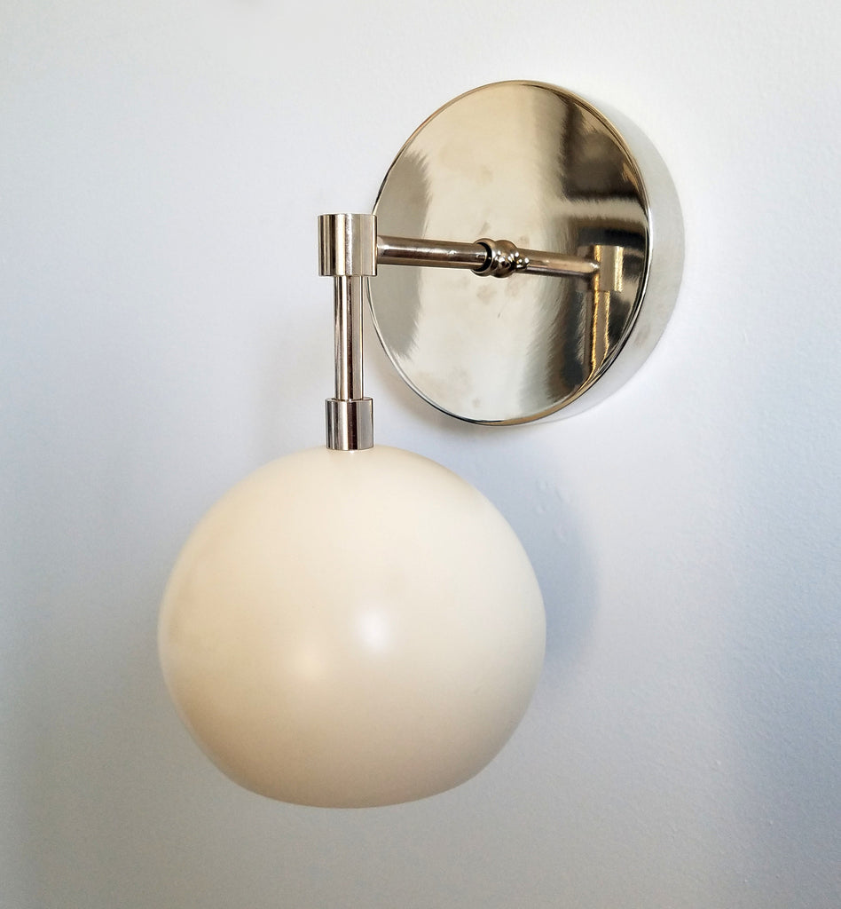 Beautiful mid-century modern inspired sconce featuring a globe-shaped cream colored shade with complimentary metal finish of either brass or chrome. This simple sconce can work as accent lighting, bathroom, lighting, or to illuminate a picture. This sconce features one E26 / medium screw base socket.