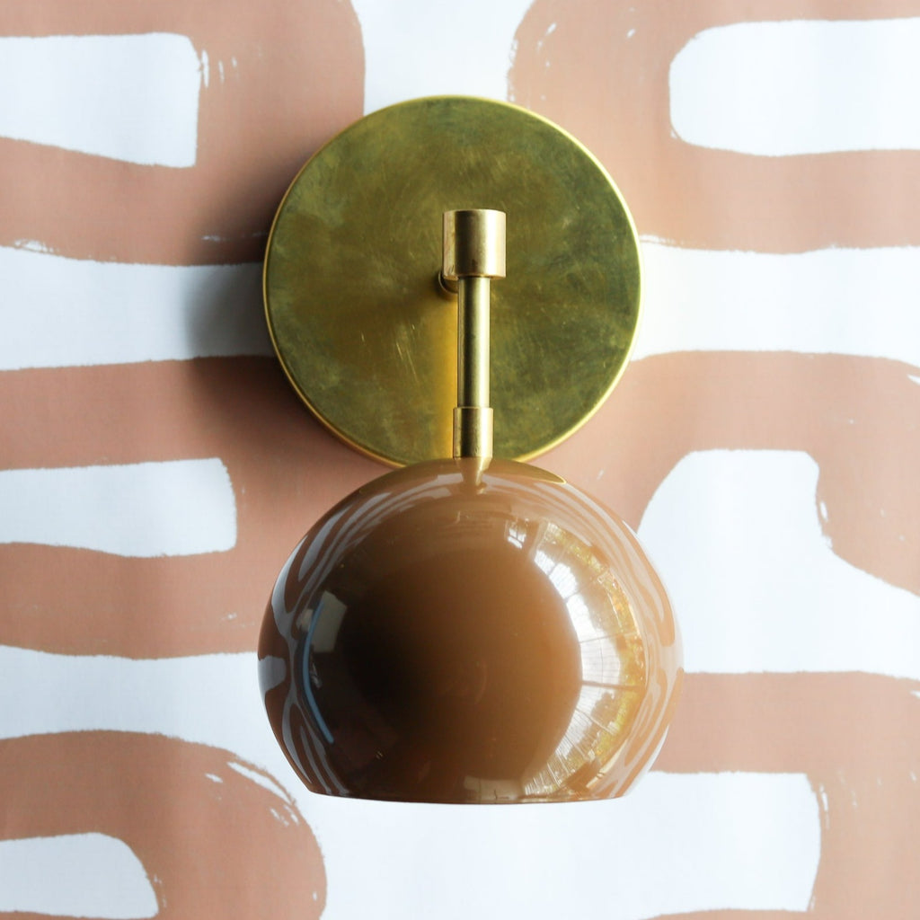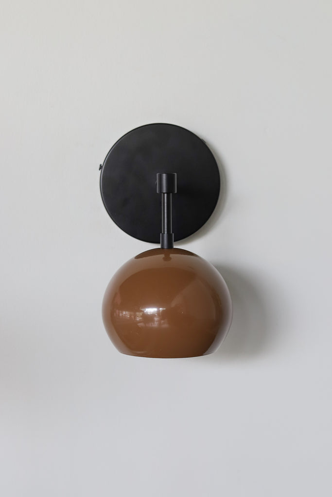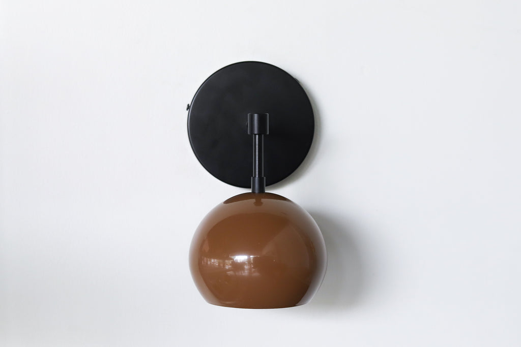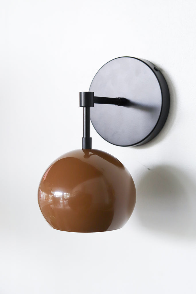 Beautiful mid-century modern inspired sconce featuring a globe-shaped Fudge brown colored shade with complimentary metal finish of either brass, chrome, or matte black. This simple sconce can work as accent lighting, bathroom, lighting, or to illuminate wall art. This sconce features one E26 / medium screw base socket.