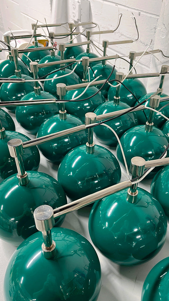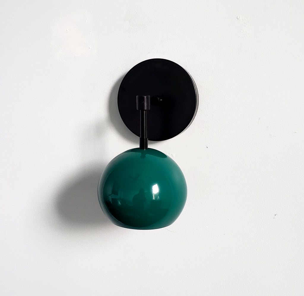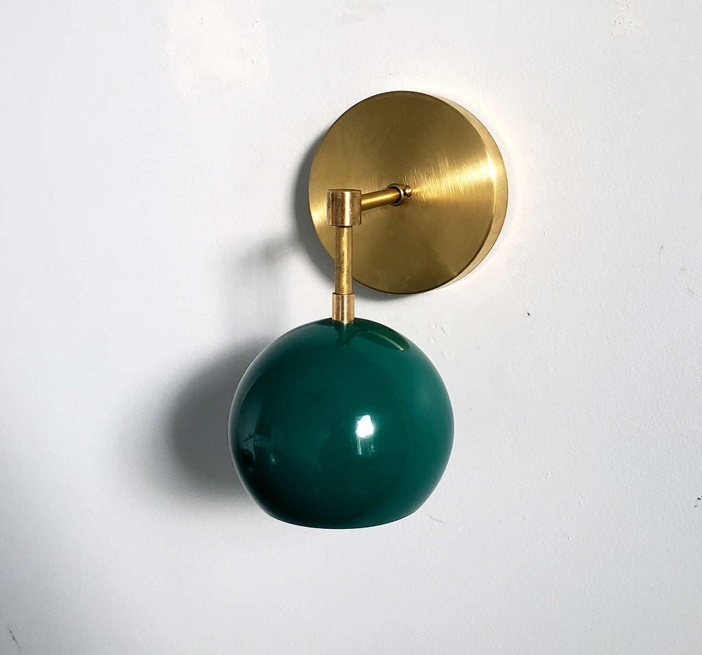 Beautiful mid-century modern inspired sconce featuring a globe-shaped Mermaid Green shade with complimentary metal finish of brass, chrome, matte black, or copper. This simple sconce can work as accent lighting, bathroom, lighting, or to illuminate wall art. This sconce features one E26 / medium screw base socket.