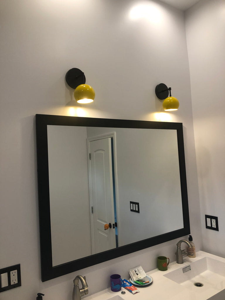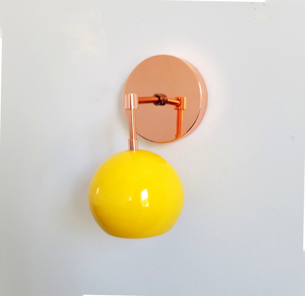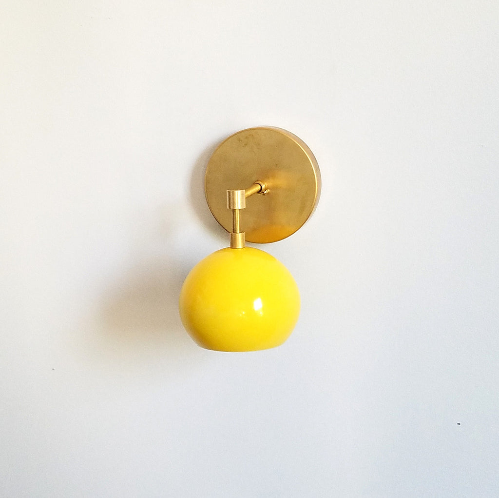 Beautiful mid-century modern inspired sconce featuring a globe-shaped Sunshine Yellow colored shade with complimentary metal finish of either brass or chrome. This simple sconce can work as accent lighting, bathroom, lighting, or to illuminate wall art. This sconce features one E26 / medium screw base socket.