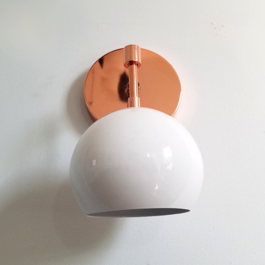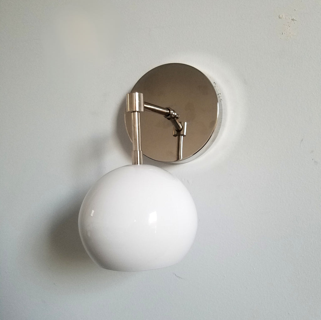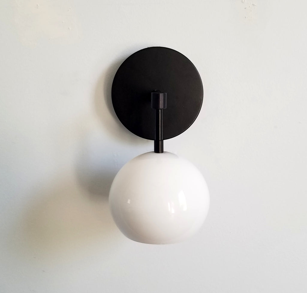 Beautiful mid-century modern inspired sconce featuring a globe-shaped white colored shade with complimentary metal finish of either brass, chrome, copper, or matte black. This simple sconce can work as accent lighting, bathroom, lighting, or to illuminate a picture. This sconce features one E26 / medium screw base socket.