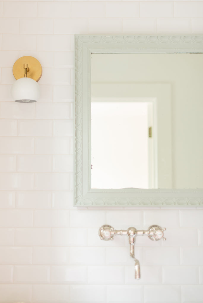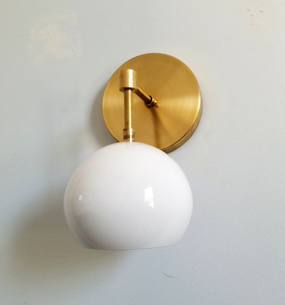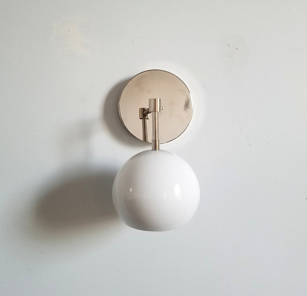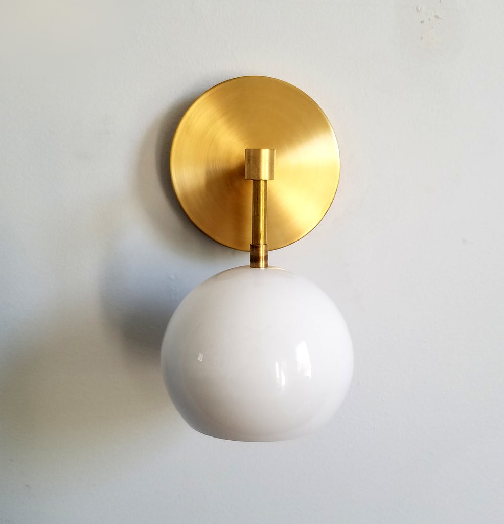 Beautiful mid-century modern inspired sconce featuring a globe-shaped white colored shade with complimentary metal finish of either brass, chrome, copper, or matte black. This simple sconce can work as accent lighting, bathroom, lighting, or to illuminate a picture. This sconce features one E26 / medium screw base socket.