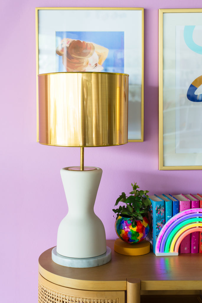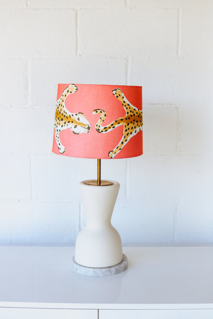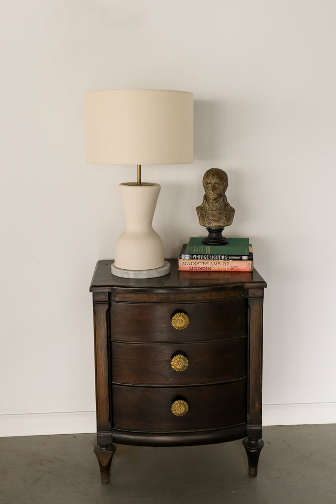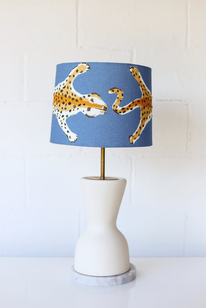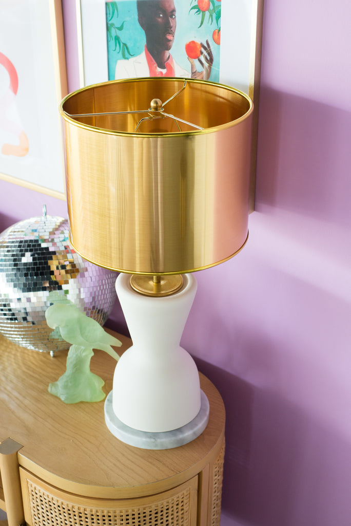Inspired by the feminine form, this ceramic and marble lamp is an instant classic. It's simple shape, unglazed ceramic texture, and brass details pair beautifully with a wide variety of lamp shade types. It's available in three colors: cream, pale lavender, and blue. The raw brass details on the lamp will develop a patina over time or can be polished occasionally to retain the gold sheen. The ceramic portion of the lamp is slip-casted in small batches in Monroe, NC. The lamp is made in New Orleans.