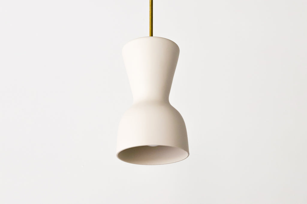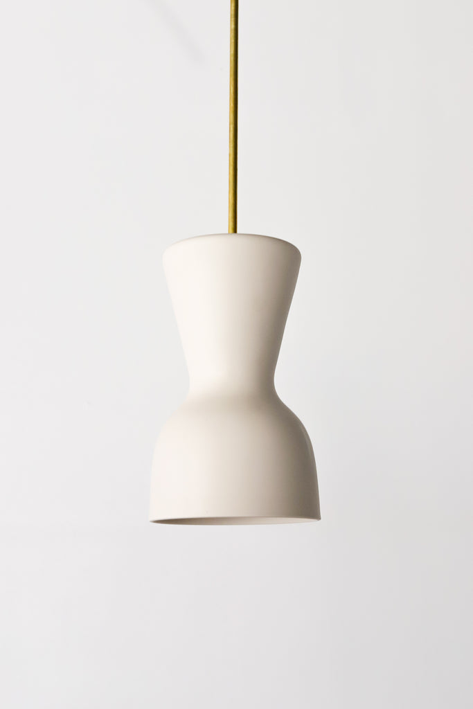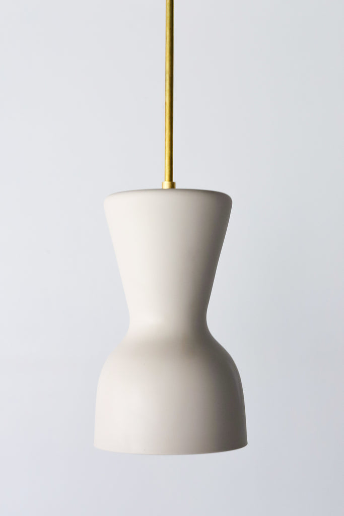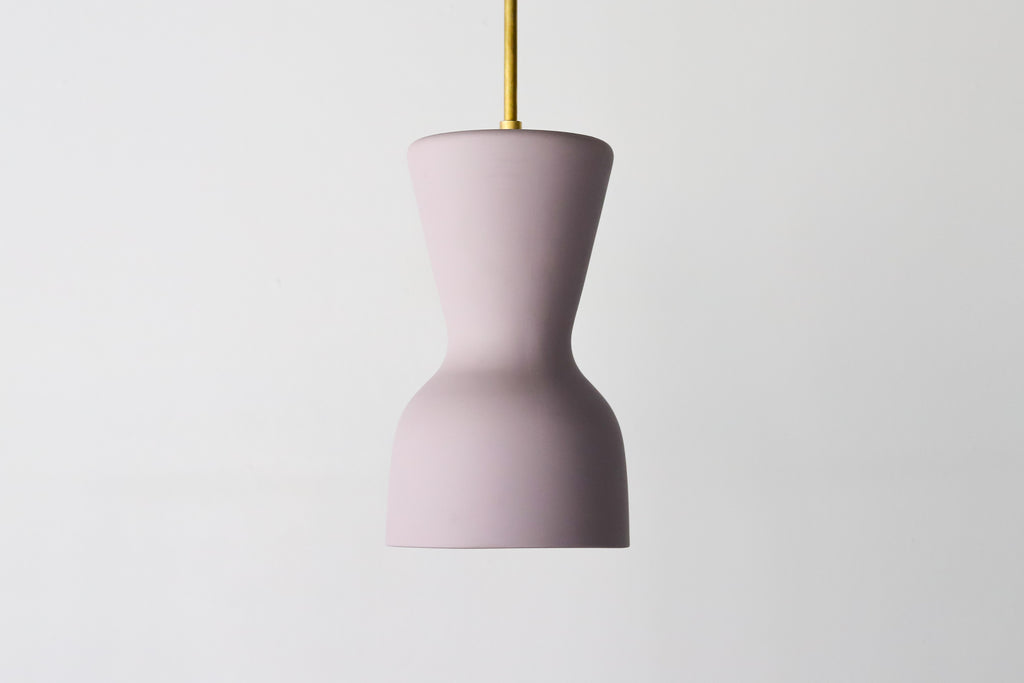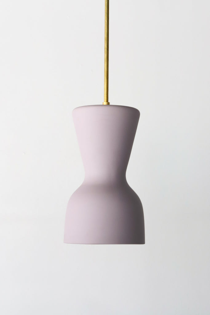 Inspired by the feminine form, this ceramic pendant is an instant classic. It's simple shape, unglazed ceramic texture, and brass details pair beautifully with a wide variety of decor styles. It's available in three colors: cream, pale lavender, and blue. The raw brass details on the lamp will develop a patina over time or can be polished occasionally to retain the gold sheen. The ceramic portion of the lamp is slip-casted in small batches in Monroe, NC. The pendant is made in New Orleans.