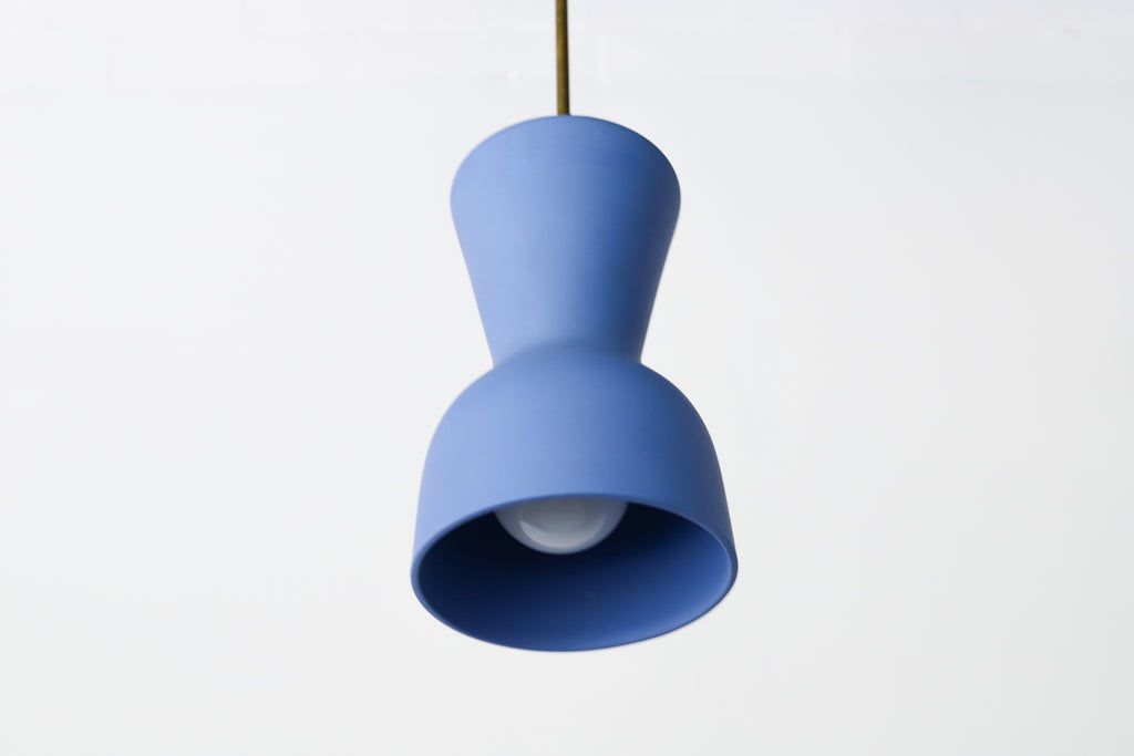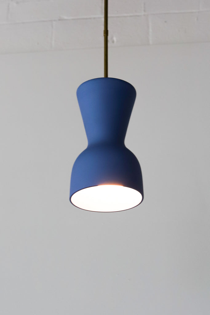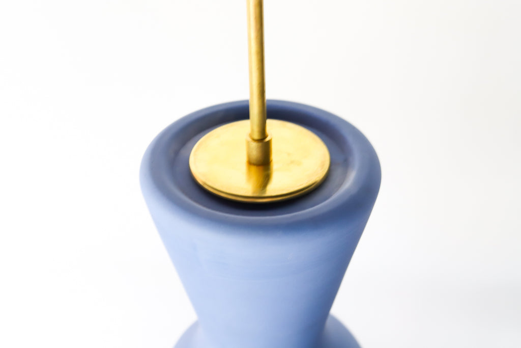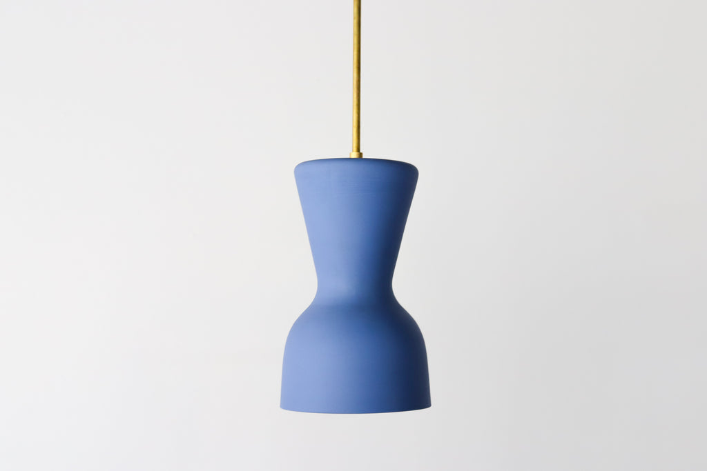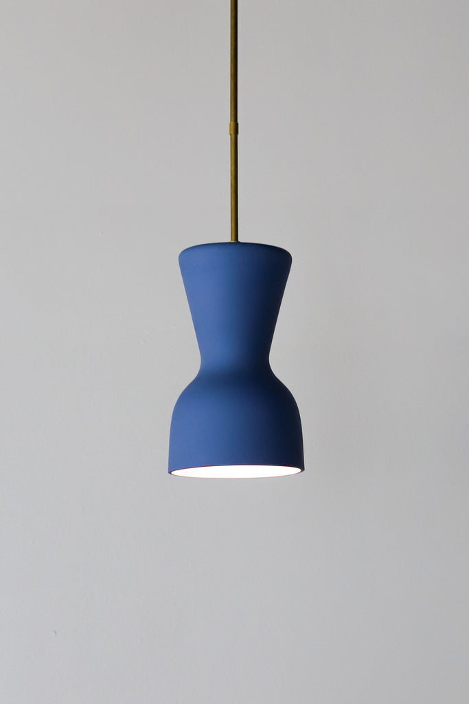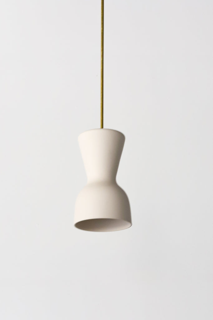Inspired by the feminine form, this ceramic pendant is an instant classic. It's simple shape, unglazed ceramic texture, and brass details pair beautifully with a wide variety of decor styles. It's available in three colors: cream, pale lavender, and blue. The raw brass details on the lamp will develop a patina over time or can be polished occasionally to retain the gold sheen. The ceramic portion of the lamp is slip-casted in small batches in Monroe, NC. The pendant is made in New Orleans.
