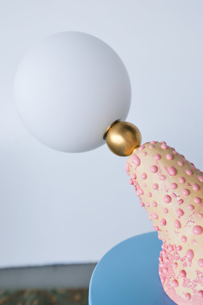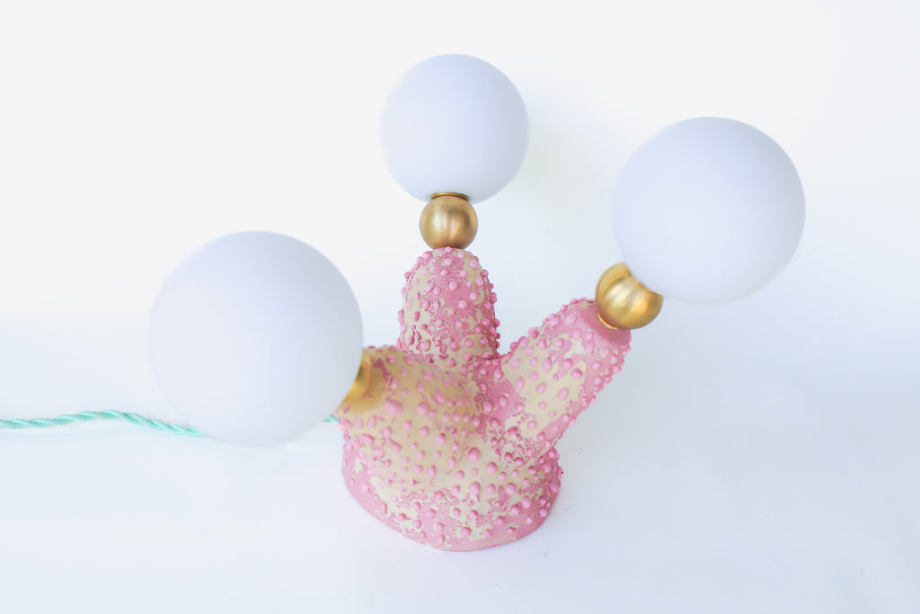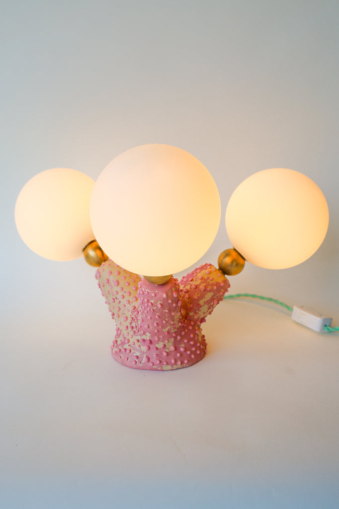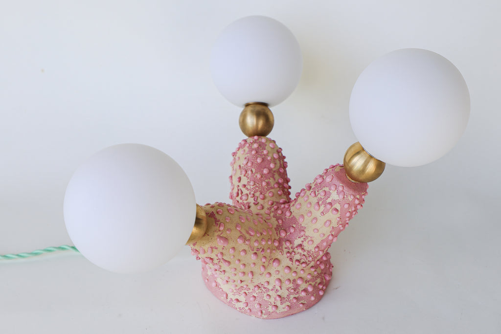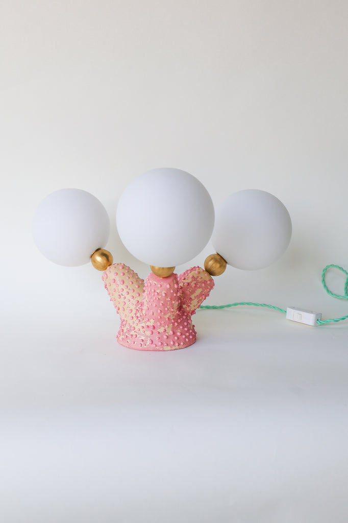 Hand-built from stoneware and glazed in a juicy, bubblegum-pink drip over soft pastel underglaze, the Pink Polyp Lamp is a one-of-a-kind table light that blurs the line between lighting and sculpture. Its clustered, organic form features three arched arms that seem to grow upward like sea creatures or surreal coral. Each branch ends in a raw brass ball and G9 socket, finished with frosted white screw-on glass globes that provide a soft, ambient glow.