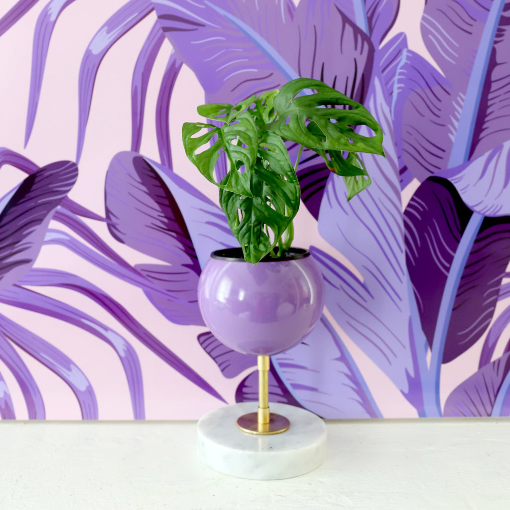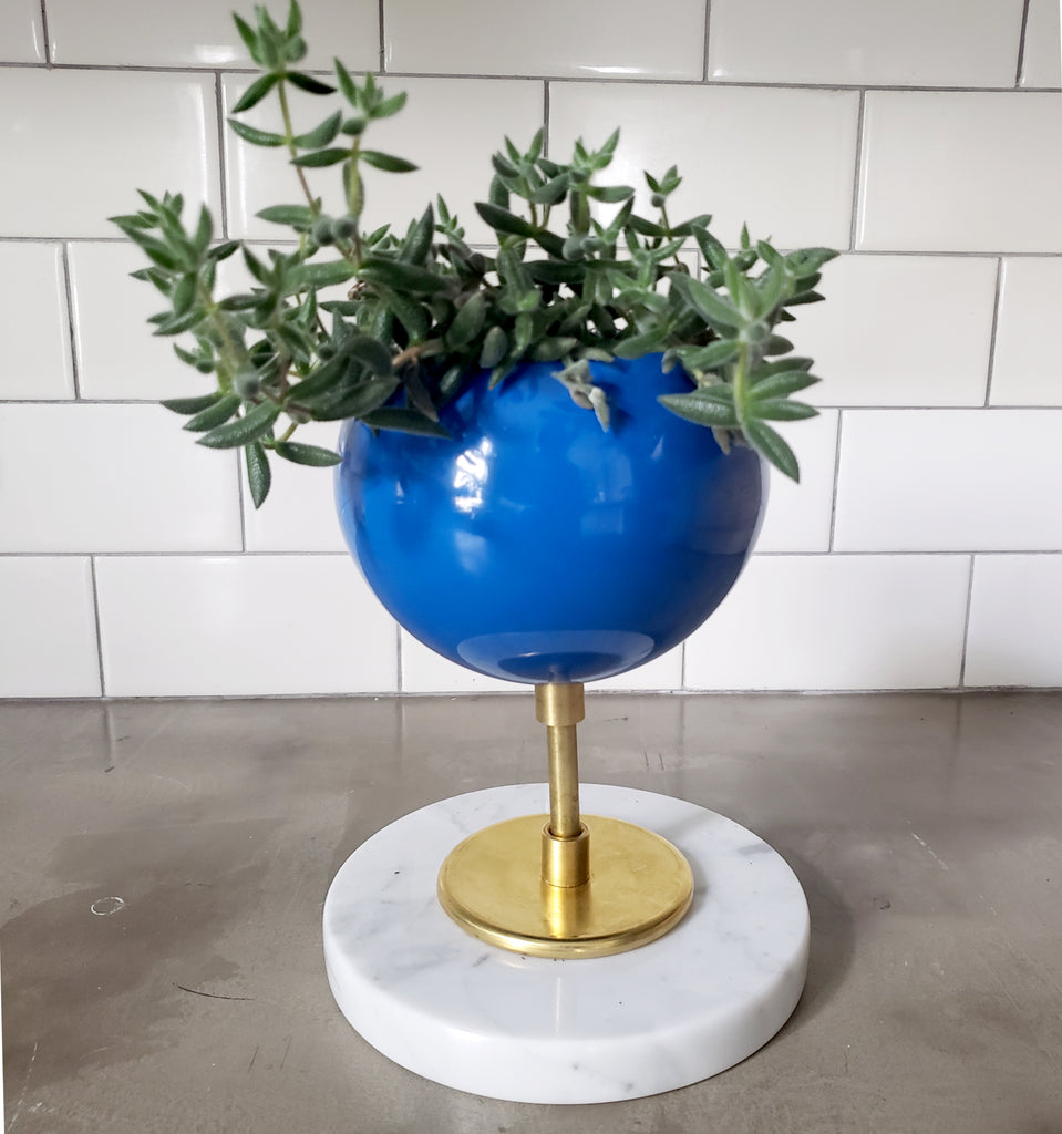 A modern, minimal planter with a colorful globe shade and a brass and marble base. You can style it with a plant or use it as a vase. This planter is made in New Orleans. No two are alike because of variations in the base tones and marbling.