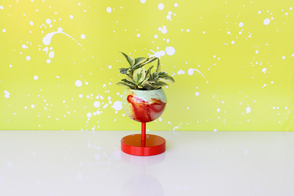 A modern raised planter with a globe shaped top that is hand marbled in mint and red-orange on a lifted red base. The planter is great for a windowsill plant, on a bathroom vanity or shelf, or as a small planter on a nightstand or dresser. It can be styled with a plant or used as a vase. There are no drainage holes.