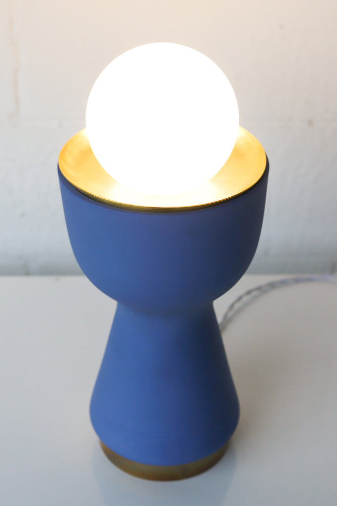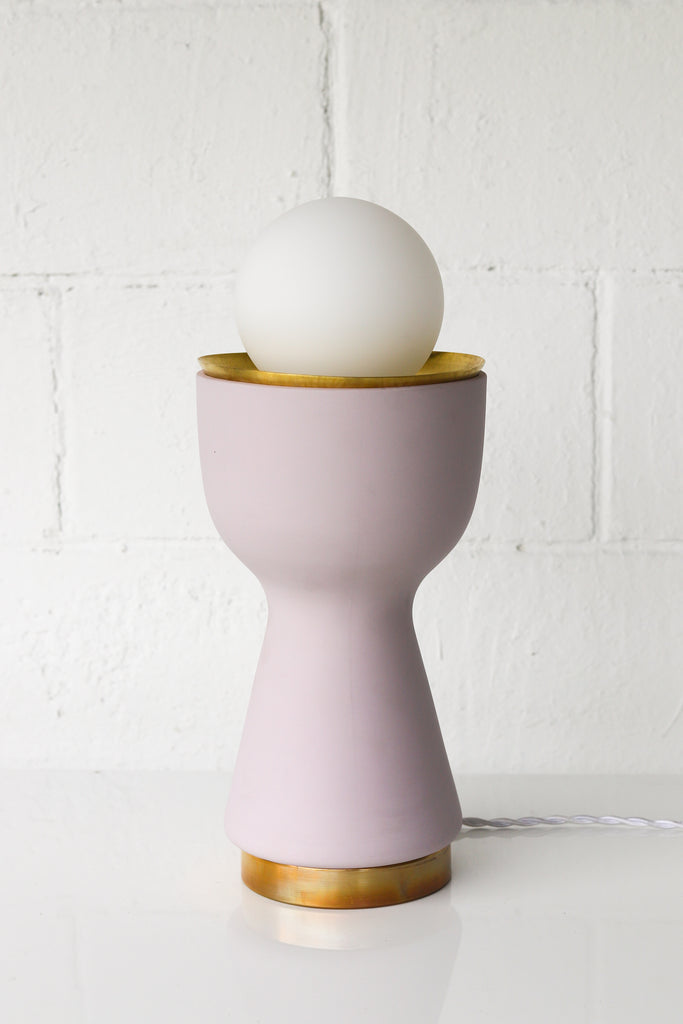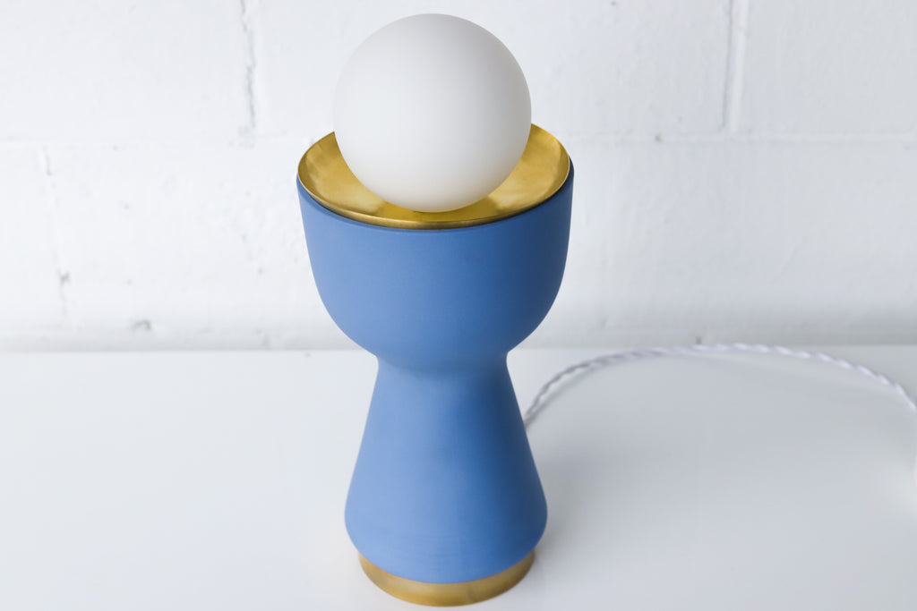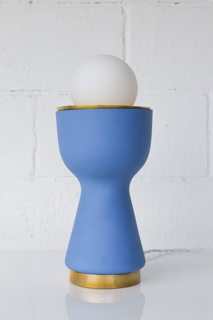 Introducing the Sculptural Margot Lamp – a meticulously crafted masterpiece that seamlessly blends refined elegance with timeless design. Available in three chic colors – blue, lavender, and cream – the lamp stands tall with a ceramic base and a brass foot, while a white frosted globe nestled in a brass bowl completes the ensemble. The ceramic portion of the lamp is slip-casted in small batches in Monroe, NC.
