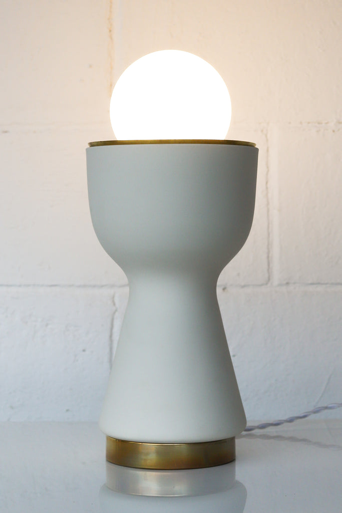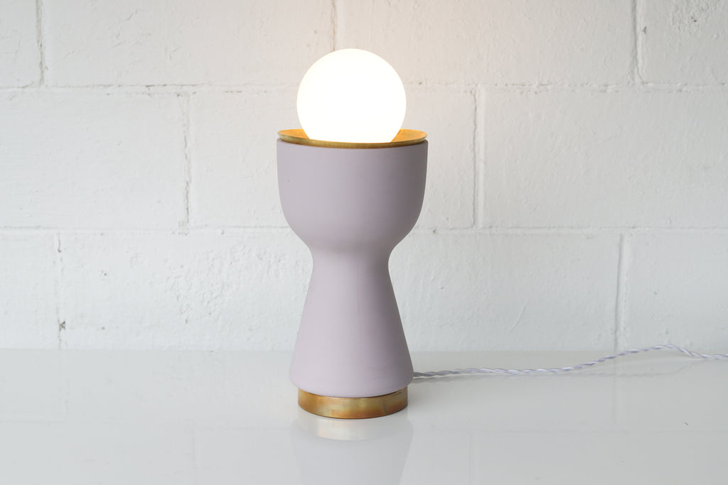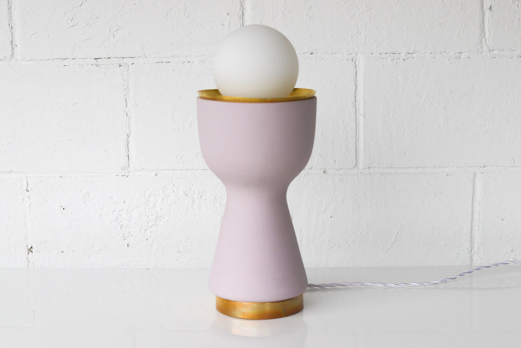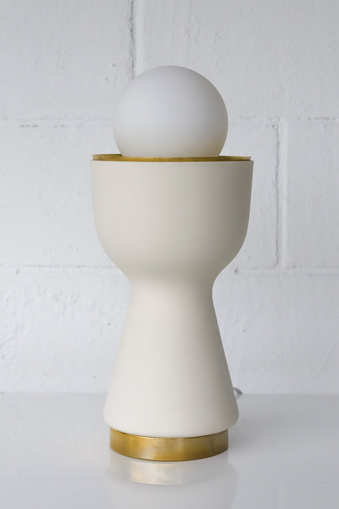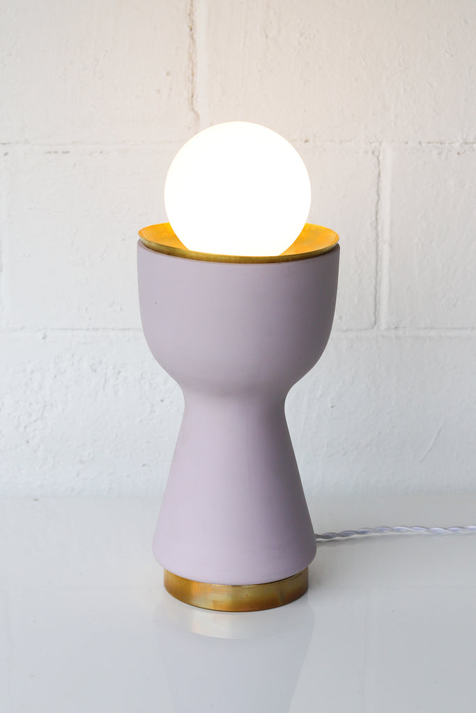 Introducing the Sculptural Margot Lamp – a meticulously crafted masterpiece that seamlessly blends refined elegance with timeless design. Available in three chic colors – blue, lavender, and cream – the lamp stands tall with a ceramic base and a brass foot, while a white frosted globe nestled in a brass bowl completes the ensemble. The ceramic portion of the lamp is slip-casted in small batches in Monroe, NC.