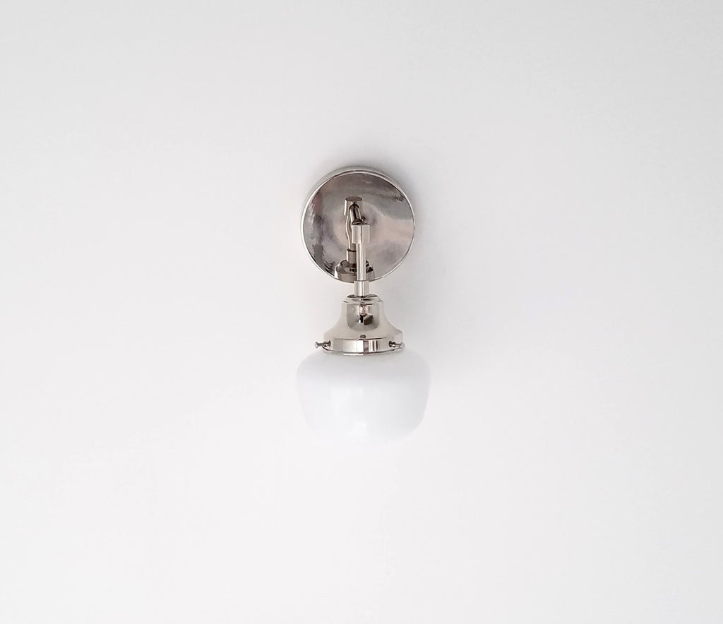 The Single McMain Schoolhouse Sconce has a vintage school house vibe, but updated. It has one socket with an opaque schoolhouse glass cover. The socket is standard sized (E-26/medium base). There are three finish options available: (1) raw brass, (2) chrome, and (3) matte black