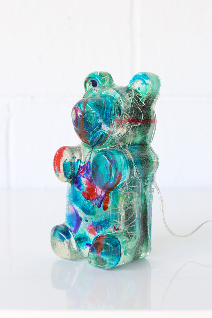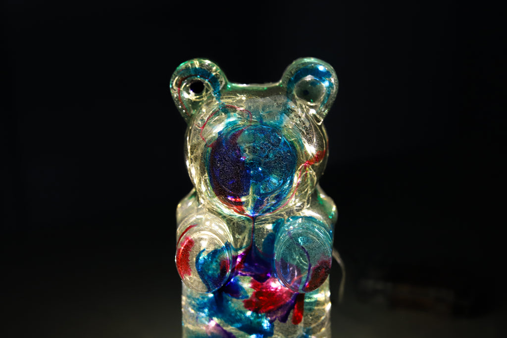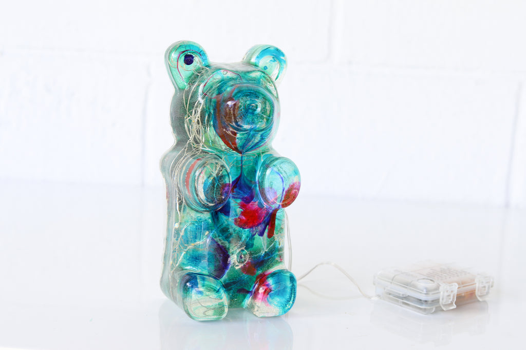 This adorable little Gummi Bear sculpture lights up mini LED bulbs through a small battery pack. This is a perfect gift for candy lovers, art lovers, children, and adults. Inspired by delicious candy treats, this resin gummi bear will bring smiles for years to come.