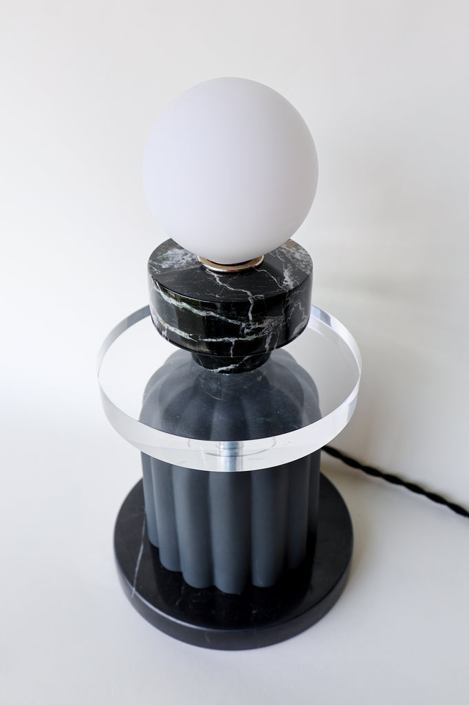 Part art object, part ambient light, The Orbit Lamp is a study in stacked geometry. Built from a curated stack of reclaimed and handmade materials, this piece plays with weight, contrast, and translucency. At its base, a matte, unglazed black ceramic form rises in fluted verticals—like a column in some alternate design universe. Above that: a thick, polished acrylic disc, a reclaimed black marble lamp part (possibly a base in a past life), and a frosted glass globe that glows like a soft moon when lit.