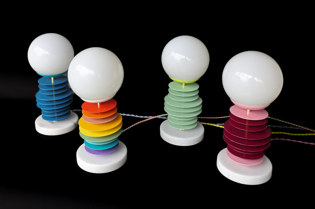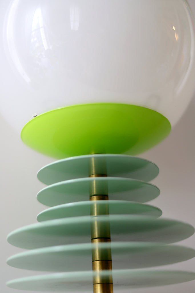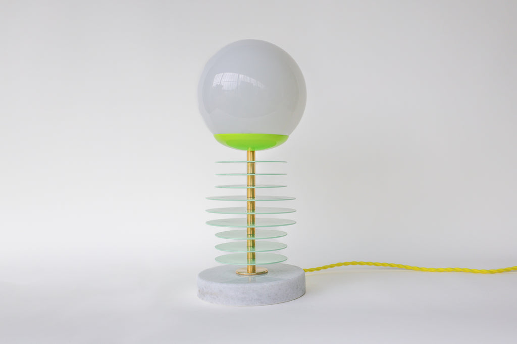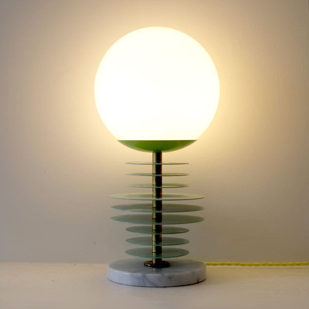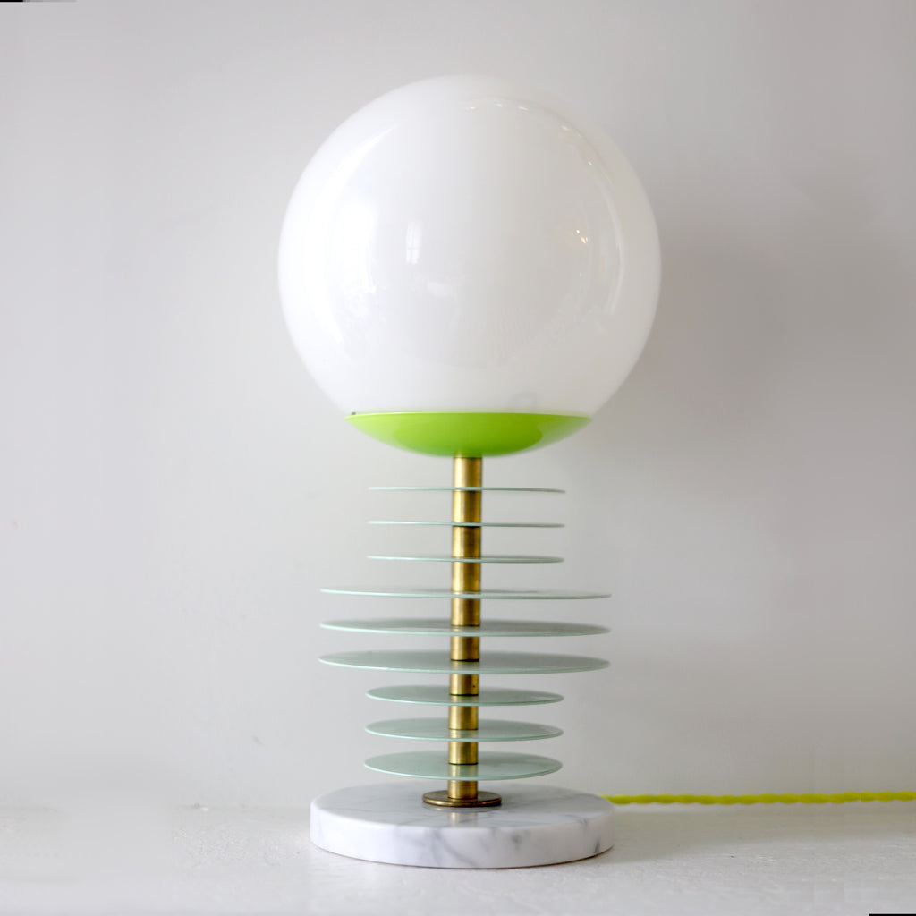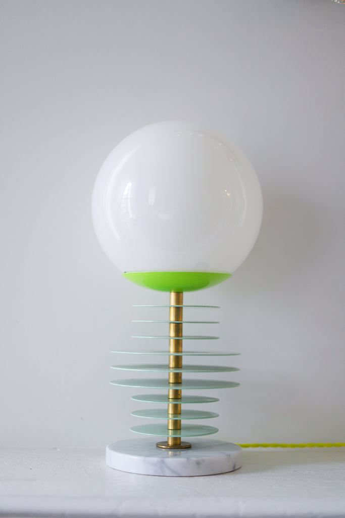 Drawing inspiration from layered op art, we played with positive and negative space to create the Vertebrale Table Lamp. In mint, chartreuse, and brass, the Vertebrale table lamp provides ample ambient lighting and a sculptural element to your decor.