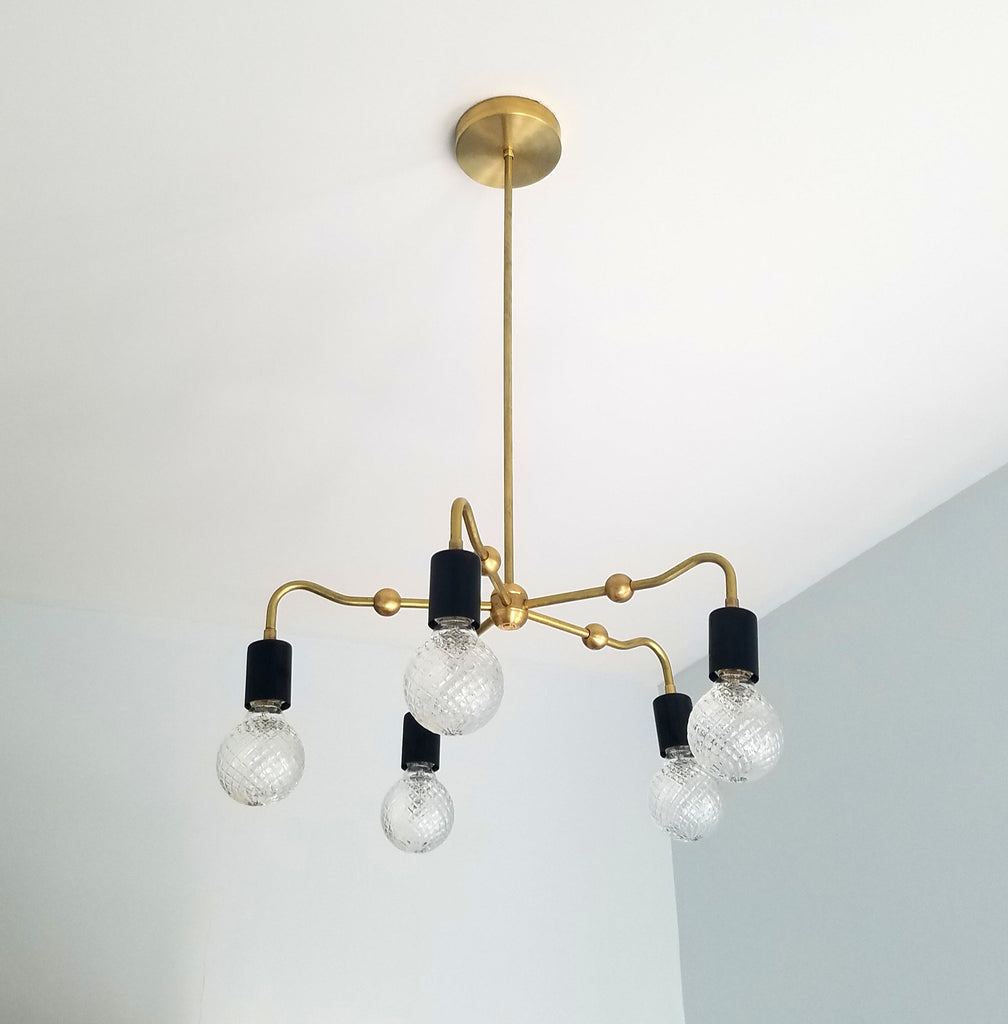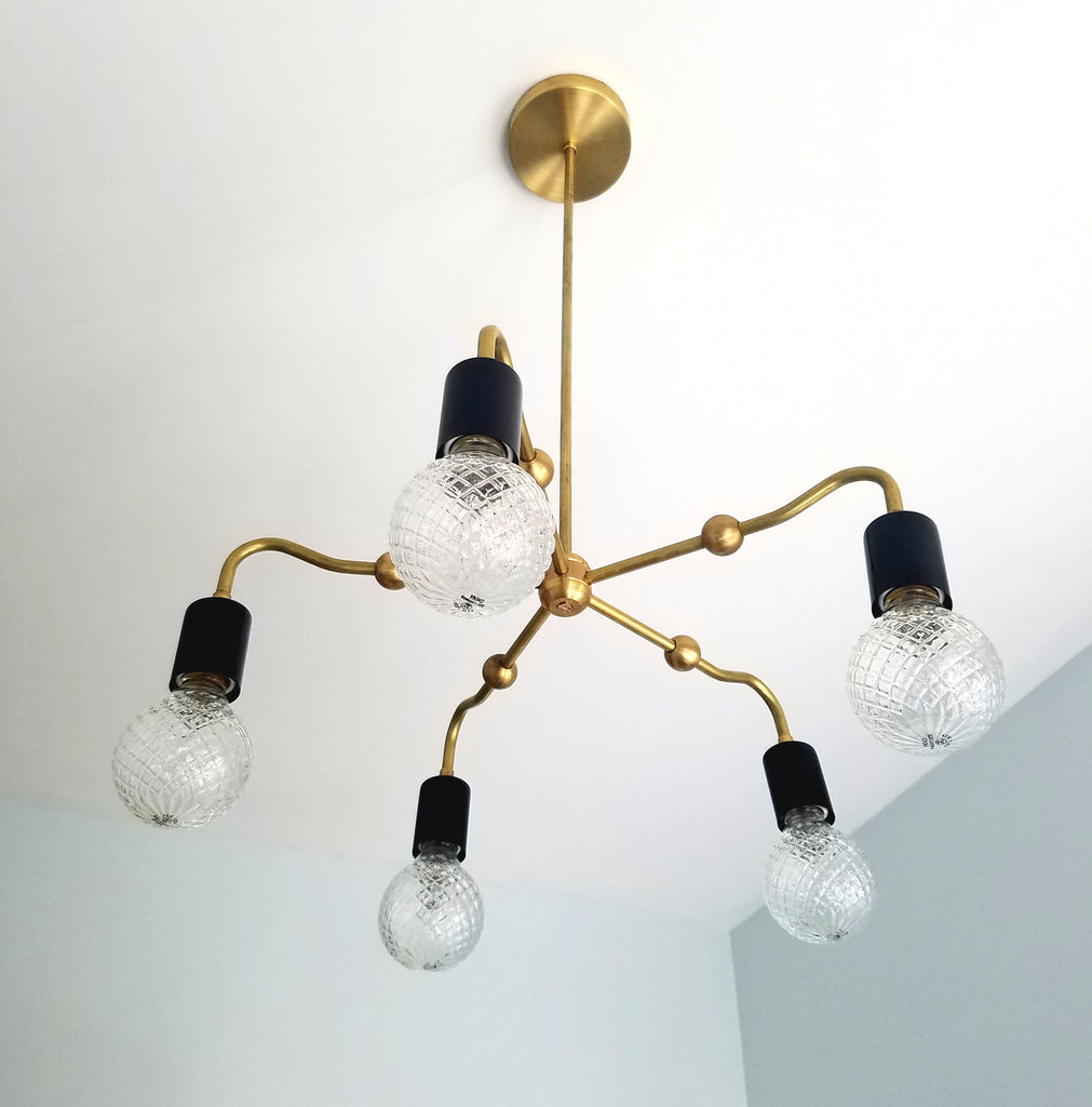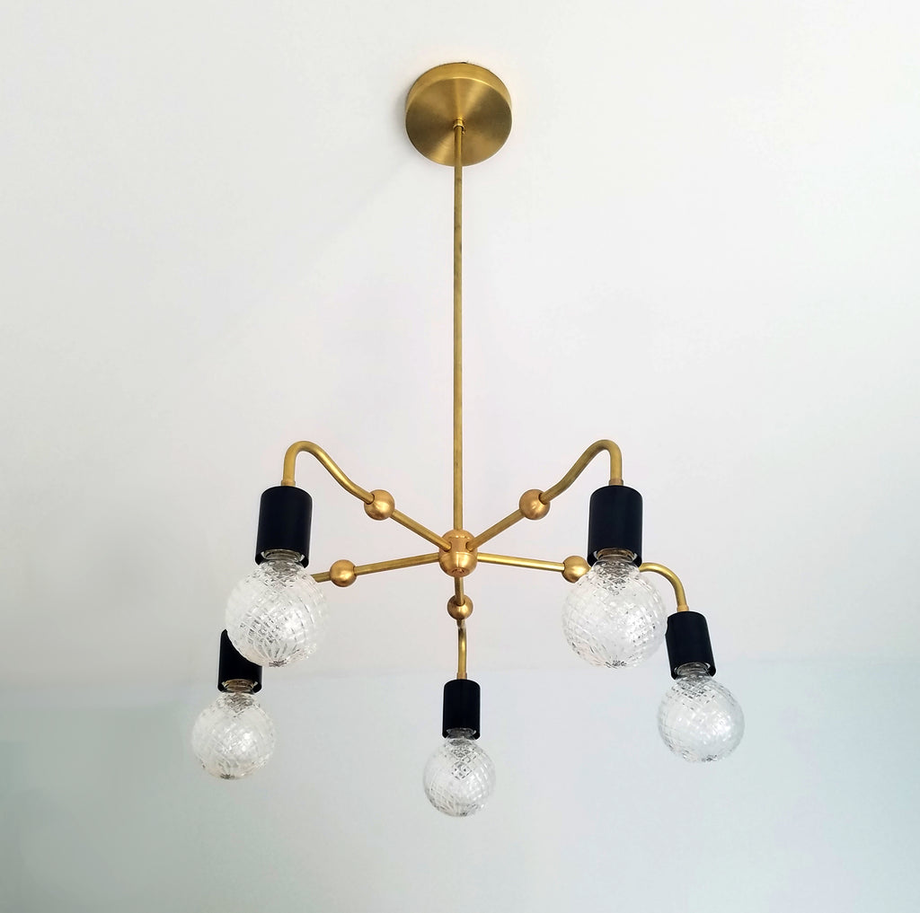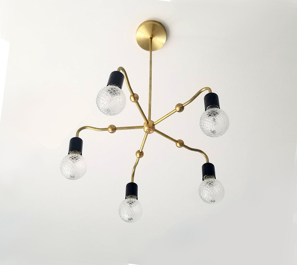 The Meric chandelier is inspired by art deco design. With it's five curved arms, this fixture would be perfect in a dining room or bedroom aline. Additional colors may be available upon request.