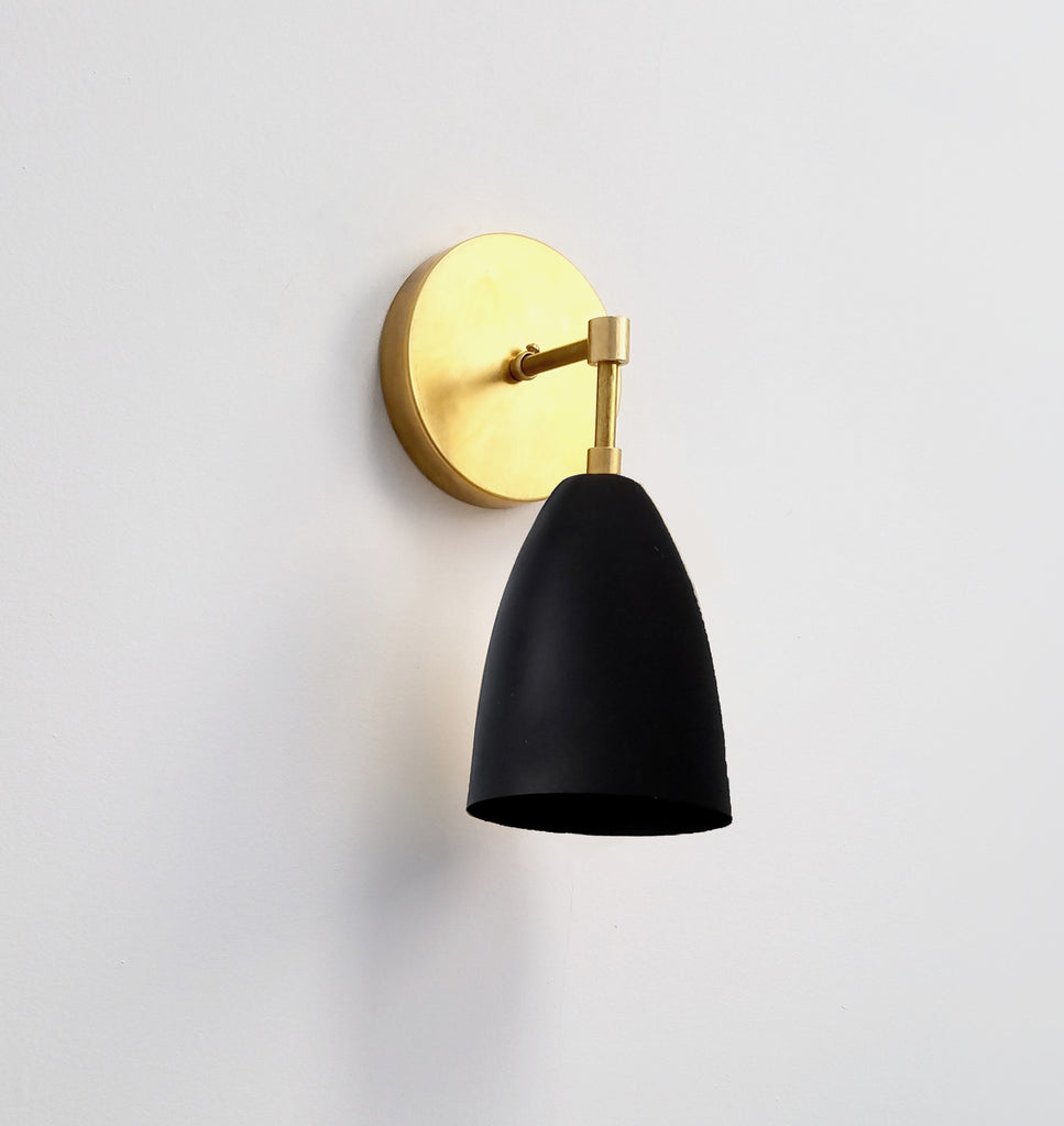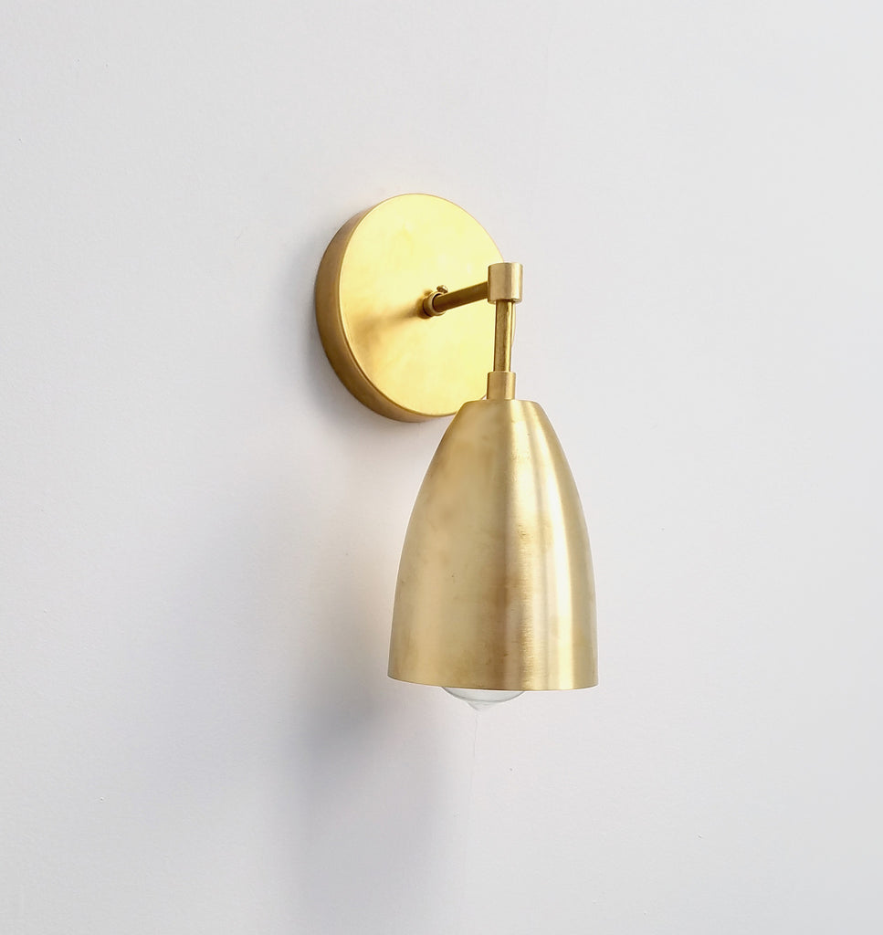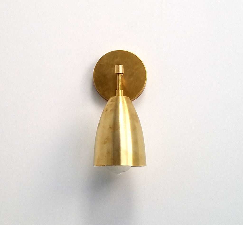 The Michoud sconce is a simple cone shaped wall sconce. It has a single E26/medium base sockets. This fixture comes in three finishes, brass, chrome, and black/brass. The raw brass will develop a patina over time or can be polished occasionally to retain it's beautiful brassy sheen. We love these sconces as a pair in a bathroom remodel or in a long hall as accent lighting. The fixture can be installed with the cone facing up or down.