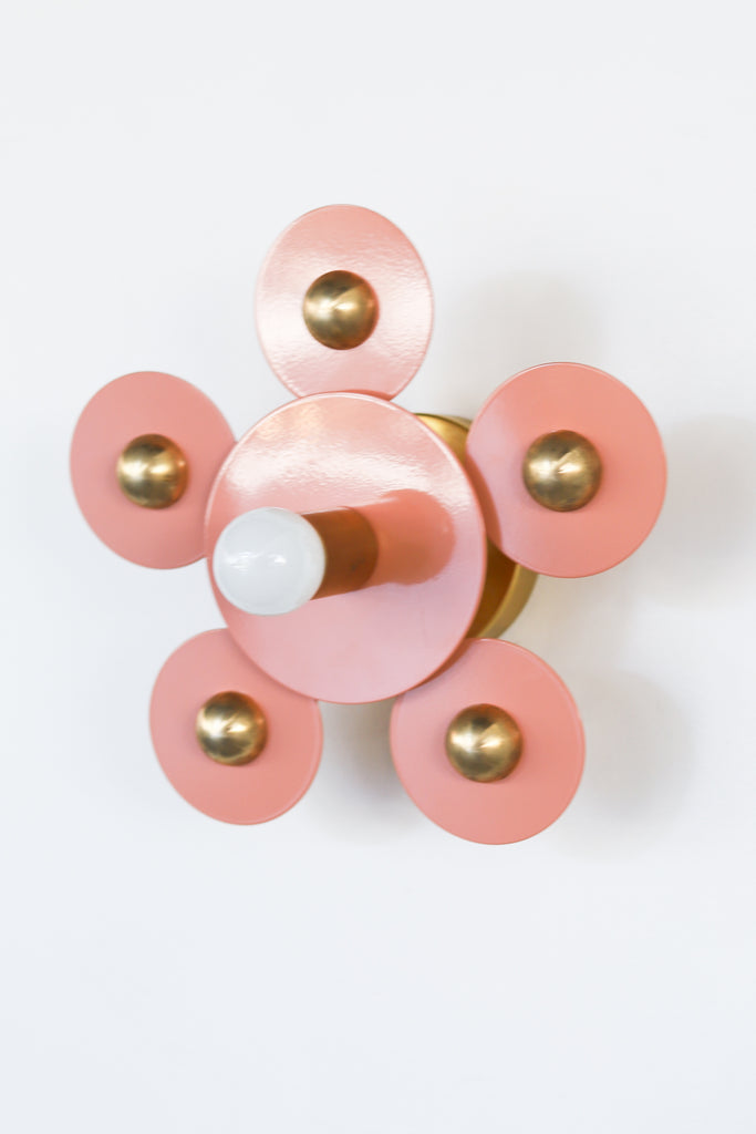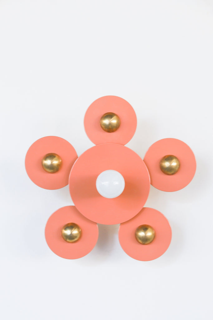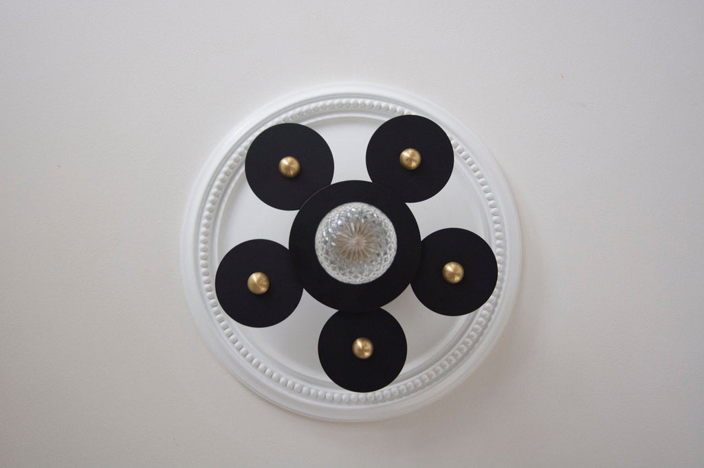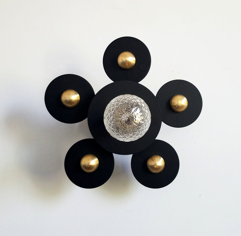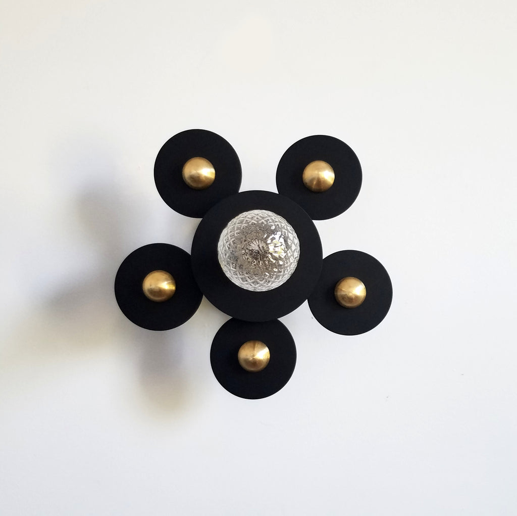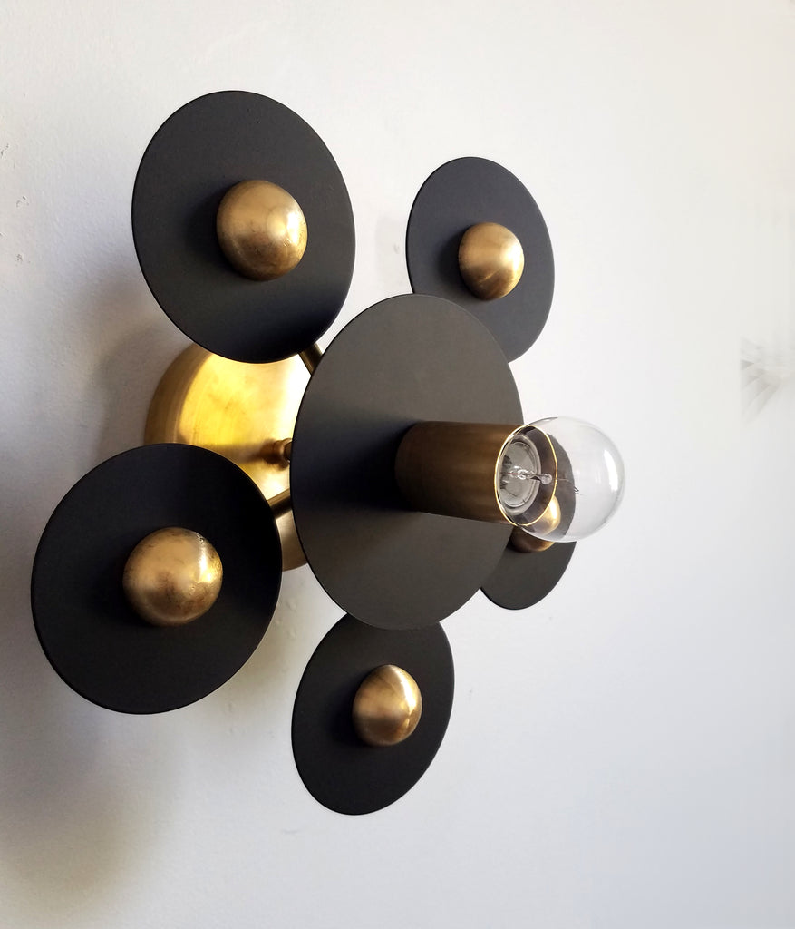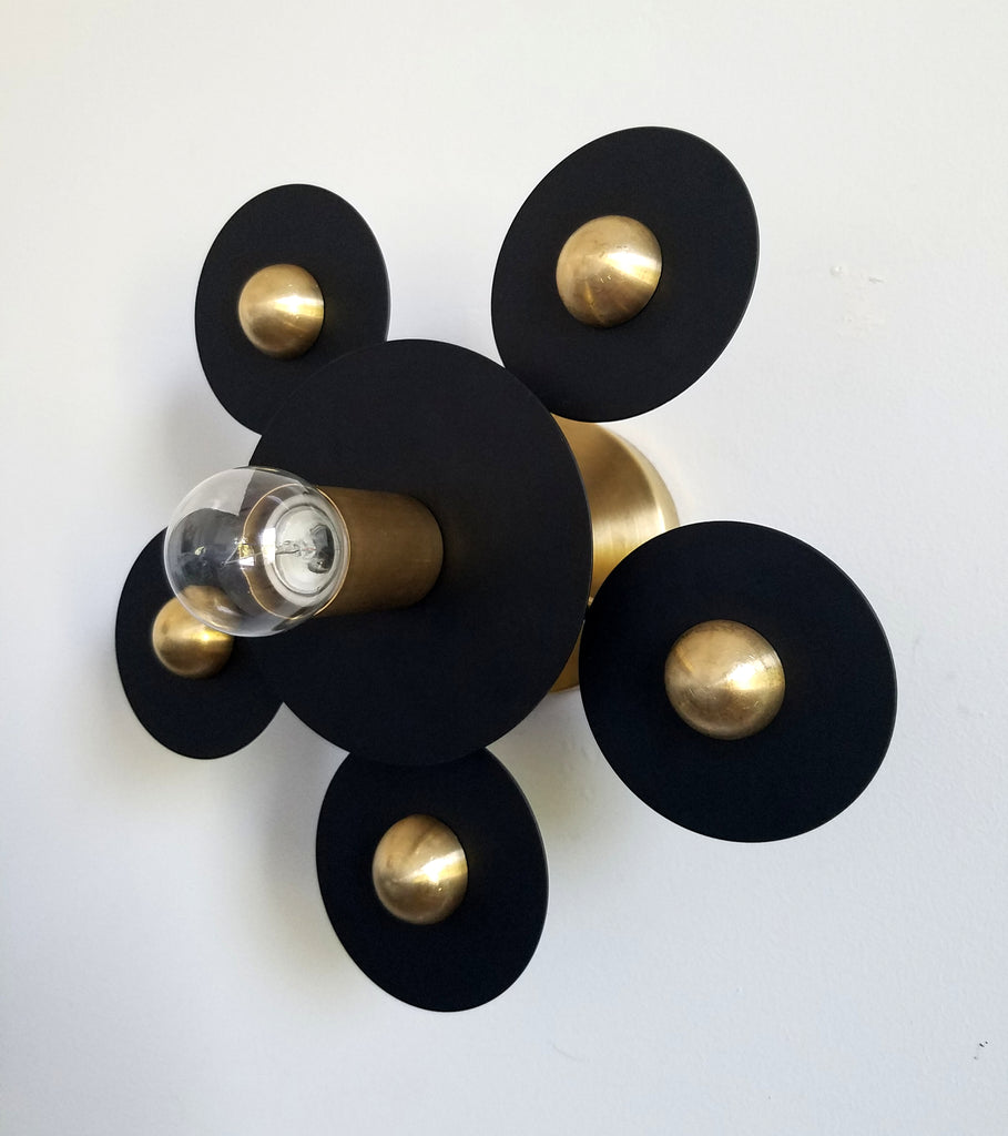 Matte black metal circles with gold discs spotlight a single bulb. This simple sconce or flushmount can highlight the beauty of the bulb chosen or can stand on its own with a simple bulb choice.