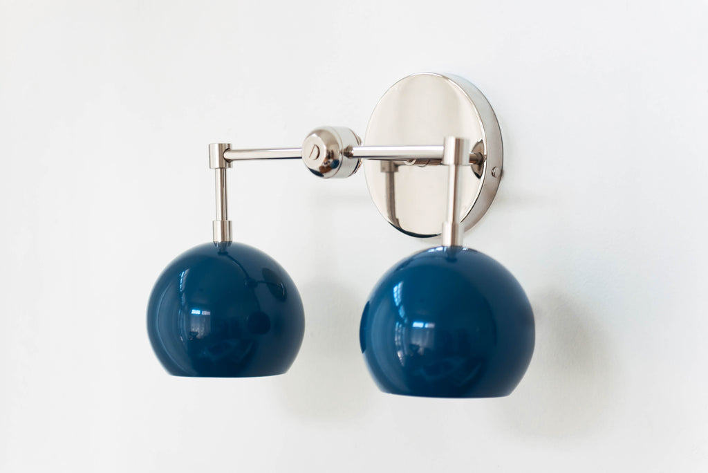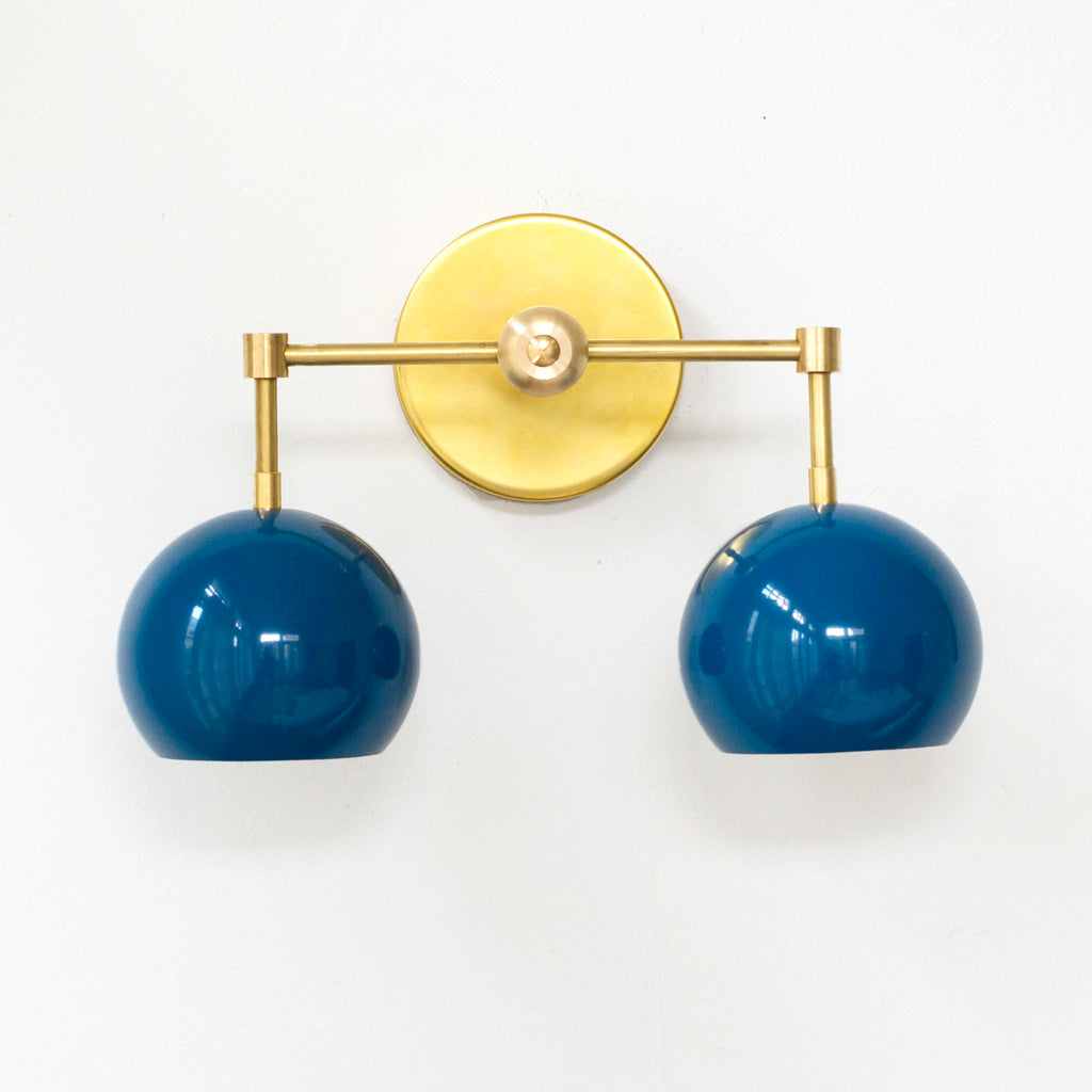 The Double Loa Sconce has a simple, minimalist design that can be fun or modern. Either way, it is bound to garner loads of compliments. This fixture is a two-light version of our single Loa sconce. The shades are globe-shaped and powdercoated in a Denim color.