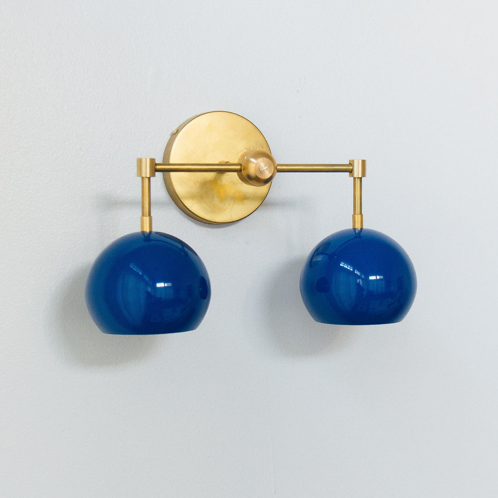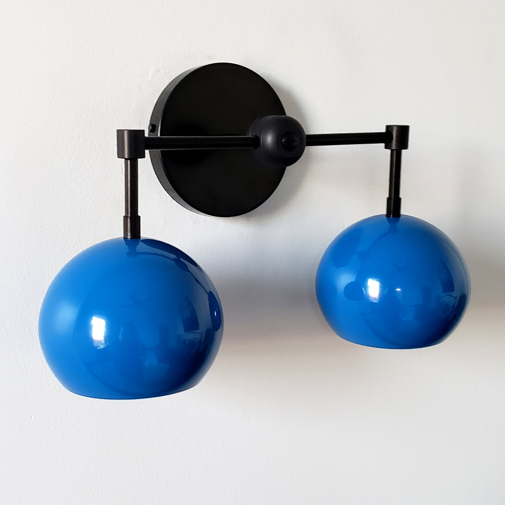 The Double Loa Sconce has a simple, minimalist design that can be fun or modern. Either way, it is bound to garner loads of compliments. This fixture is a two-light version of our single Loa sconce. The shades are globe-shaped and finished in a Mediterranean Blue Enamel.