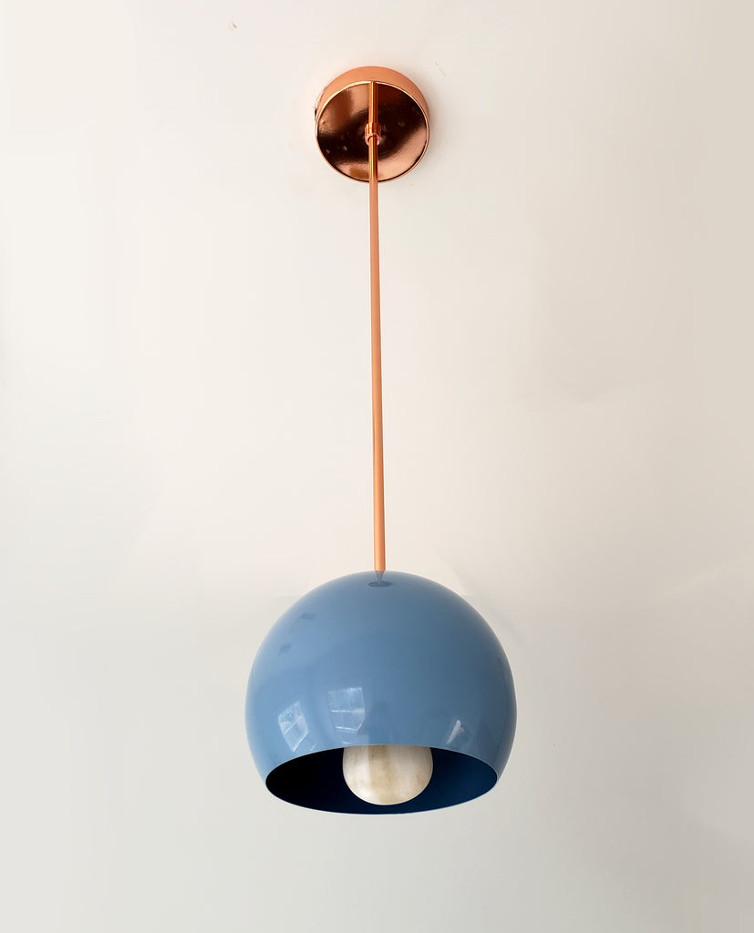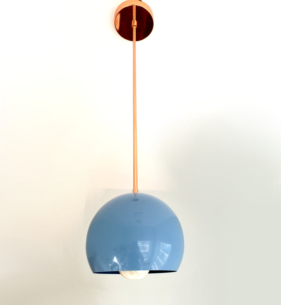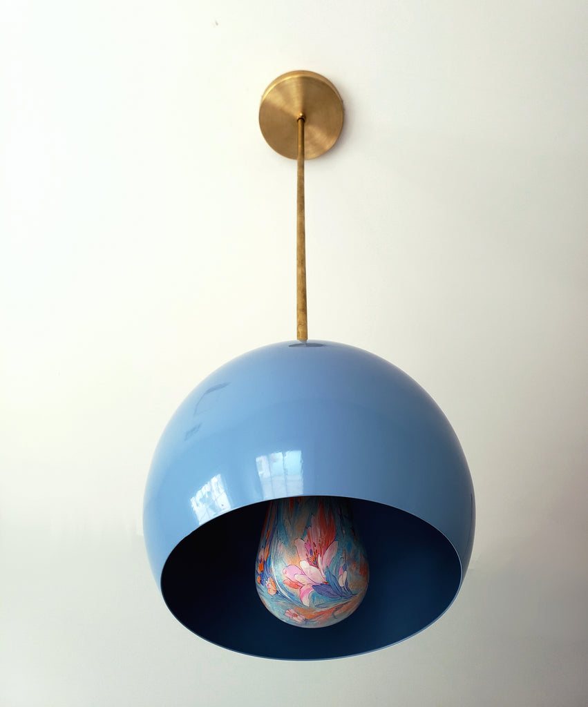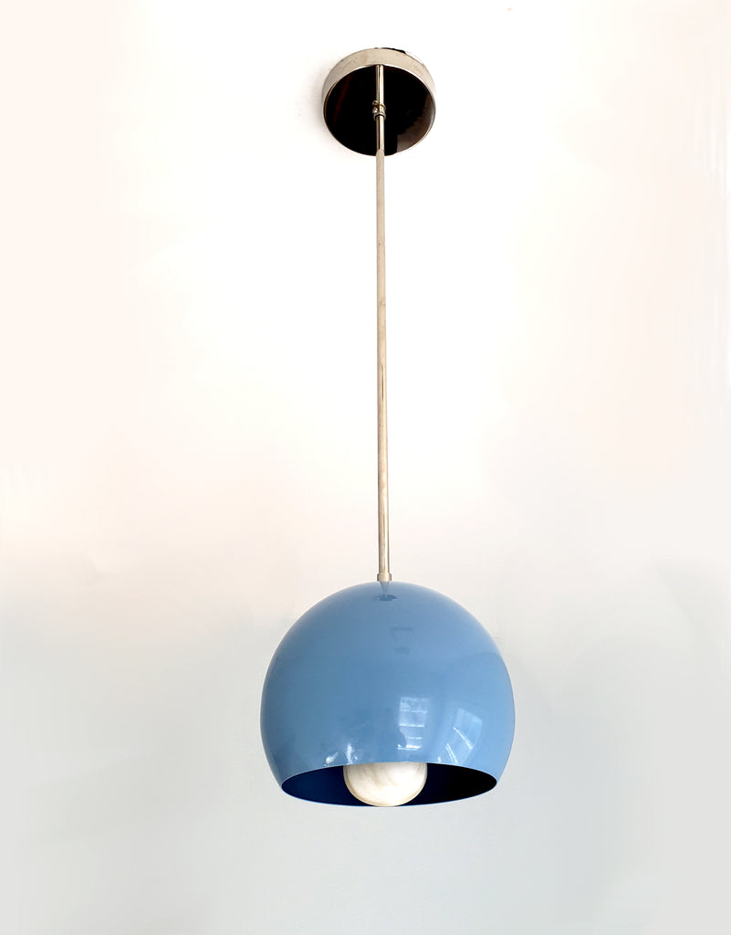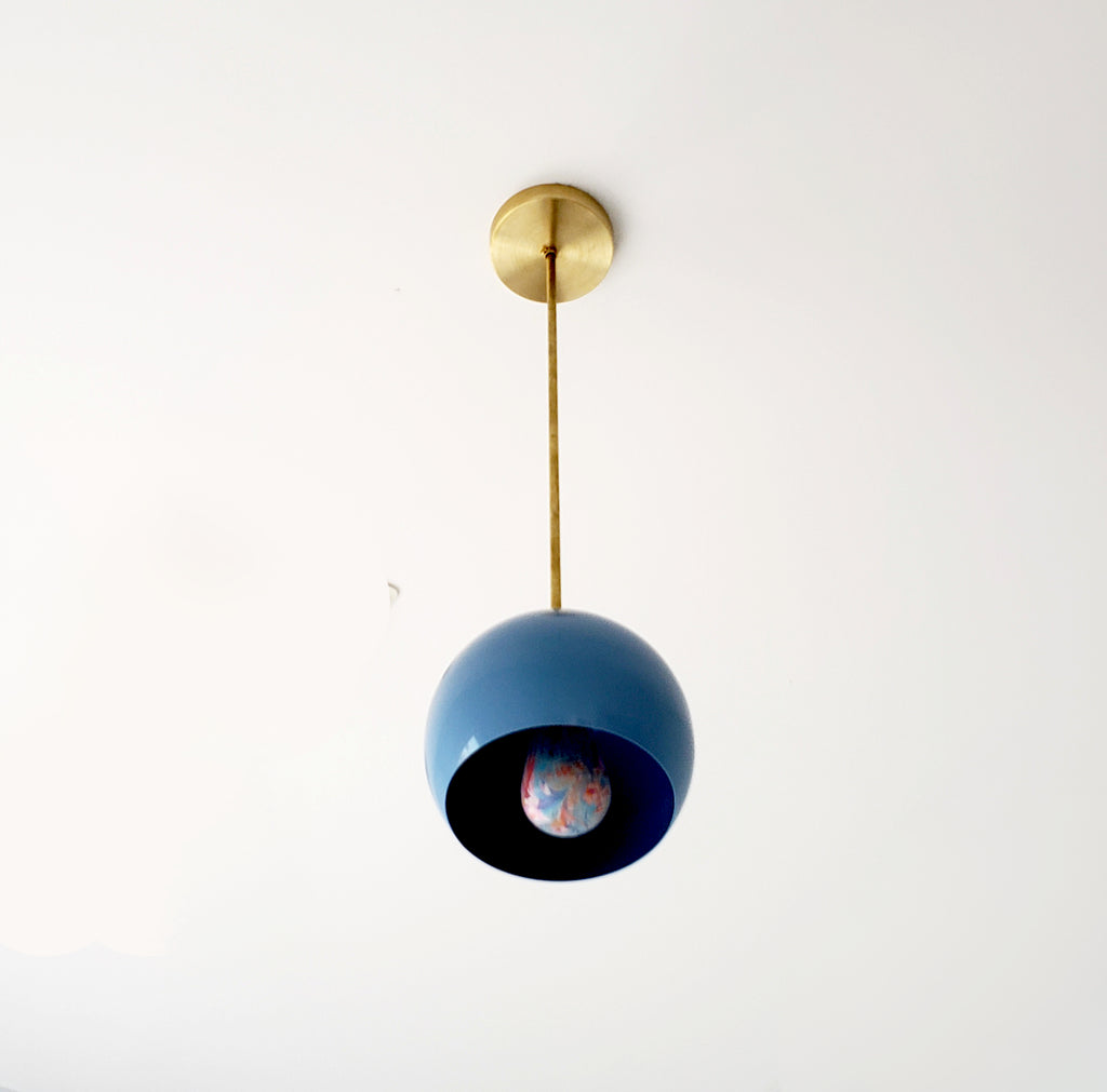 The Large Loa Pendant with a Hydrangea Blue Shade shade is a simple, globe shaped pendant available with multiple metal finishes to suit any design style. Each pendant comes with three downrod options: 24 inches, 18 inches, and 12 inches. If a specific length is needed instead, contact us.