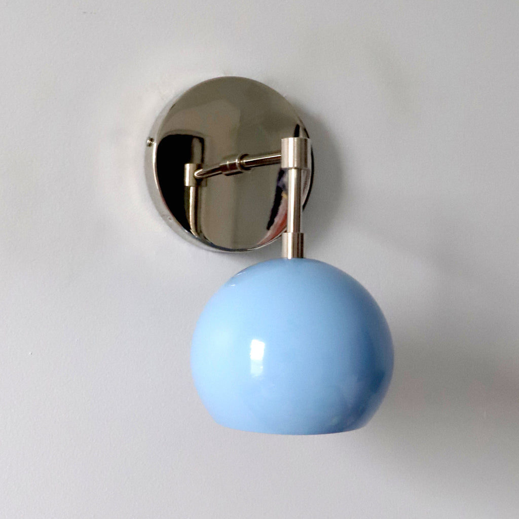 Beautiful mid-century modern inspired sconce featuring a globe-shaped pale blue shade in our Celestial Blue Color. The sconce is available with complimentary metal finish of brass, chrome, matte black, or copper. This simple sconce can work as accent lighting, bathroom, lighting, or to illuminate wall art. This sconce features one E26 / medium screw base socket.
