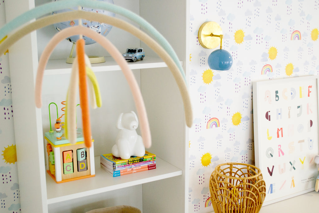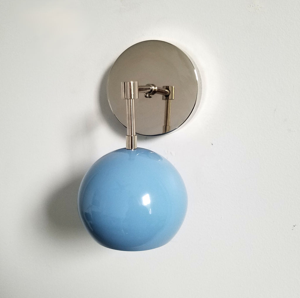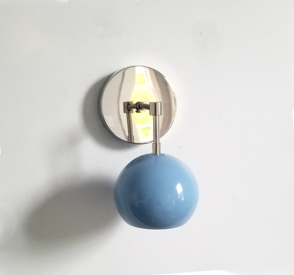 Beautiful mid-century modern inspired sconce featuring a globe-shaped Hydrangea Blue shade with complimentary metal finish of brass, chrome, matte black, or copper. This simple sconce can work as accent lighting, bathroom, lighting, or to illuminate wall art. This sconce features one E26 / medium screw base socket.