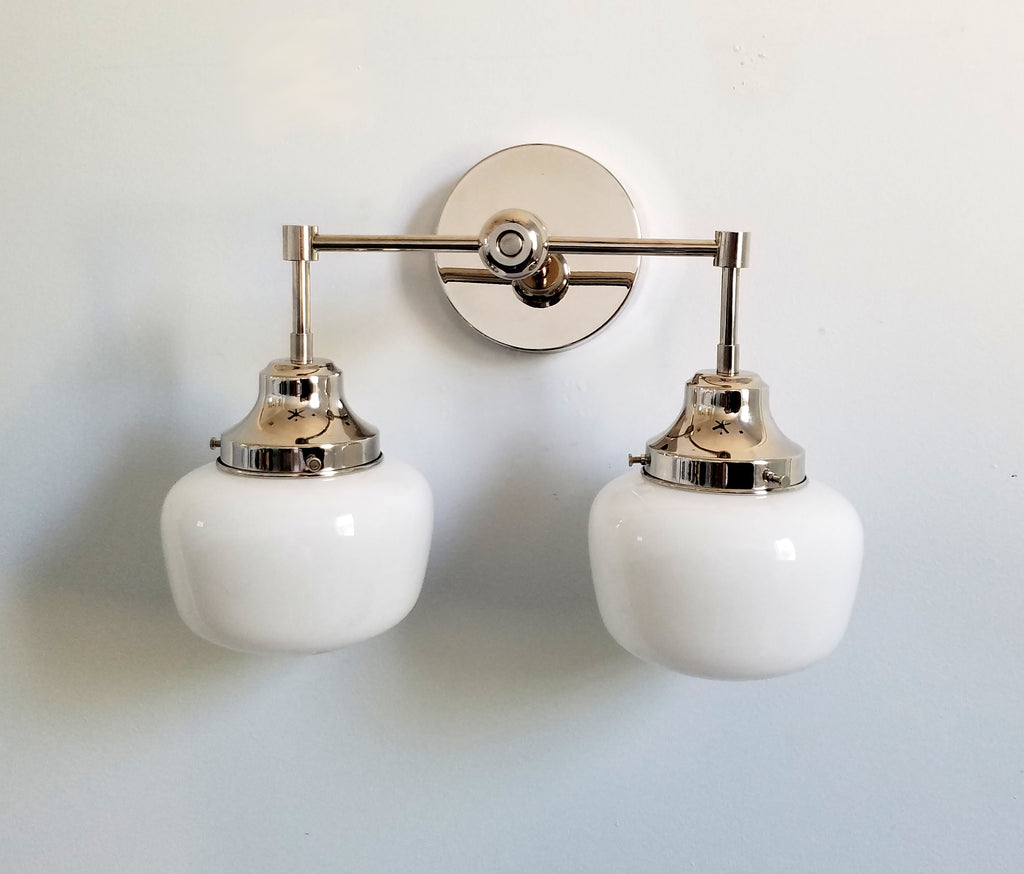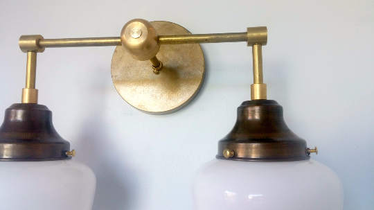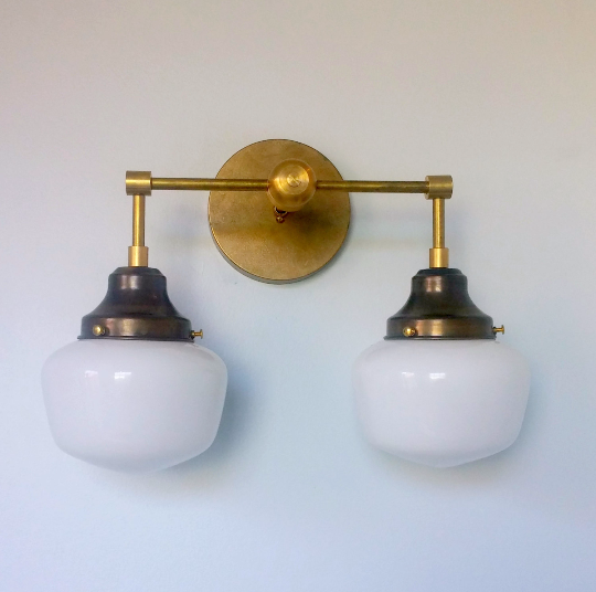 This simple sconce add a timeless, vintage school-house style anywhere in the home, especially when over a bathroom vanity or lining a hallway. This duel-glass sconce is best hung horizontally over a bathroom mirror. It comes in 3 finish options: raw unfinished brass, chrome, or matte black coated metal.