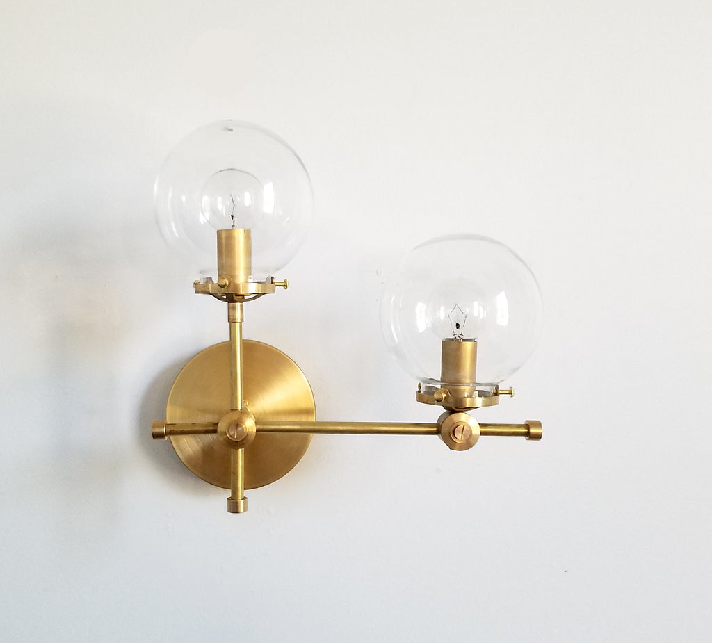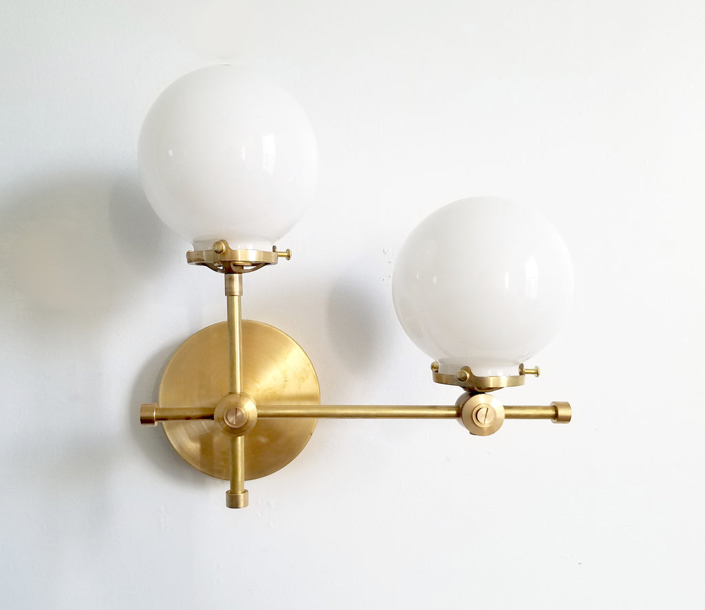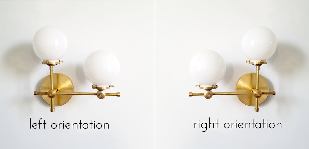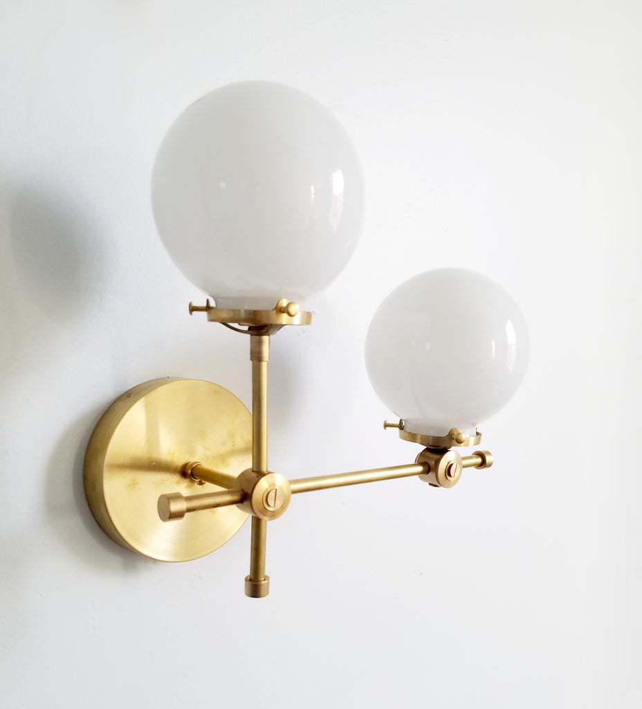 This asymmetric fixture is perfect for the space that is complicated. It comes in either a raw brass finish or a mirror-like chrome finish. It comes with two hand-blown glass covers that are available in clear or glossy white. Because the glass is handblown, there are occasional bubbles or "waviness" in the glass.