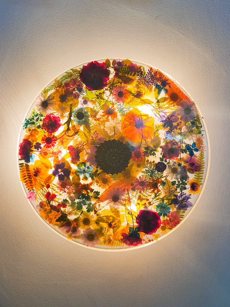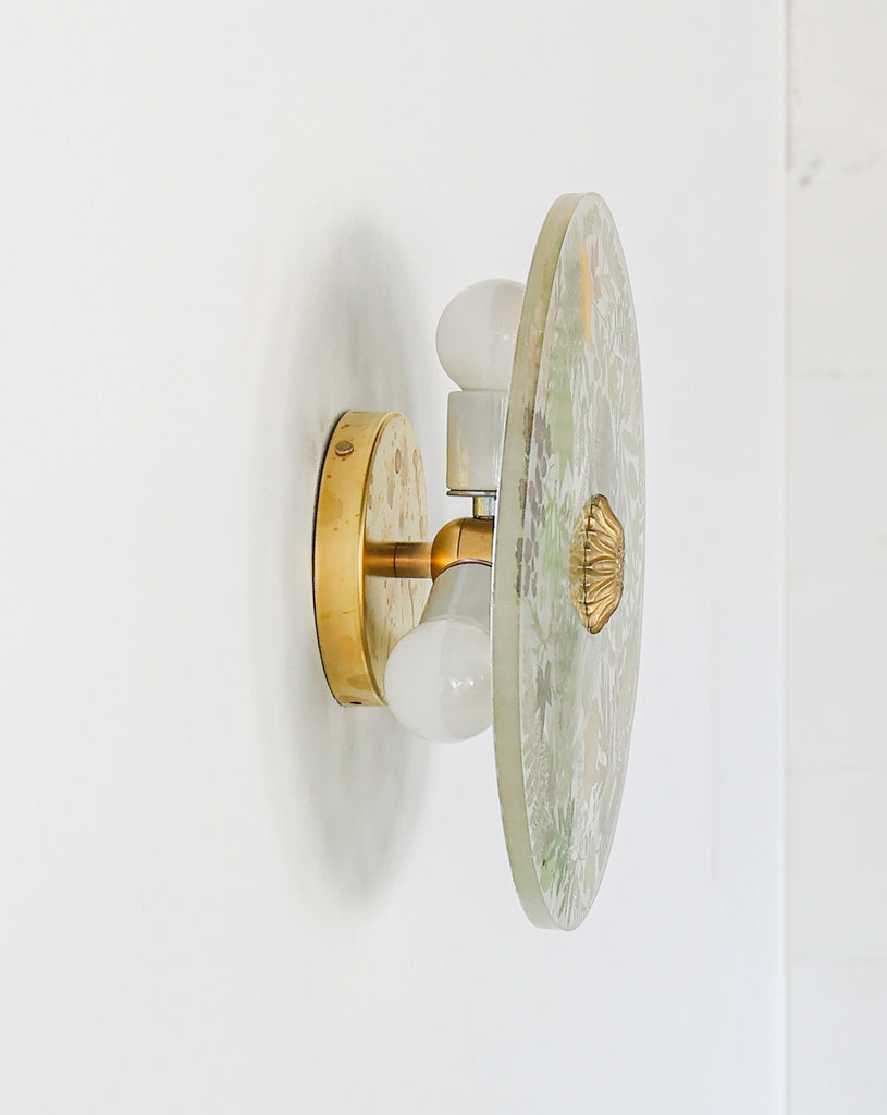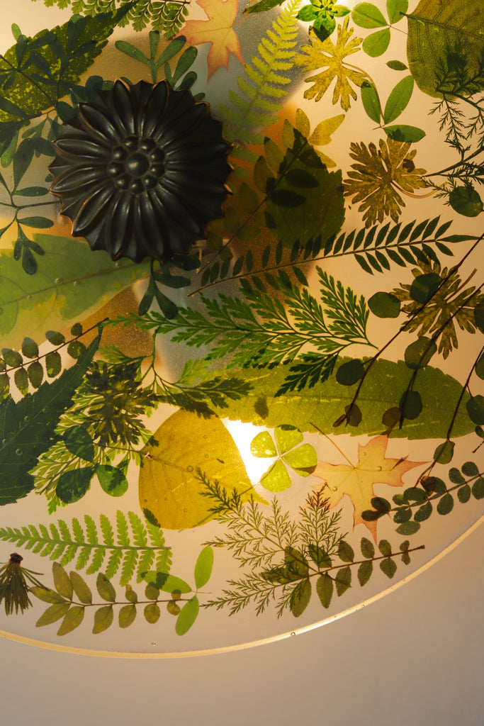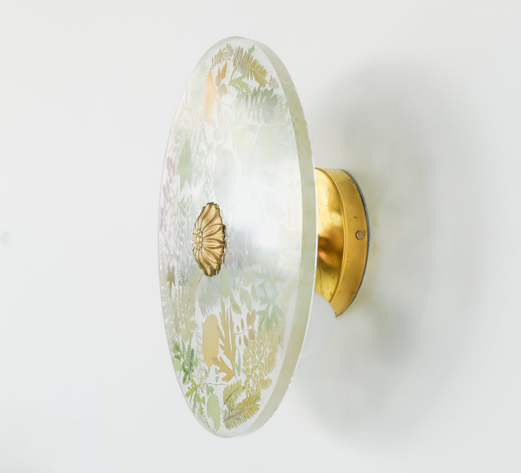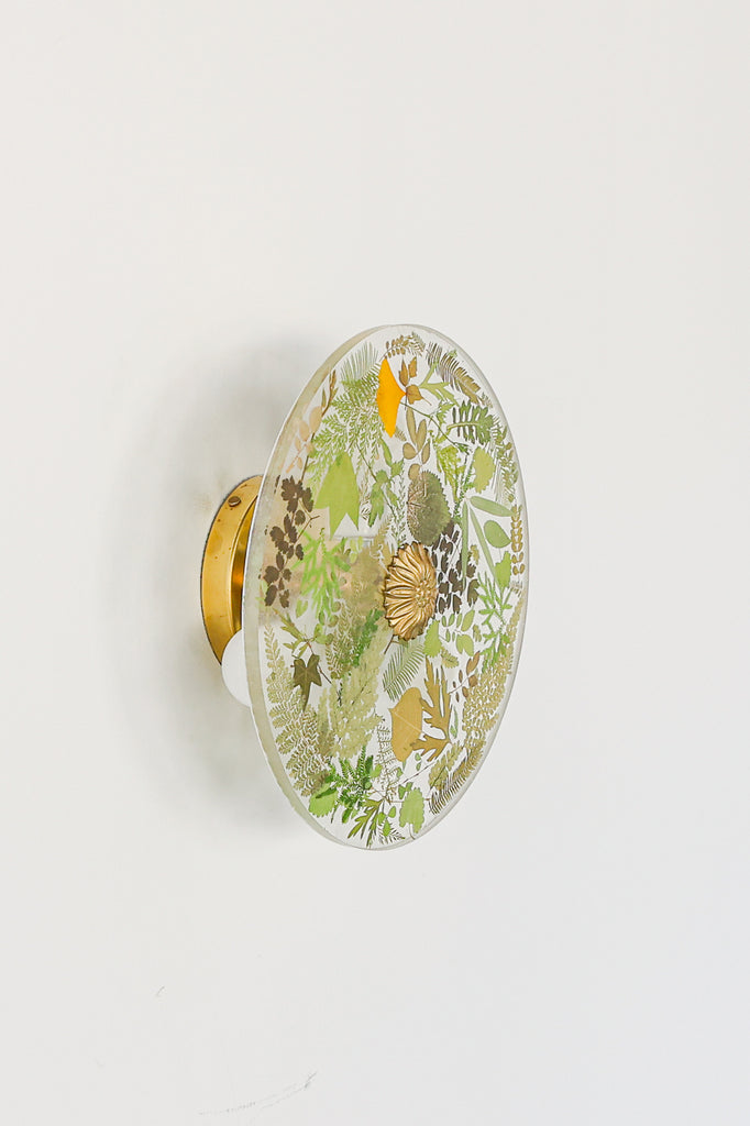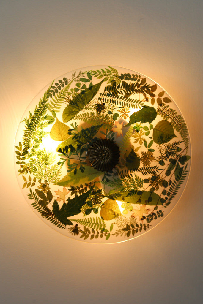 This beautiful sconce or flushmount offers a unique way to bring botanical elements into your décor. The handmade disc features real dried leaves or flowers encased in resin. This romantic fixture is perfect as accent or ambient lighting as a single fixture or as part of a larger installation.