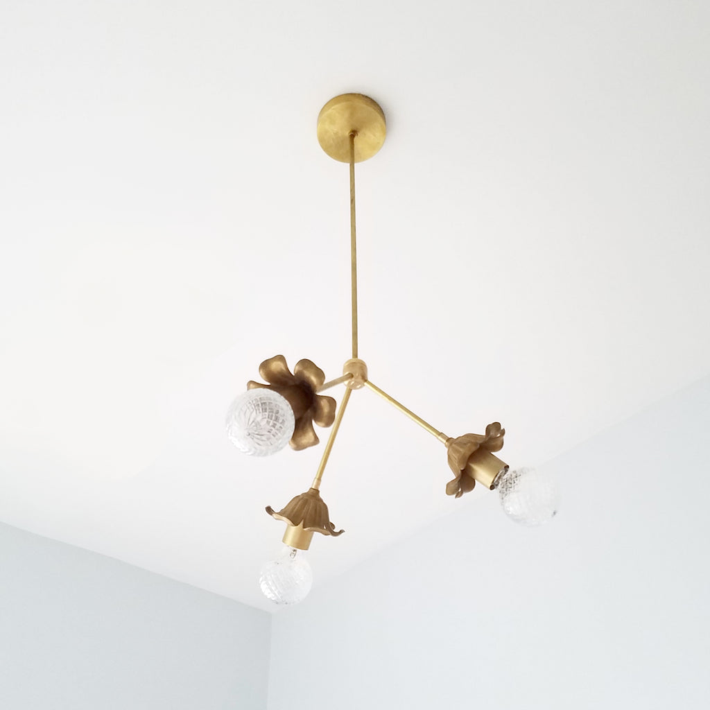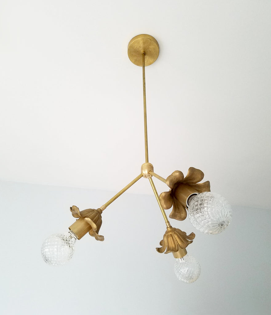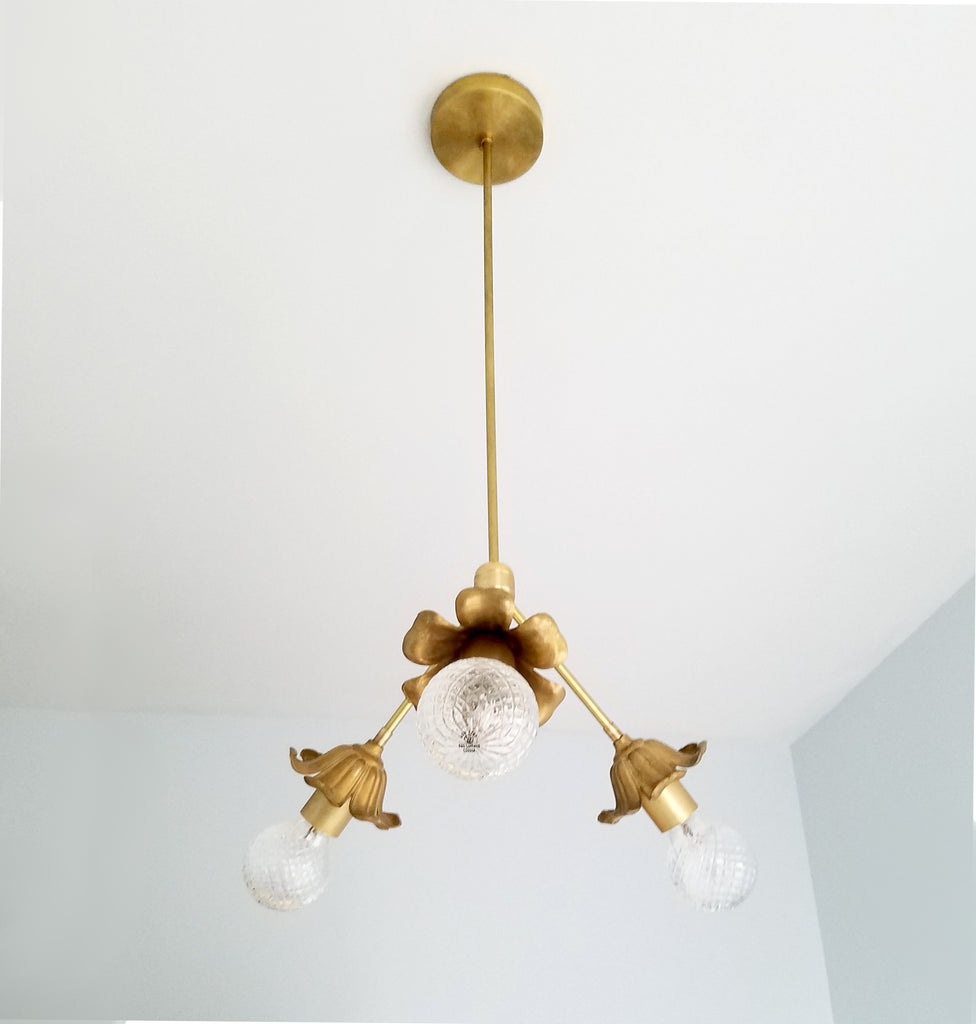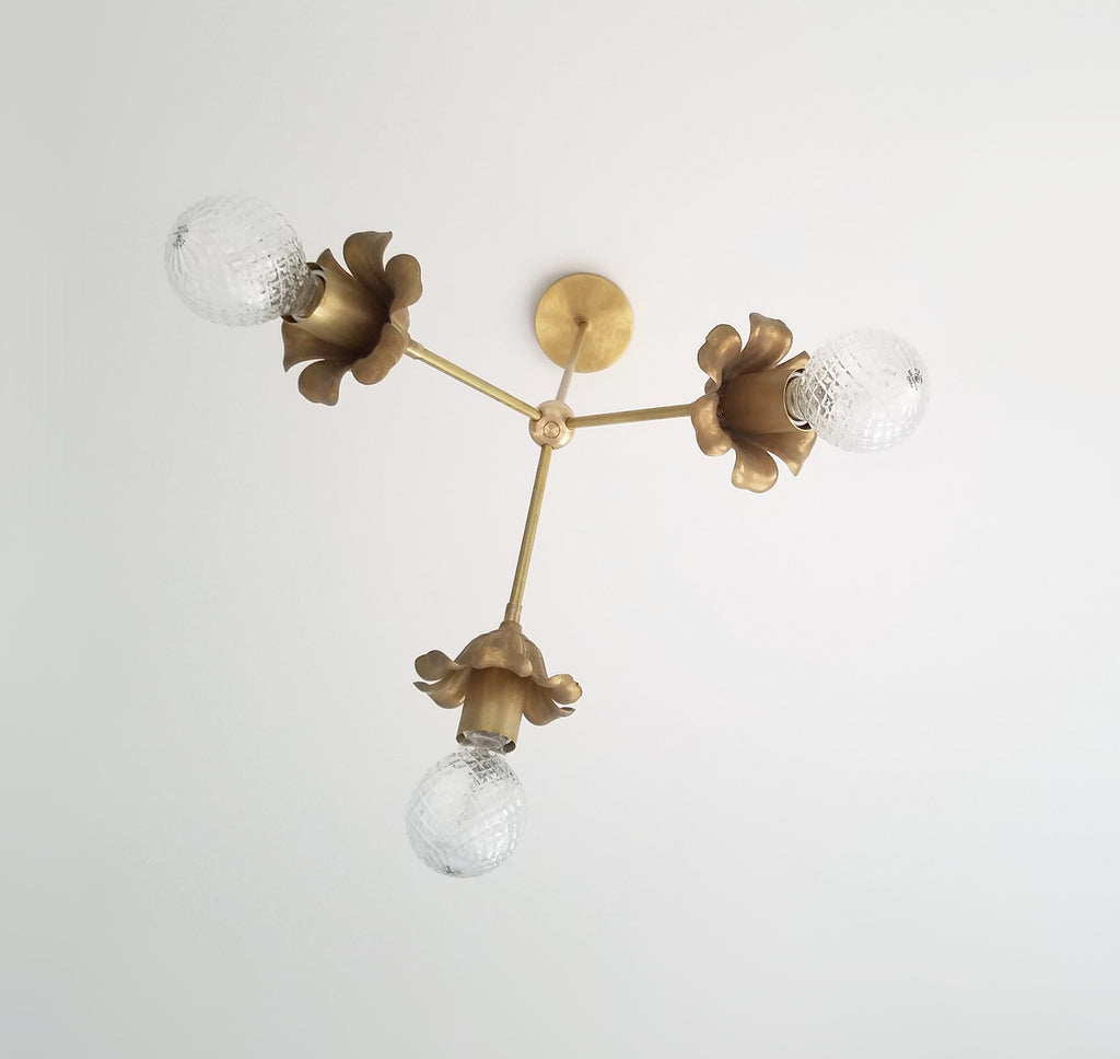 A romantic brass chandelier featuring 3 large floral cups. Multiple downrod lengths are available. The size menu below refers to the downrod length. So a length of "0 inches" means the fixture is a flushmount.