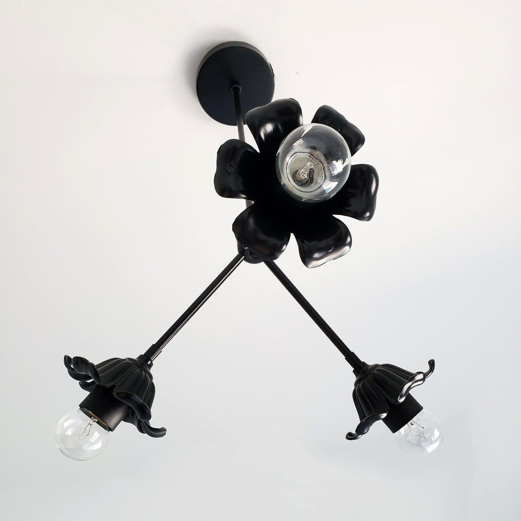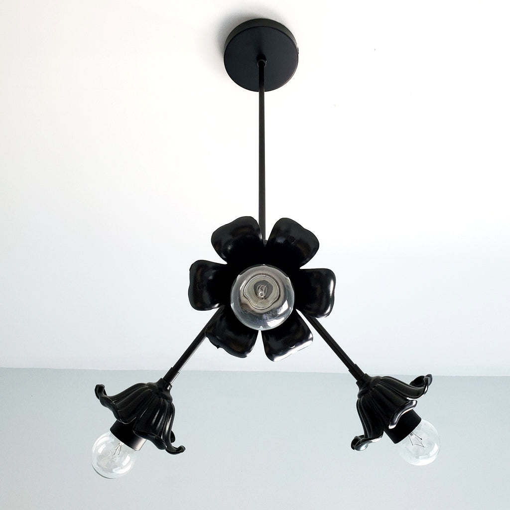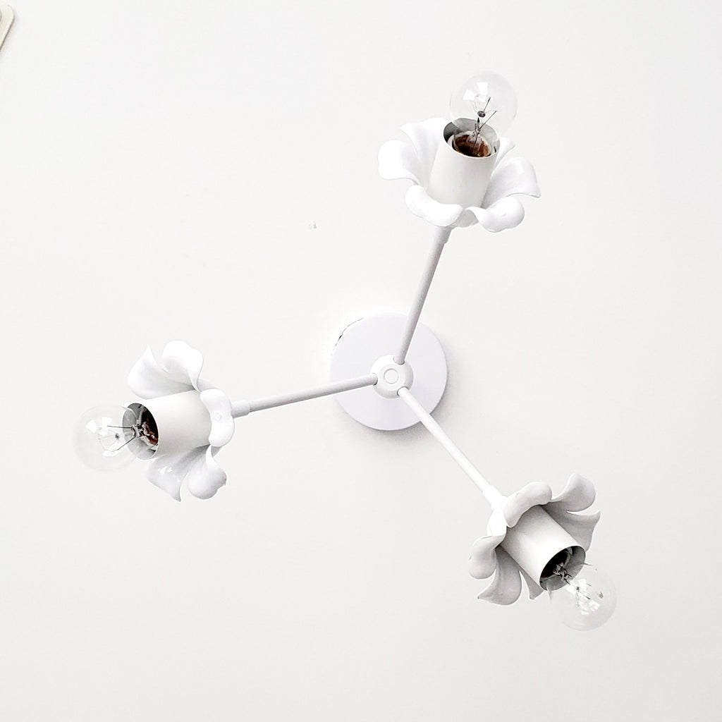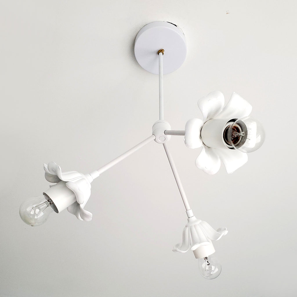A romantic brass chandelier featuring 3 large floral cups. Multiple downrod lengths are available. The size menu below refers to the downrod length. So a length of "0 inches" means the fixture is a flushmount.
