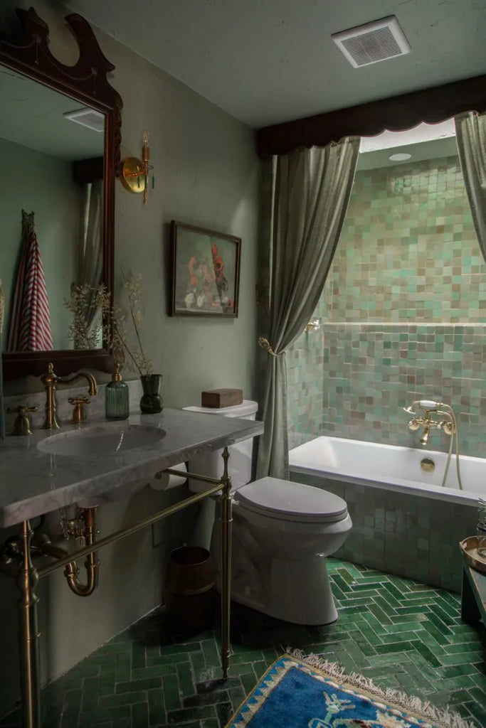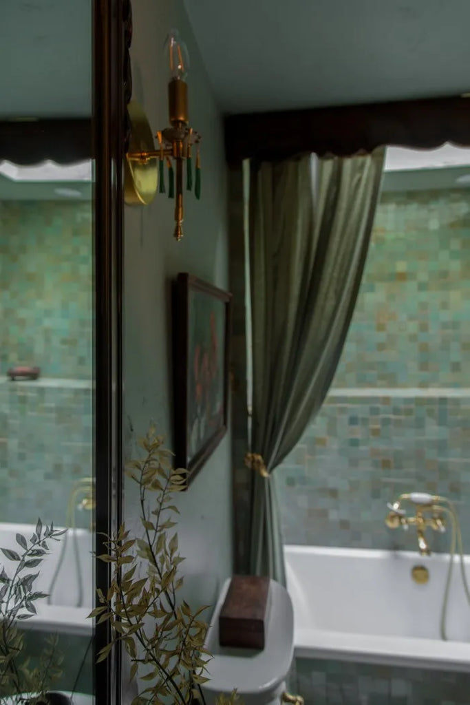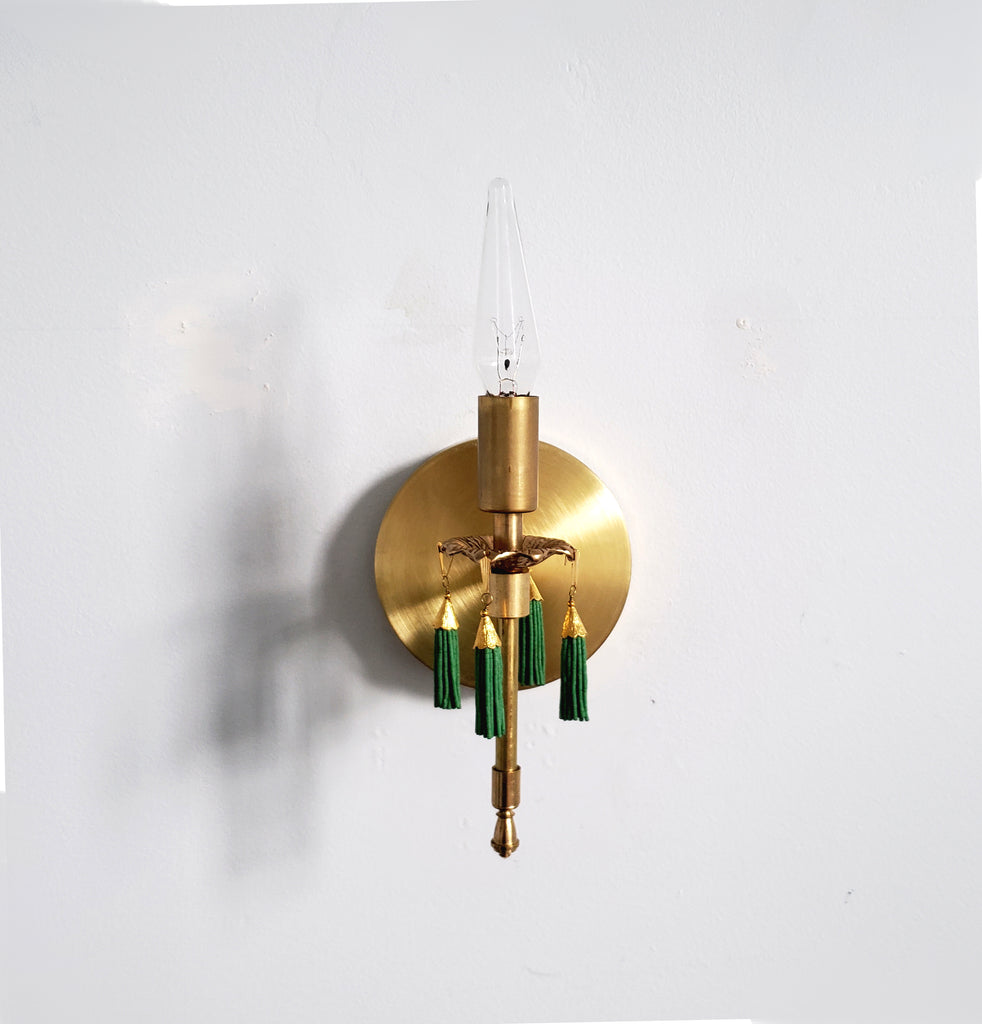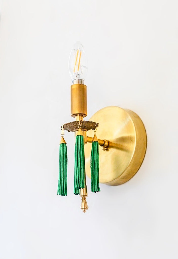 A romantic, Victorian inspired brass sconce with green beaded tassels and cast brass bobeches.  This is perfect as accent lighting for a hallway, fireplace, or small powder room.  Additional tassel colors may be available upon request, contact us to see what can be sourced.