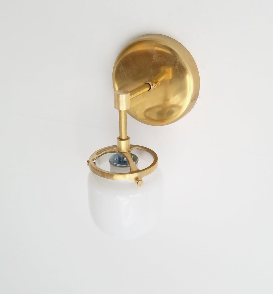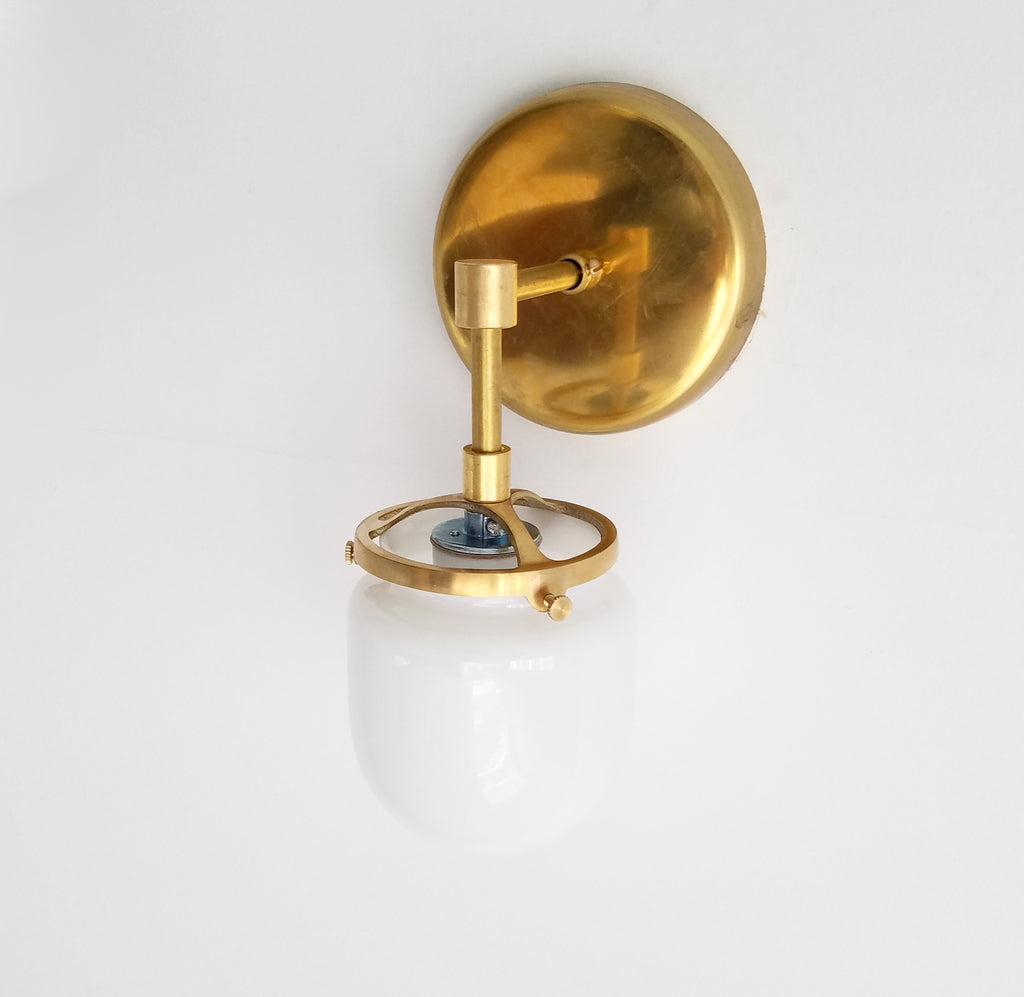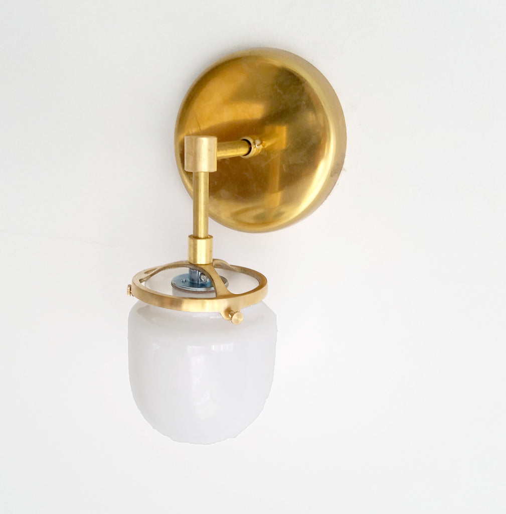 The nautical-inspired West End Sconce is composed of one standard-sized socket with a glass bulb cover.  There are three finish options that each have their own look.  The classic, raw brass finish keeps things simple but interesting.  The matte black finish will instantly modernize your space, and chrome finish works perfectly as a transitional piece that can add a modern touch to an otherwise traditional space.  We love the Single West End Sconce flanking a bathroom mirror or lined up in an entry. The fixture is composed of one standard-sized E26 sockets.