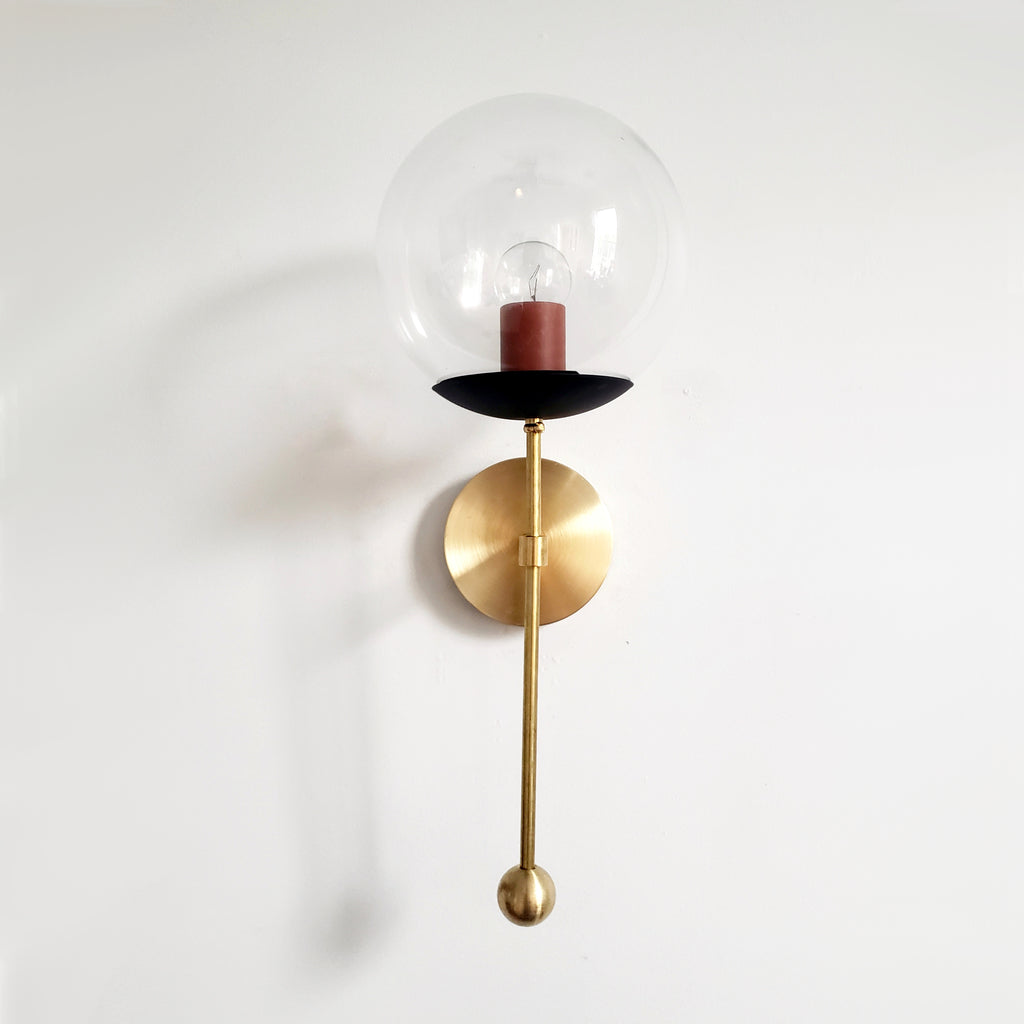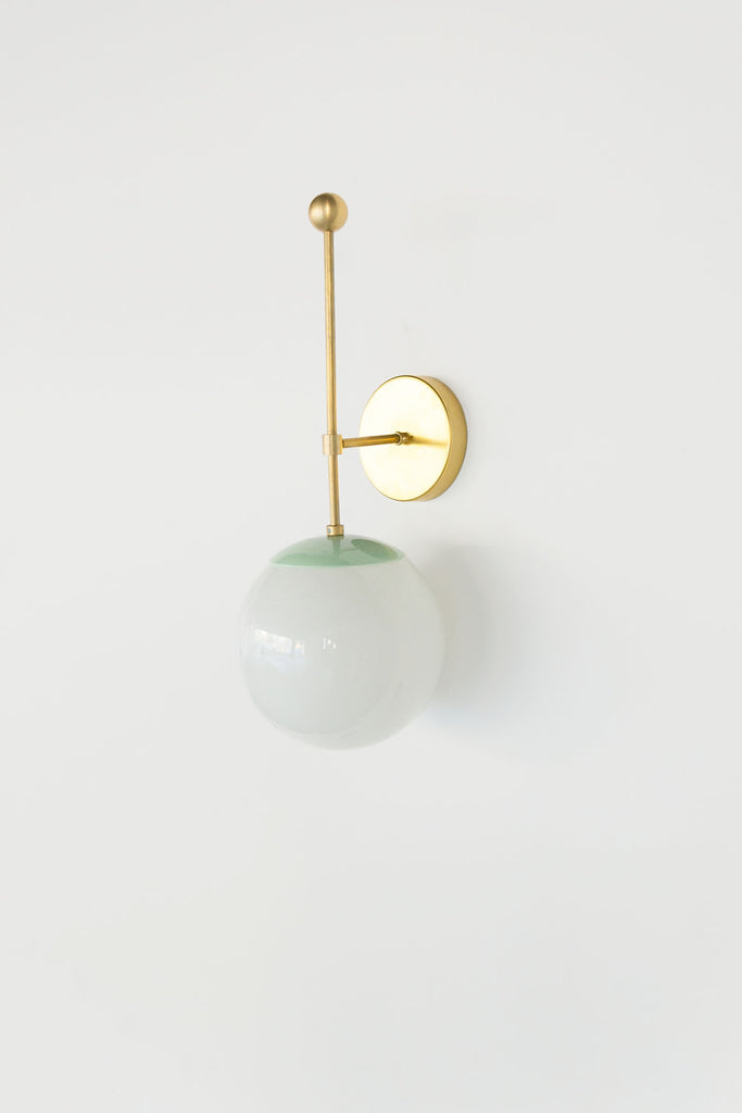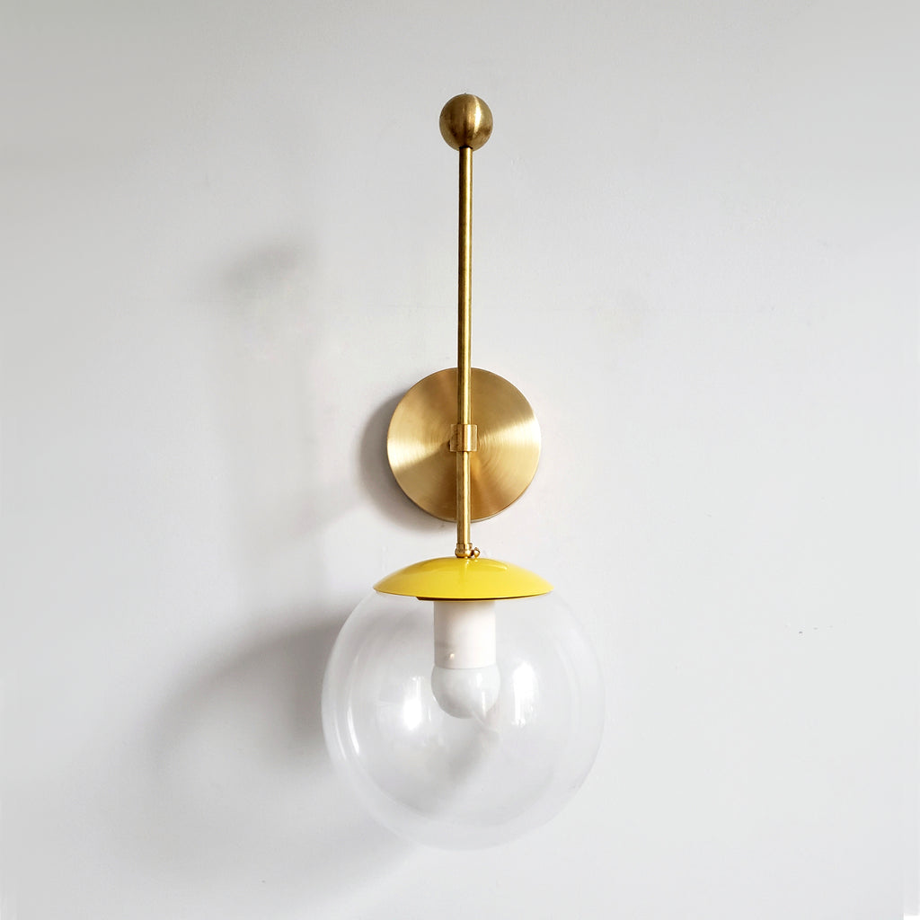This modern fixture is simple with a touch of whimsy because of its oversized brass ball and its oversized glass shade. The Verbena Sconce is the perfect way to dress up a bathroom, dining room, or casual nook.