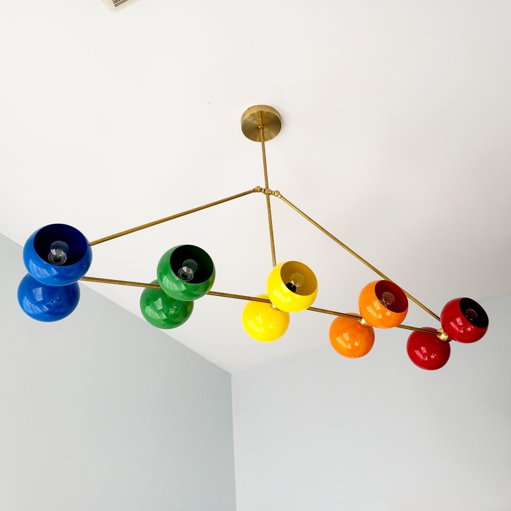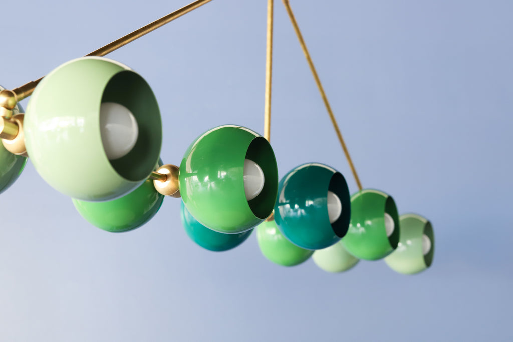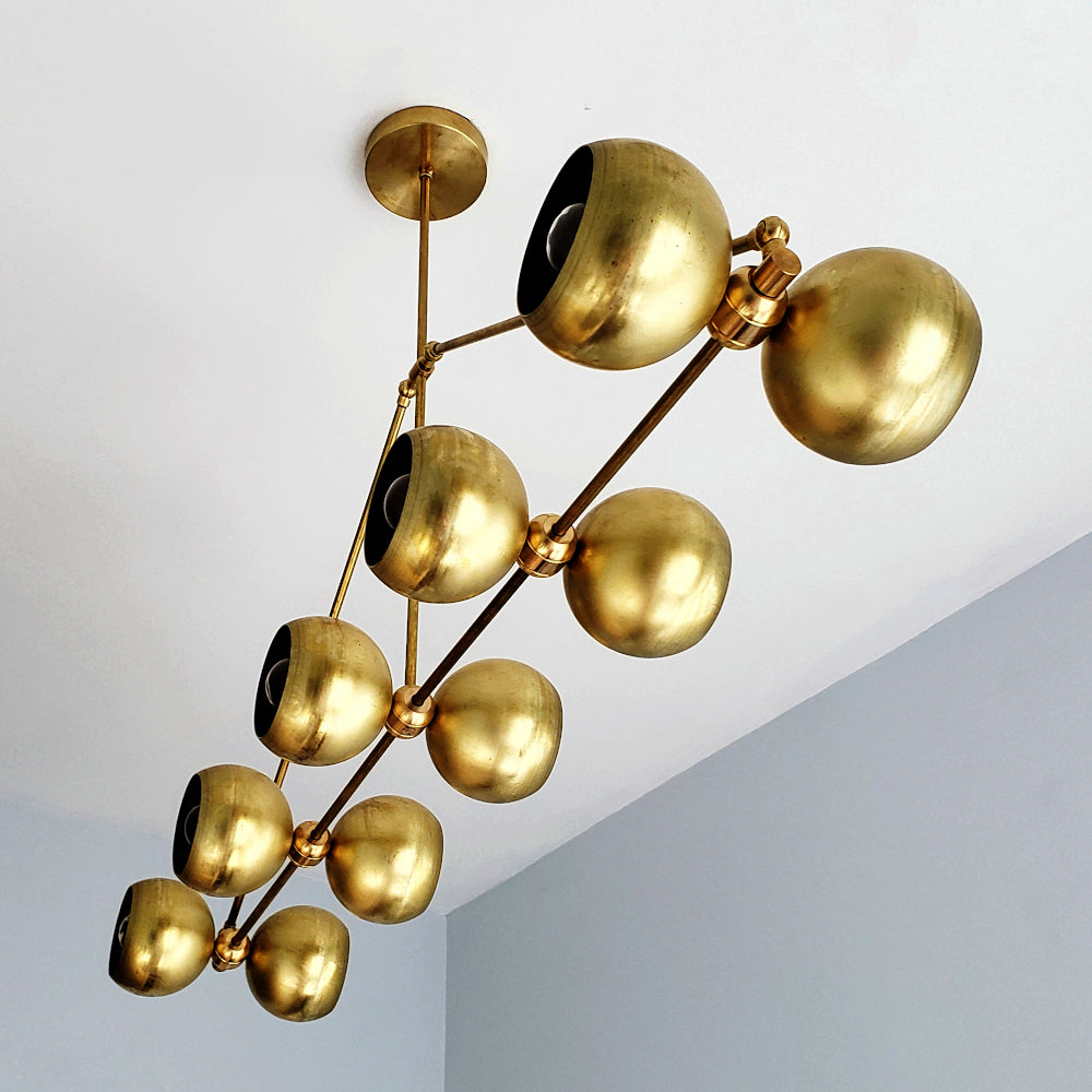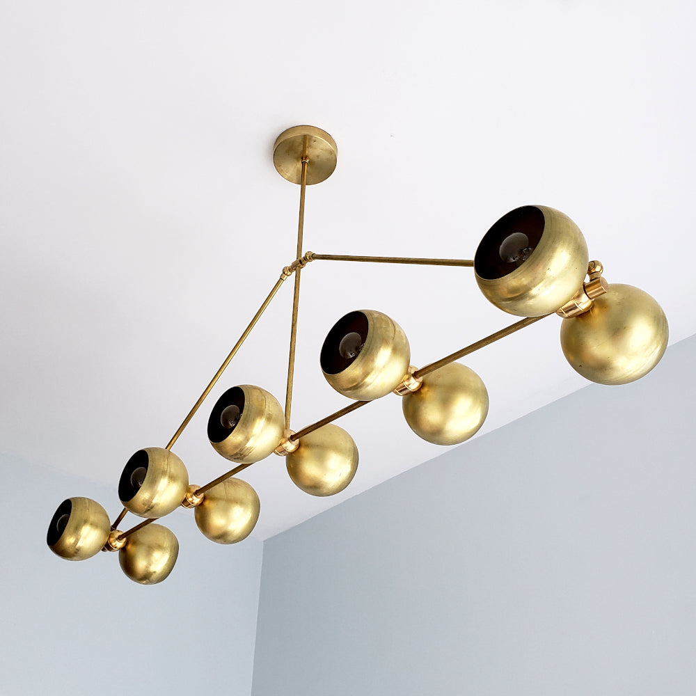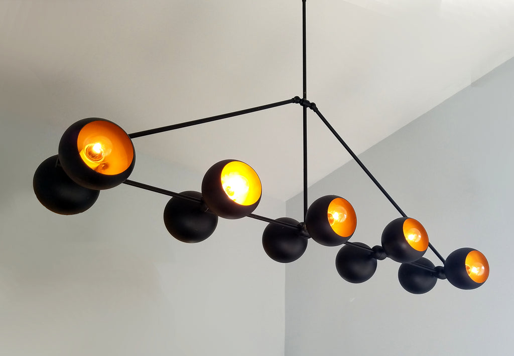 The Tchoup-10 Chandelier is inspired by linear Italian mid-century fixtures and the "hidden shortcut" connecting uptown all the way to downtown New Orleans. The design is updated with its modern finishes and scale. With ten E26 or medium base sockets, this light can be either bright or seductively moody, depending on the bulb chosen. In our black and brass version, we love seeing the contrasting brass interiors of the shades glow when the fixture is turned on.